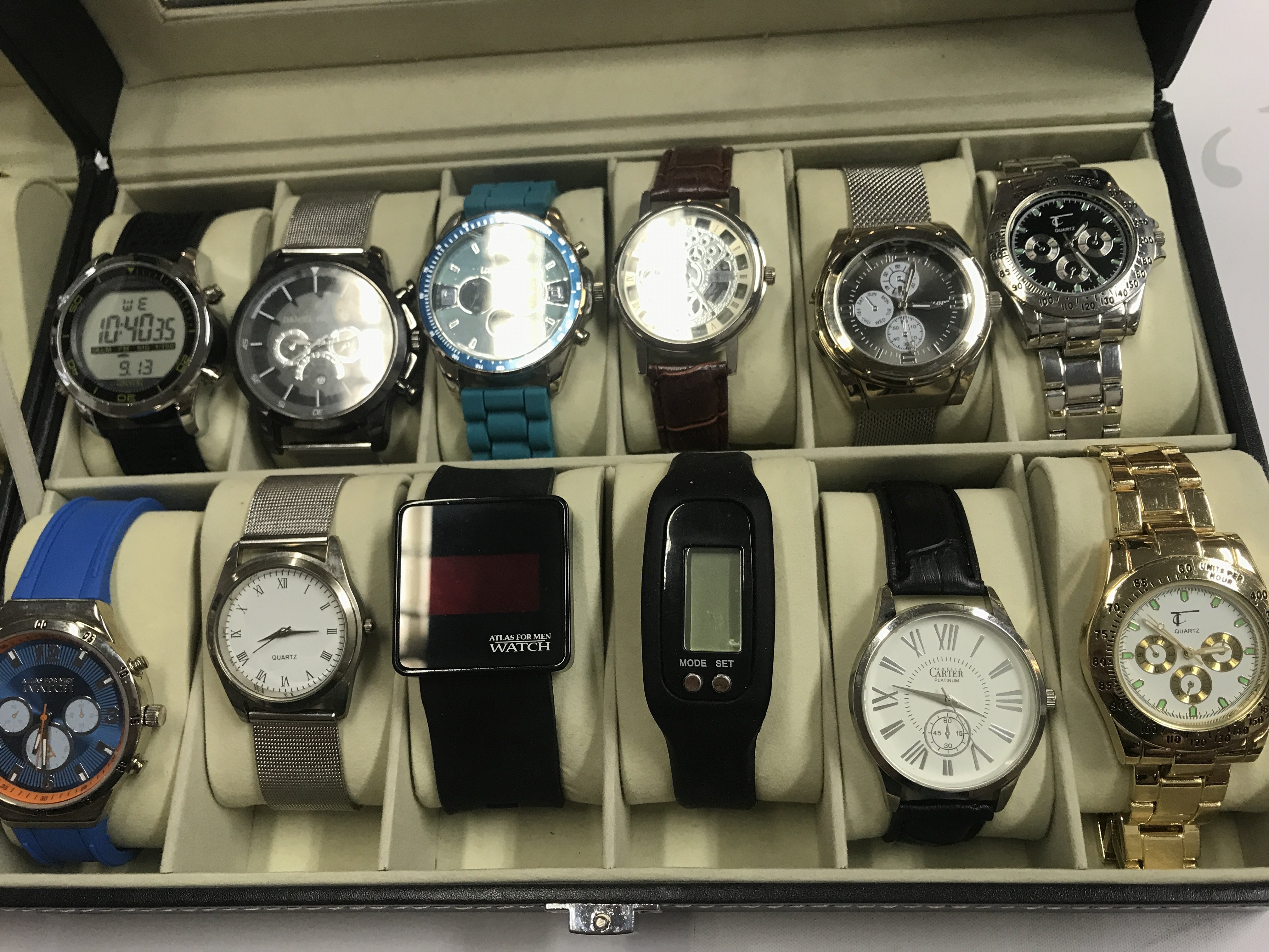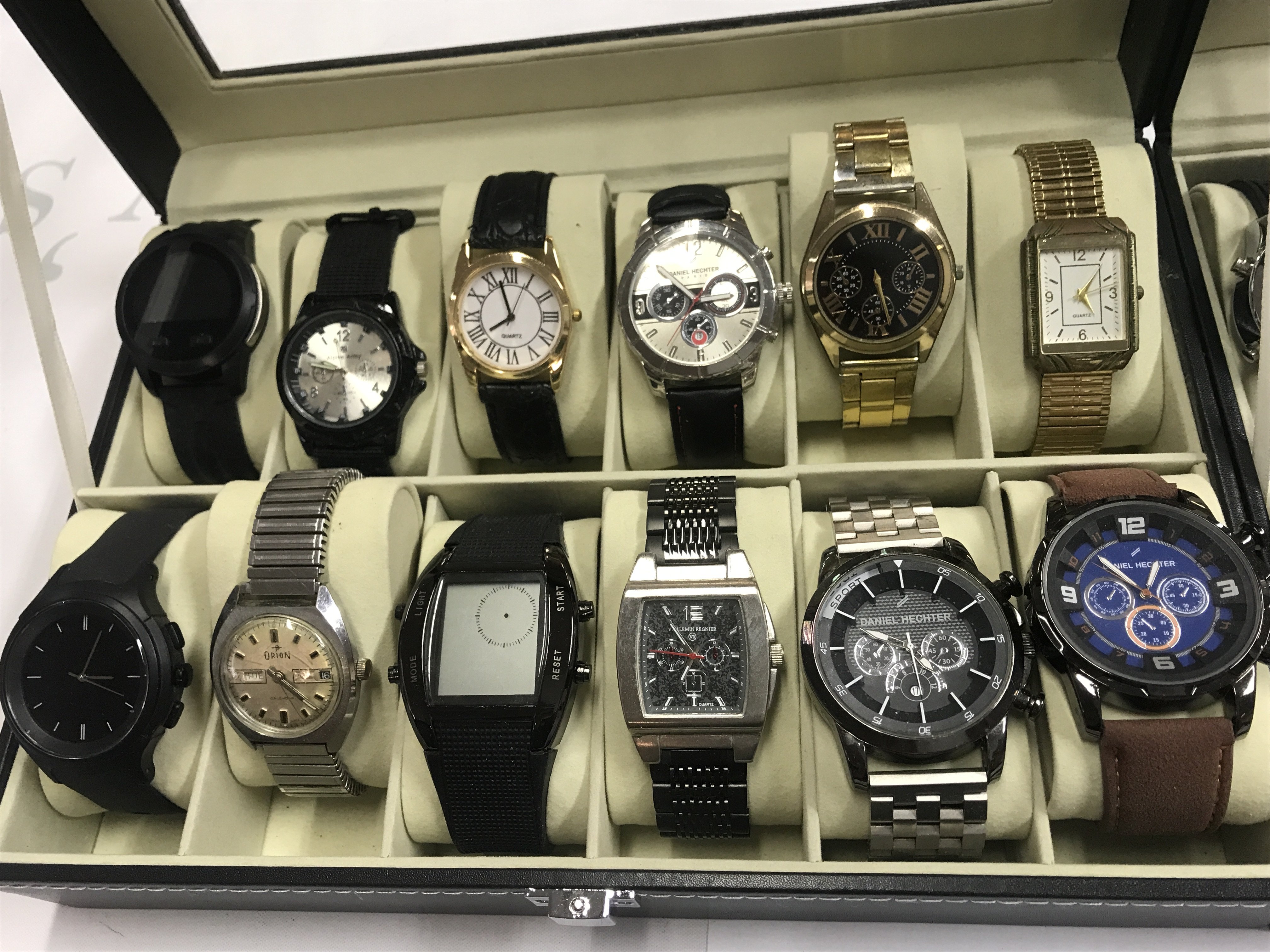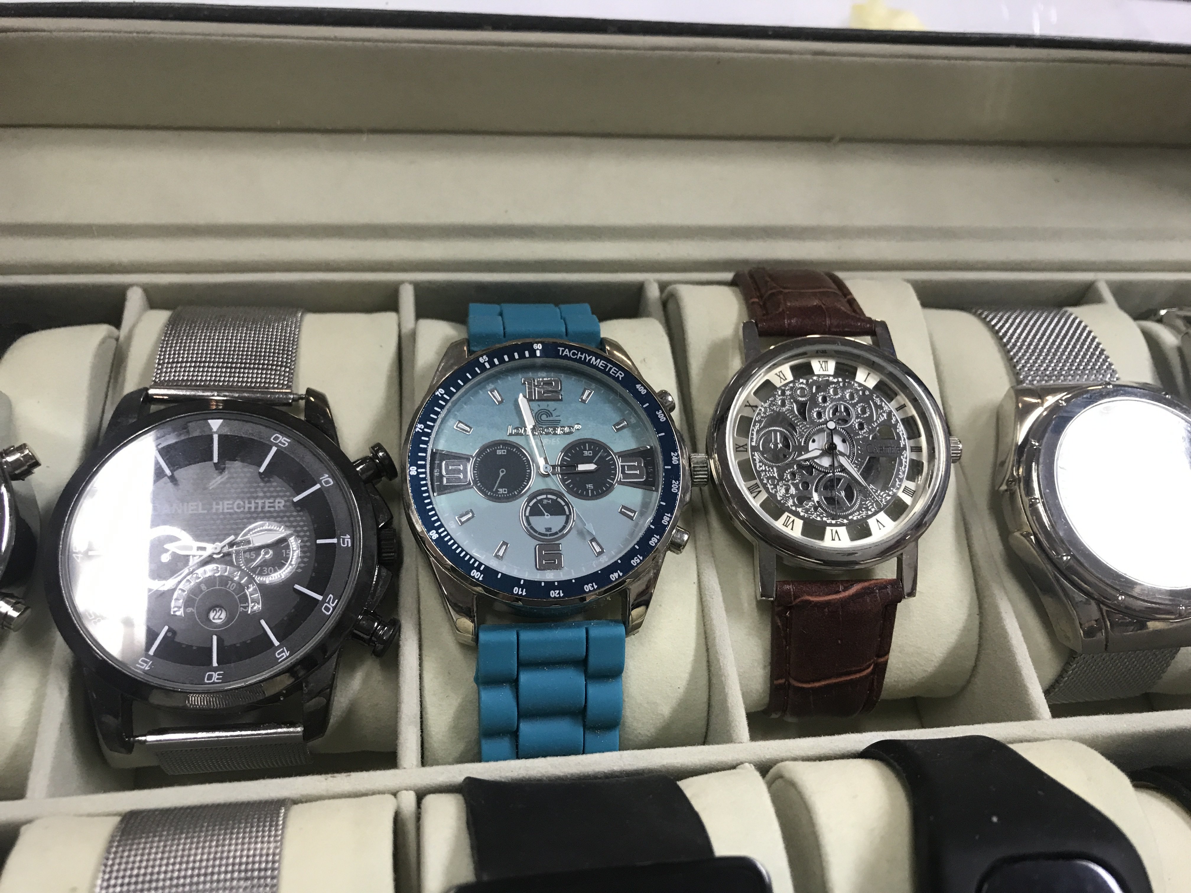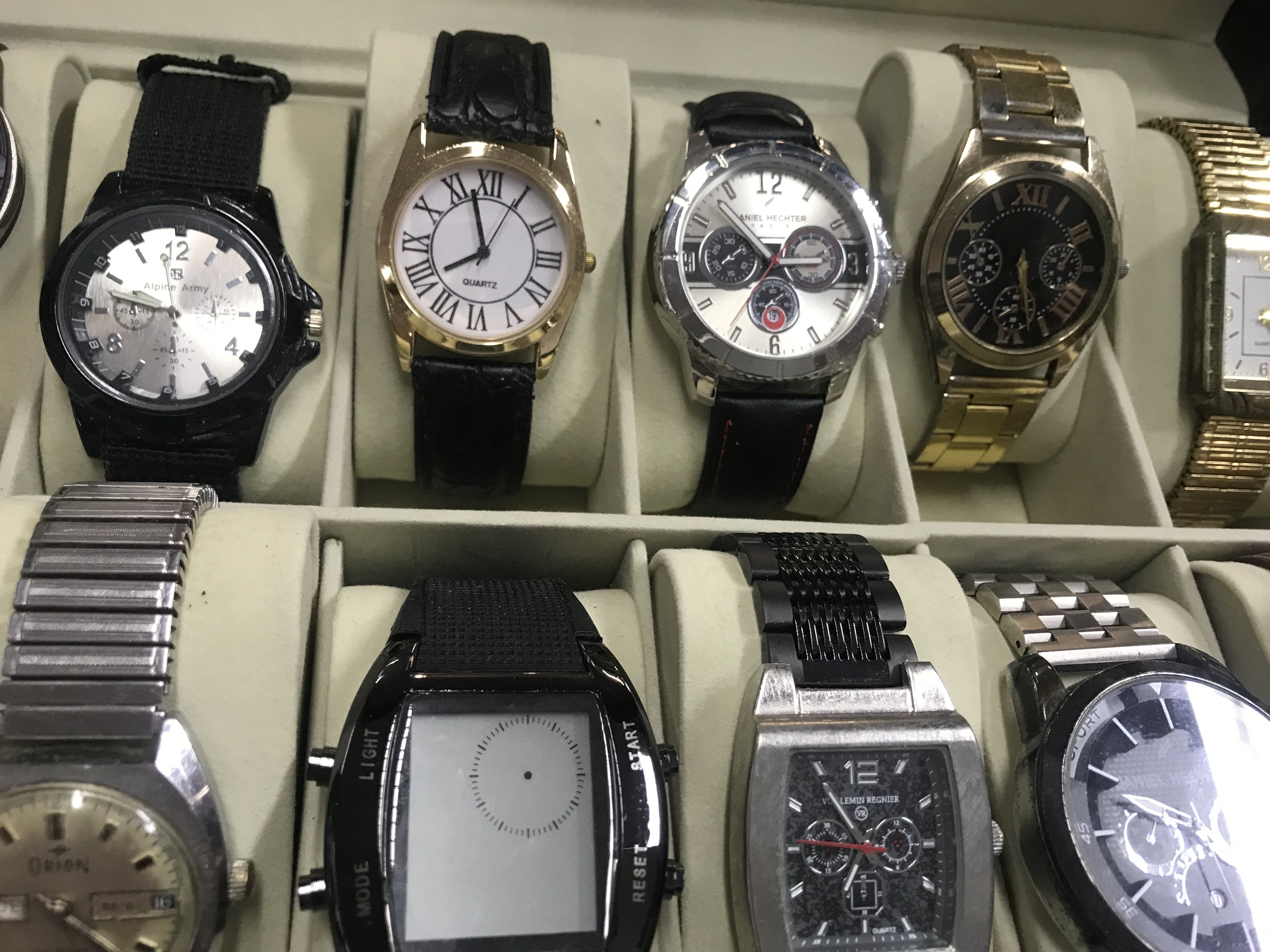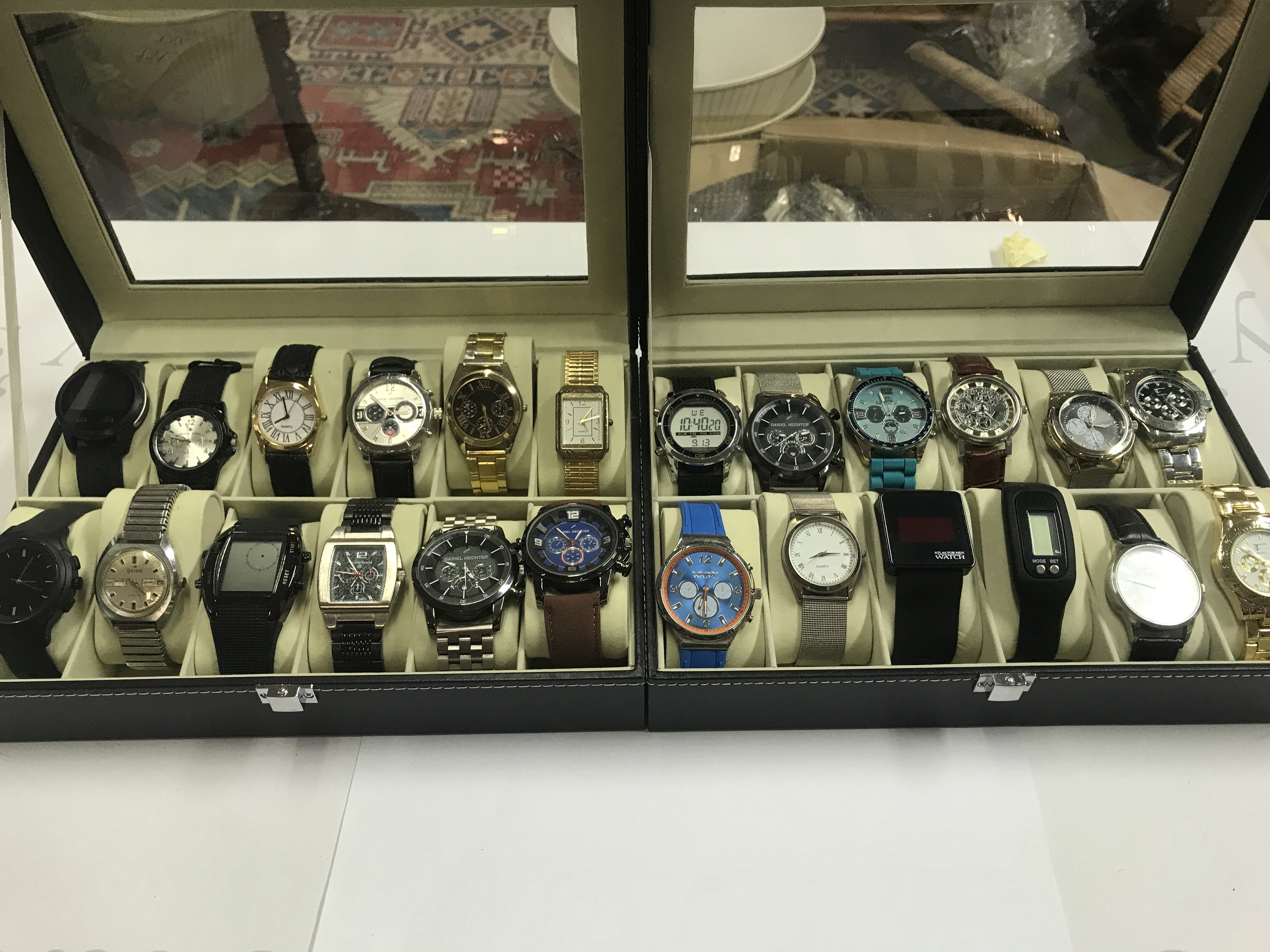 Two watch boxes containing a collection of assorted dress watches including Daniel Hechter Orion etc. Postage B