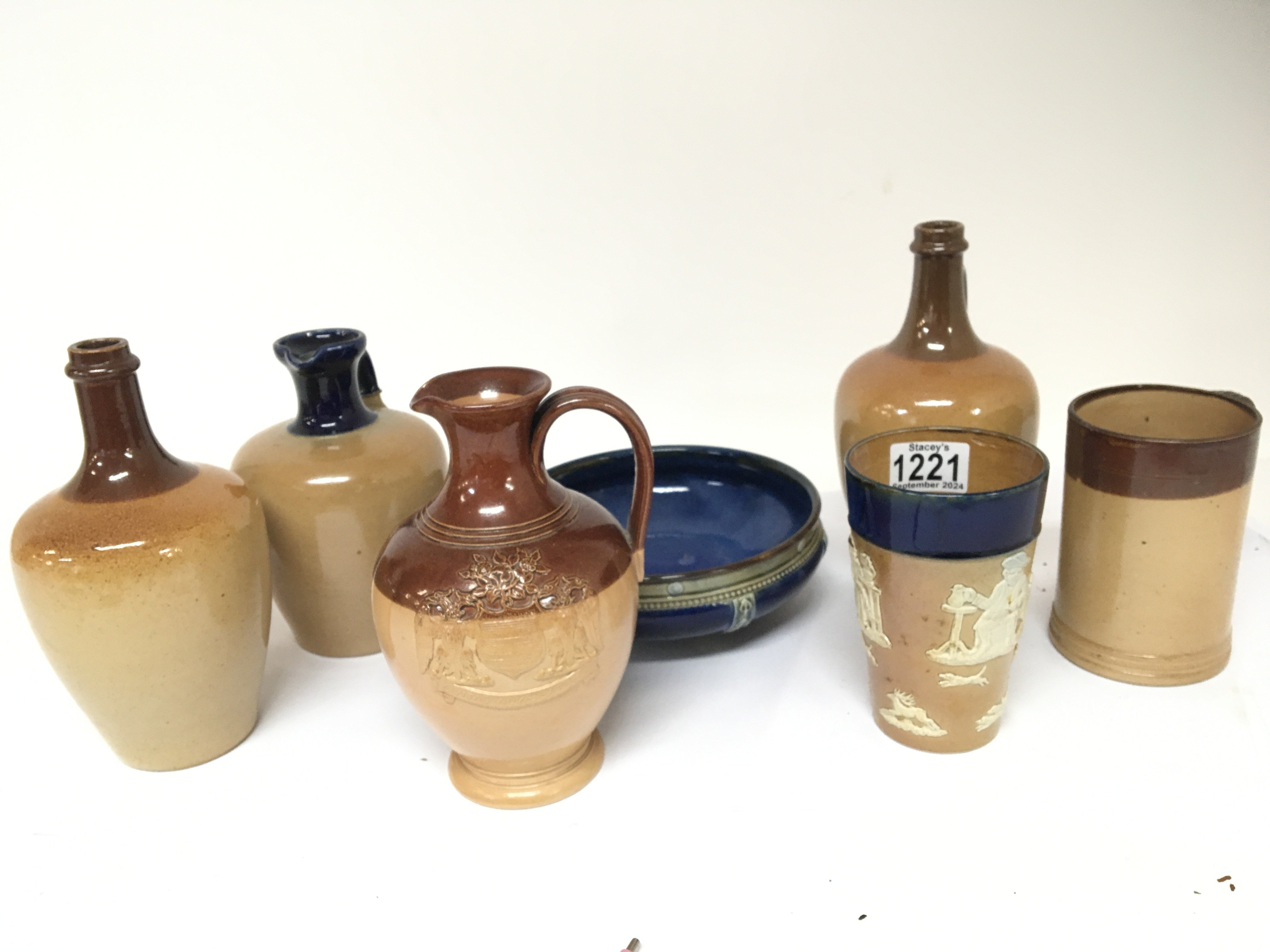 A collection of Royaland Lambeth Doulton stoneware ceramics bottle vases including a copy of the Salisbury jug a blue glazed dish and a beaker and others no obvious damage.