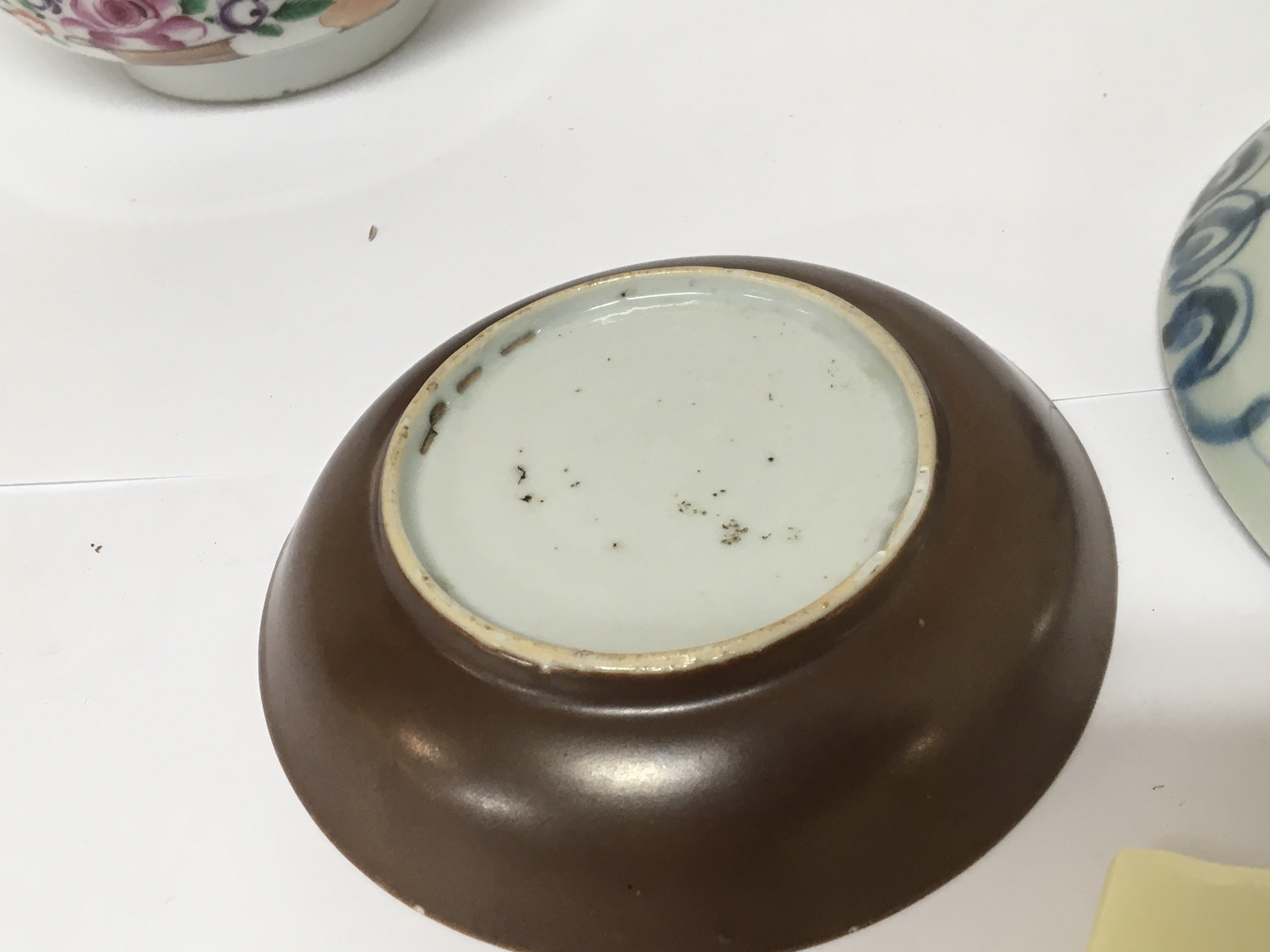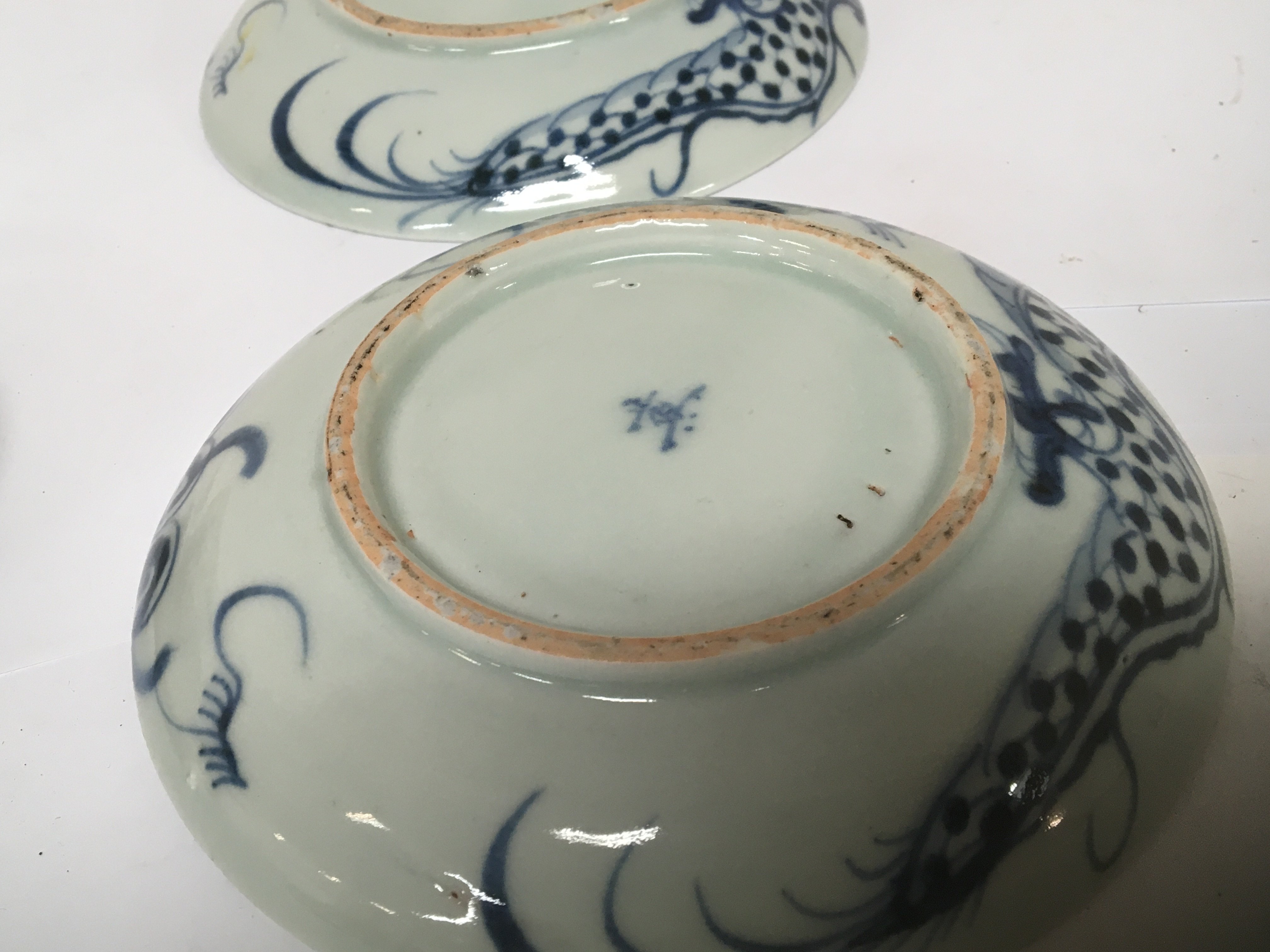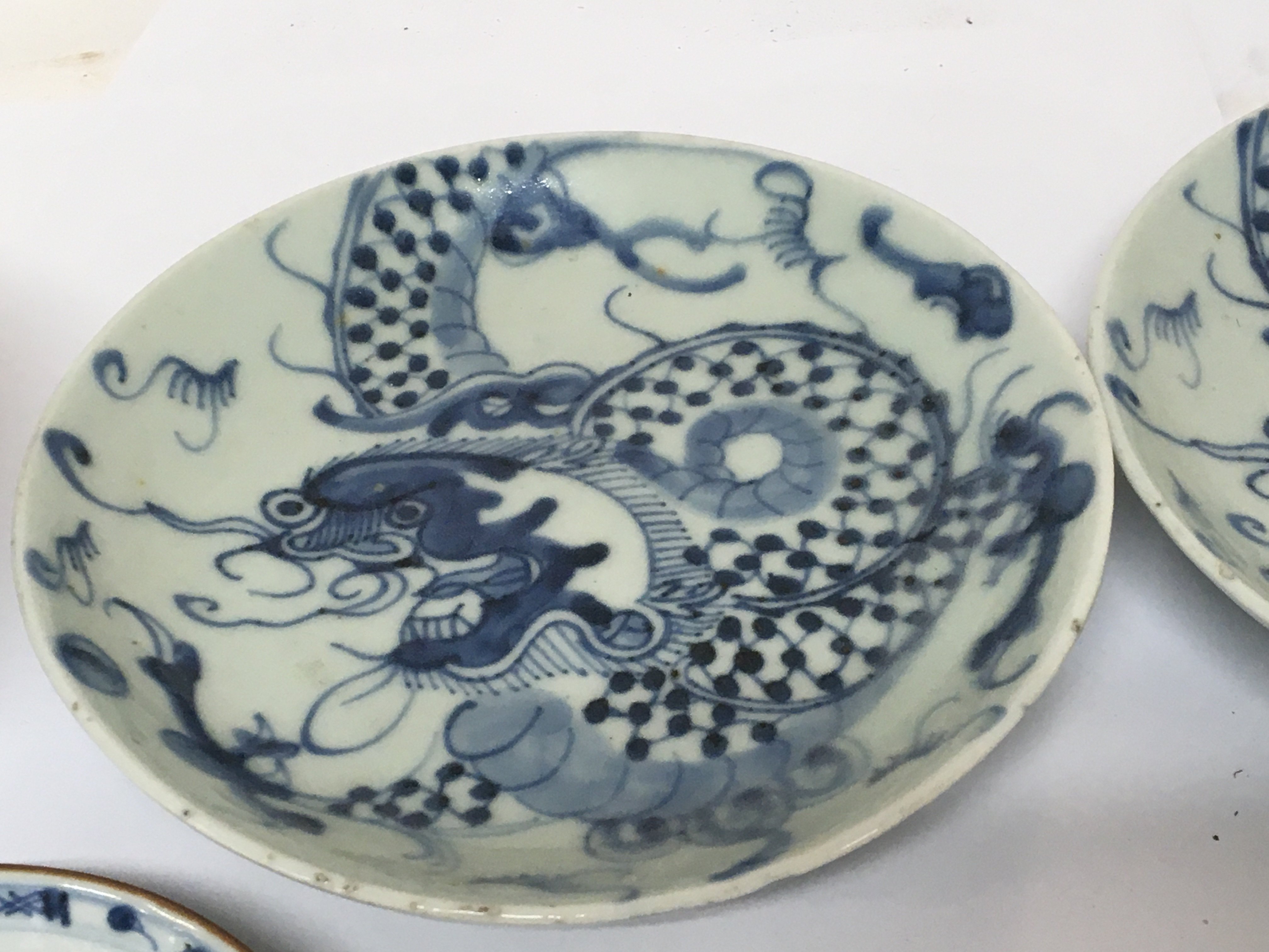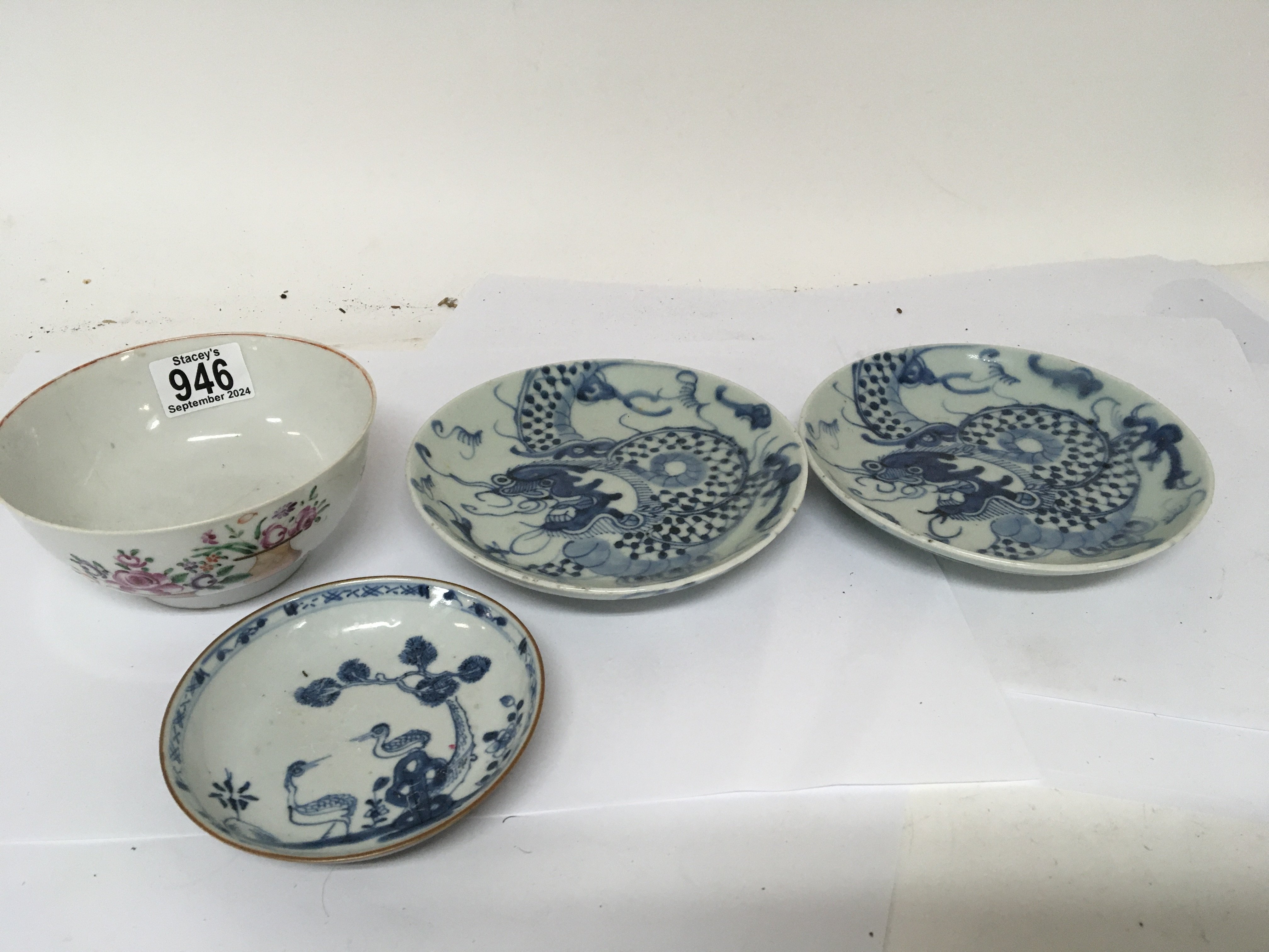 Two Chinese export porcelain dishes decorated with dragons a small 18th century dish and rice bowl (4).