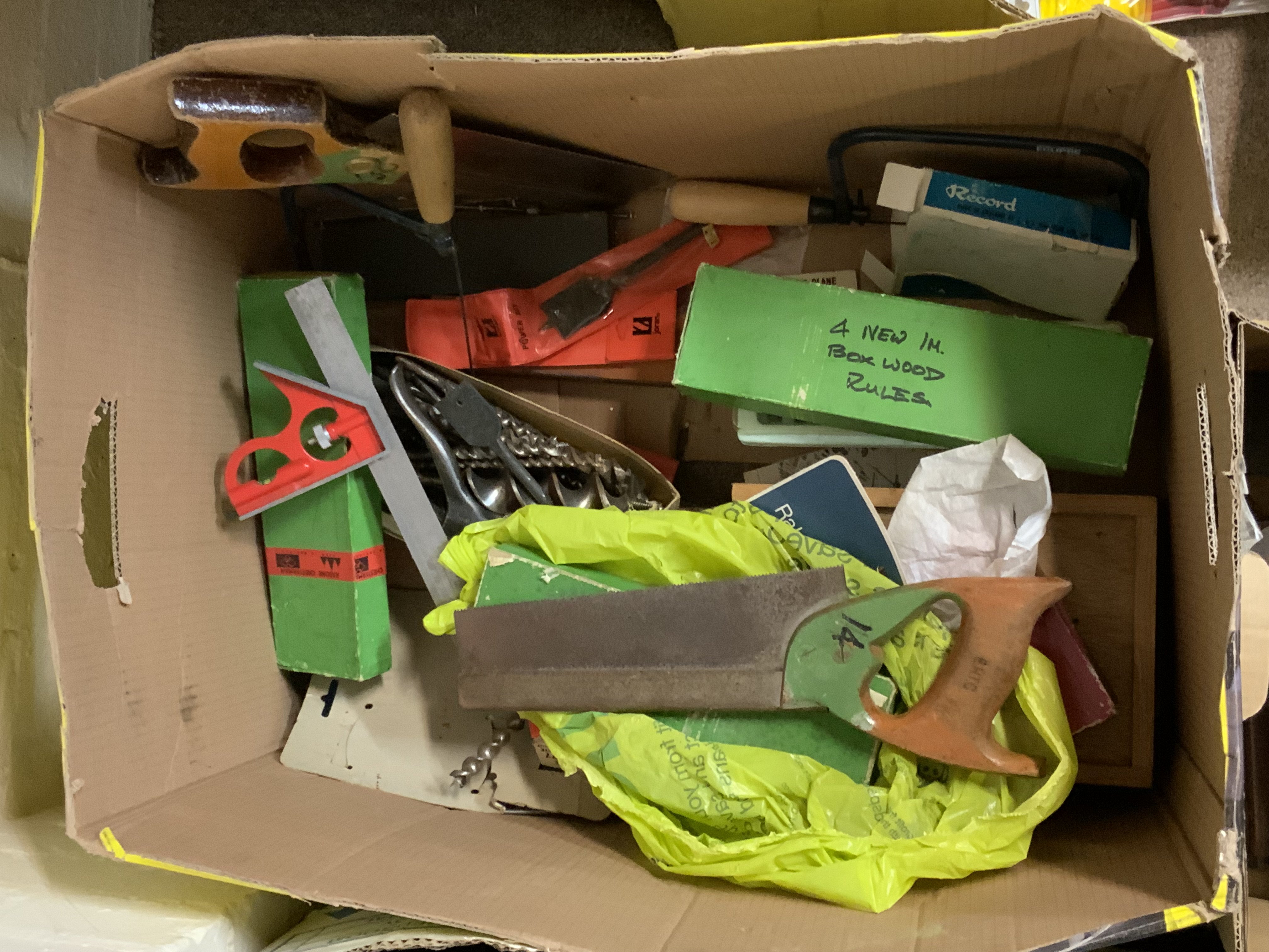 A collection of mixed carpentry tools including Marples chisels set squares. (D)