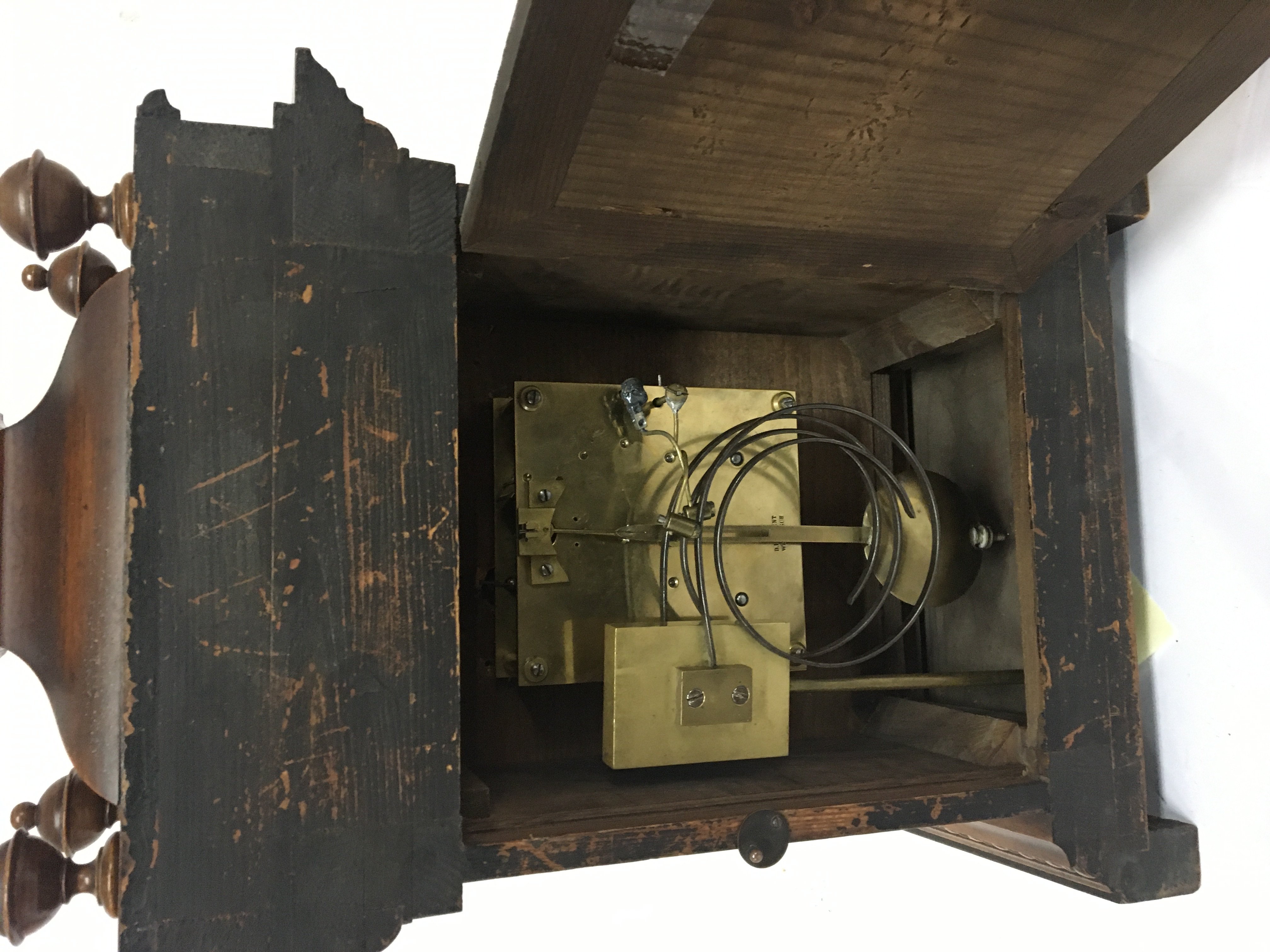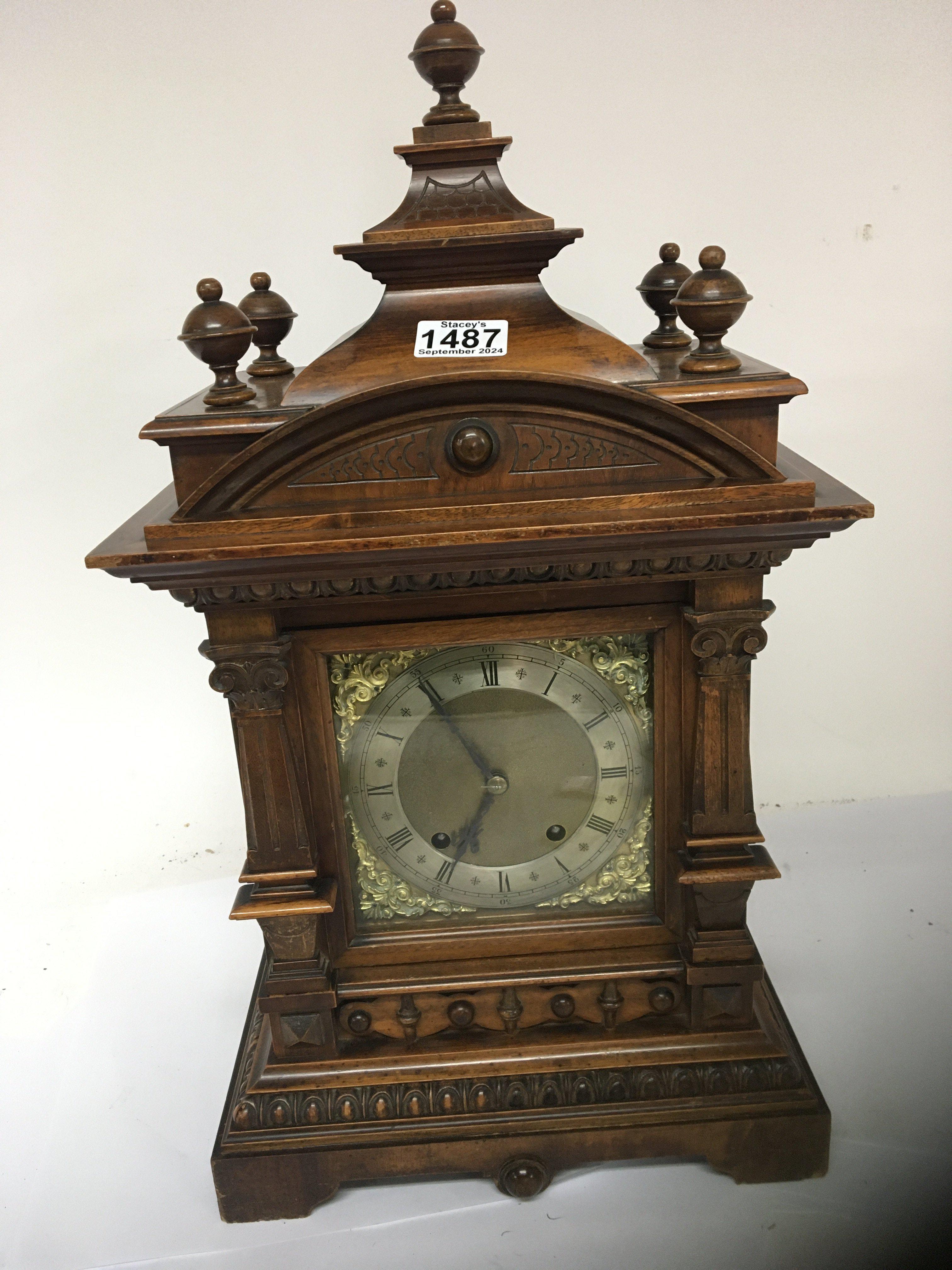 A Quality walnut boardroom or large mantel clock with a silvered dial. 56cm high.