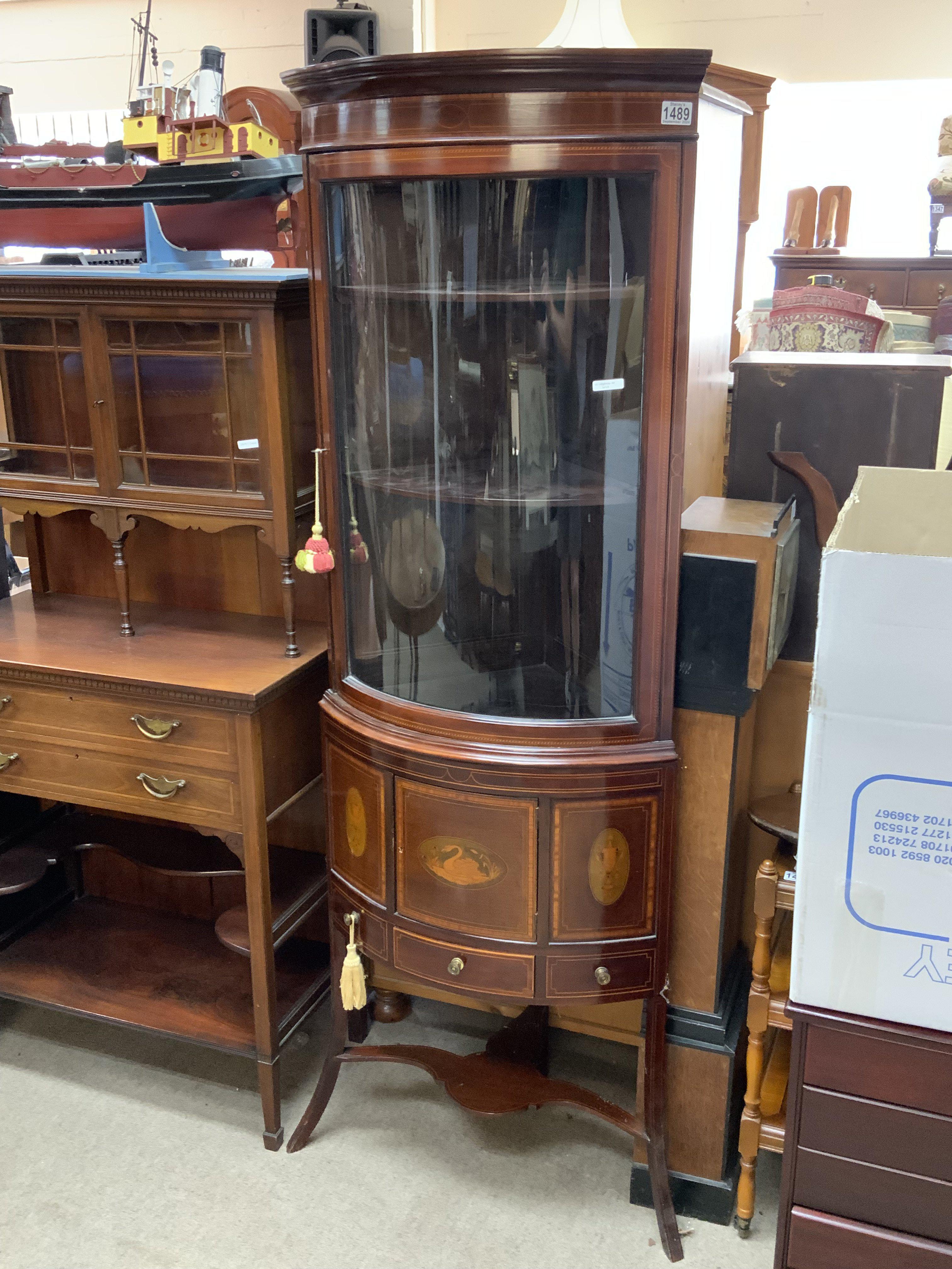 A good quality Edwardian inlaid glazed corner cabinet with sorrento style inlay, H170cm x W59cm.