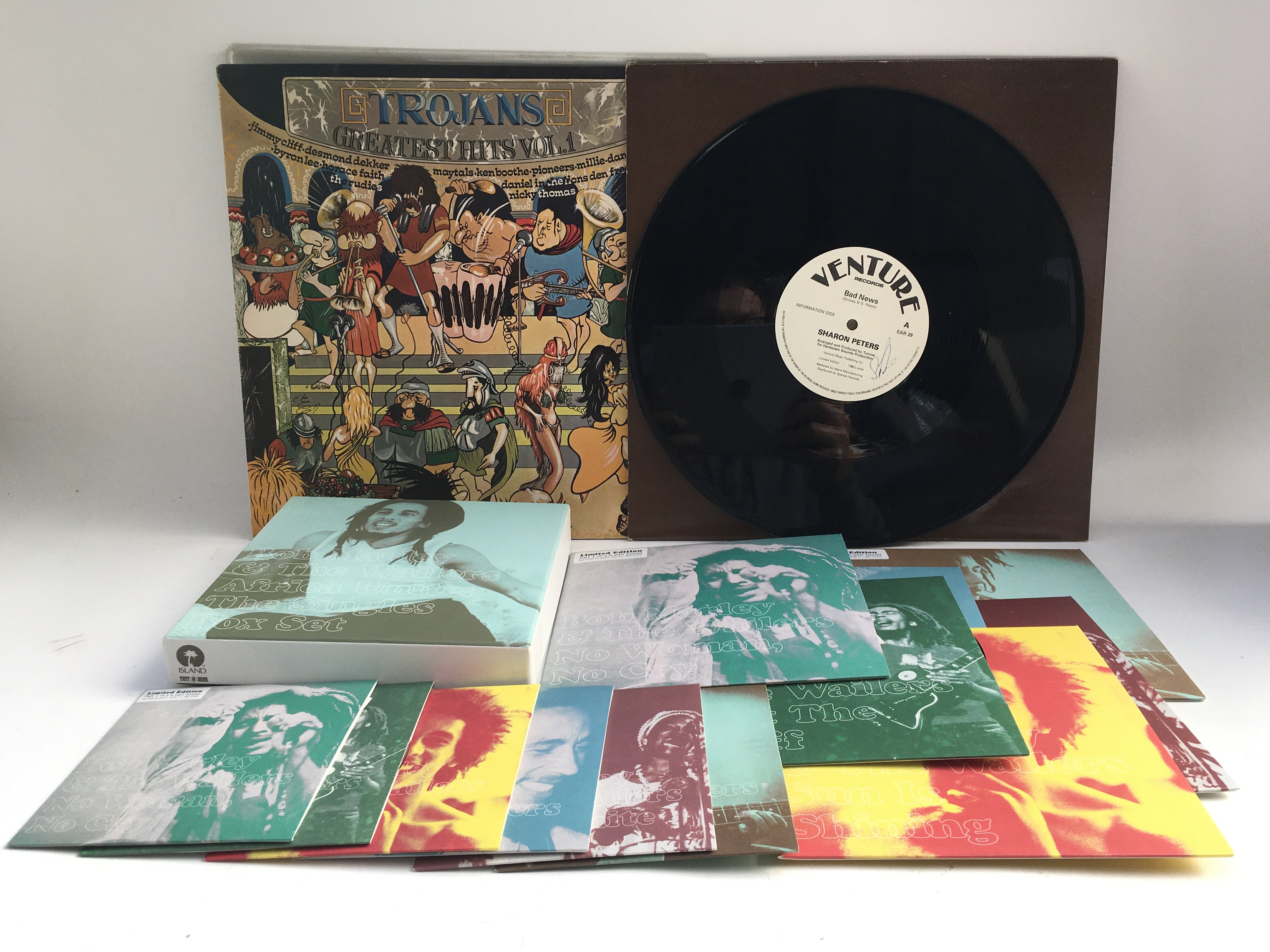 A Bob Marley limited edition 7" singles and multi CD box set plus a signed Sharon Peters 12" single and a Trojan records 'Greatest Hits' LP (3).