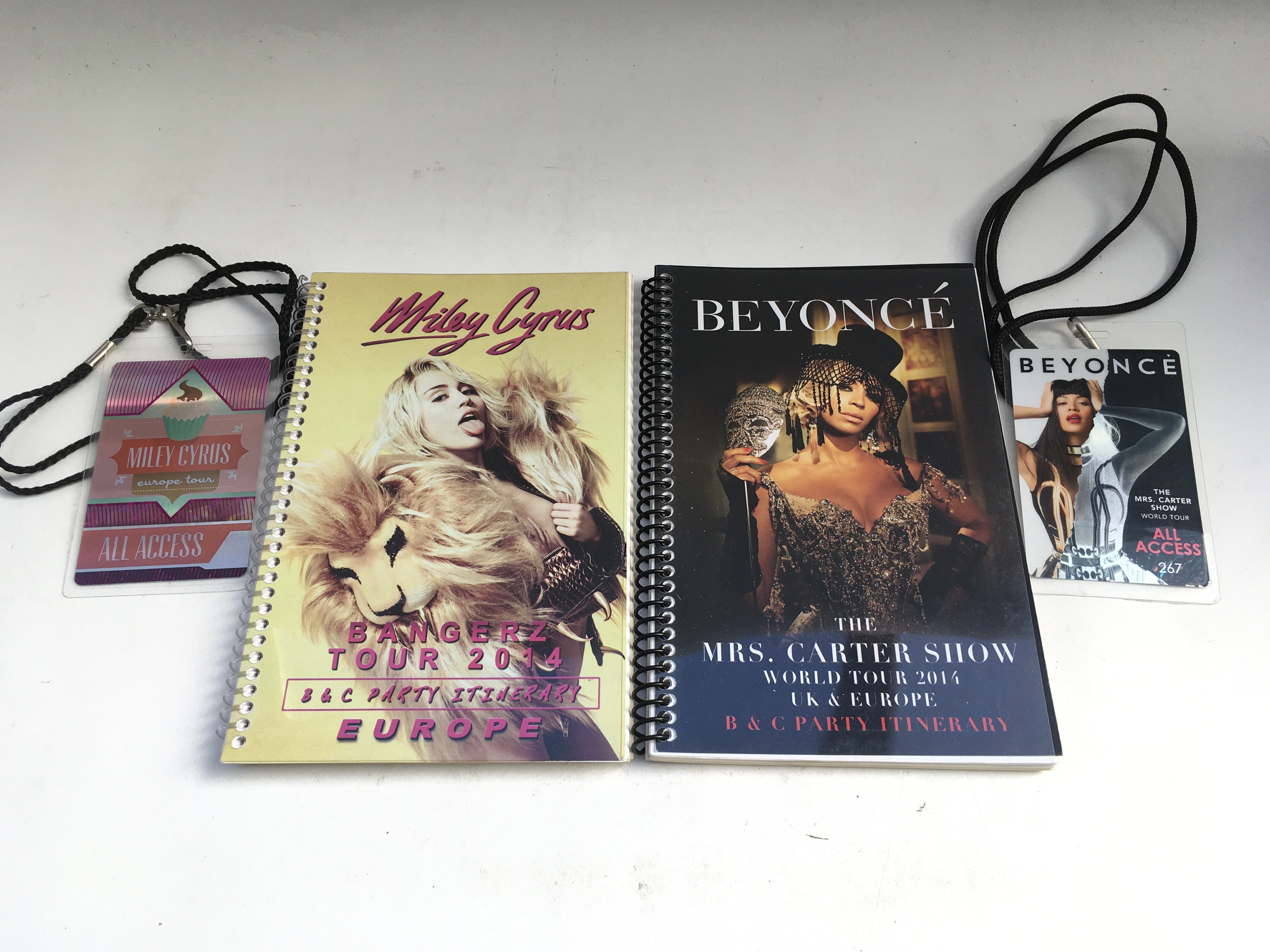 A Beyonc̩ World Tour 2014 tour itinerary booklet and all access tour laminate plus a Miley Cyrus 2014 European tour itinerary booklet and all access tour laminate.