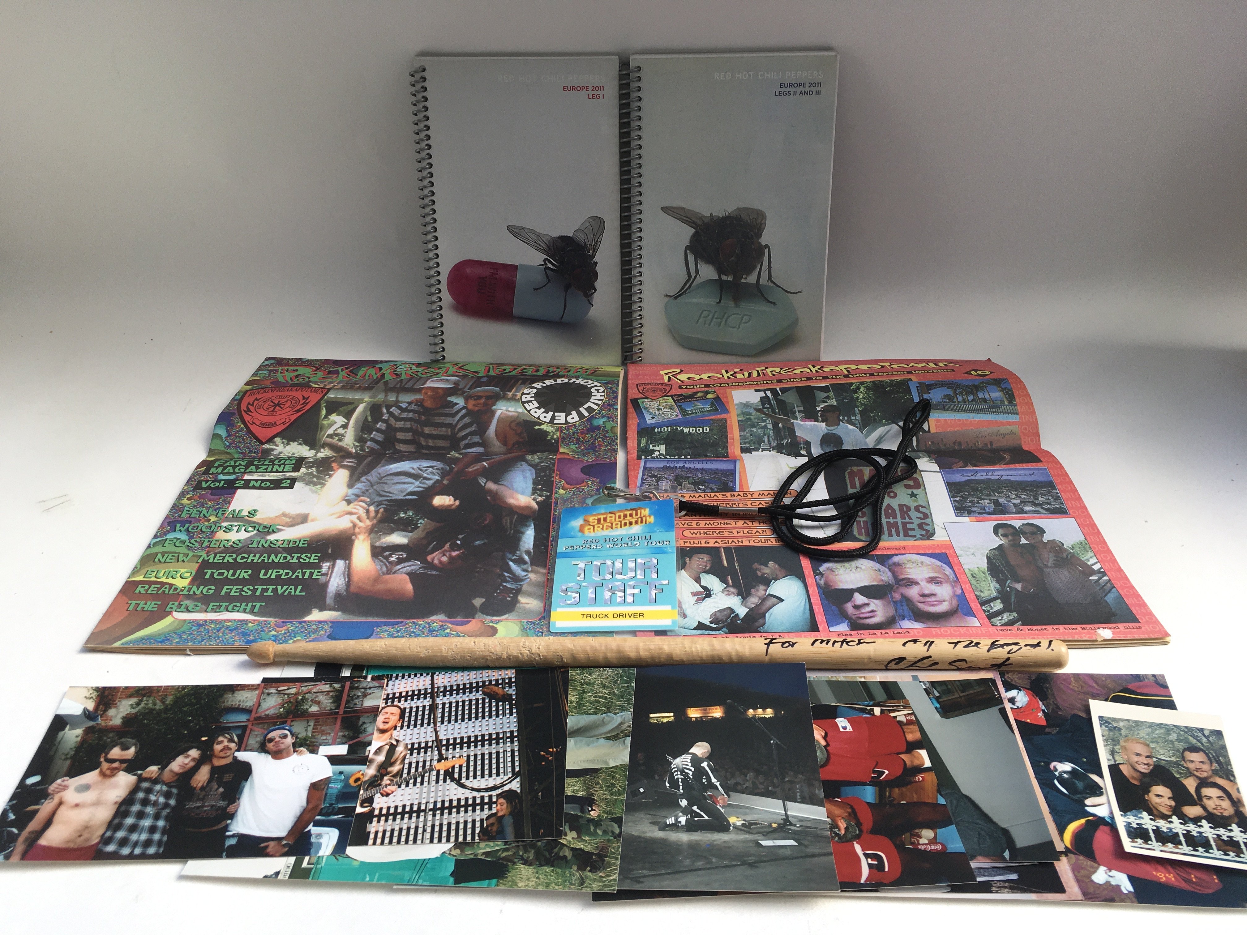 A collection of Red Hot Chili Peppers ephemera including a unique collection of photographs given to the vendor by Anthony Keidis' father, a stage used drumstick signed by Chad Smith, All access tour laminate, tour itinerary booklets and other items. The vendor was a truck driver for their European tours in 2006-2011. Further provenance available upon request.