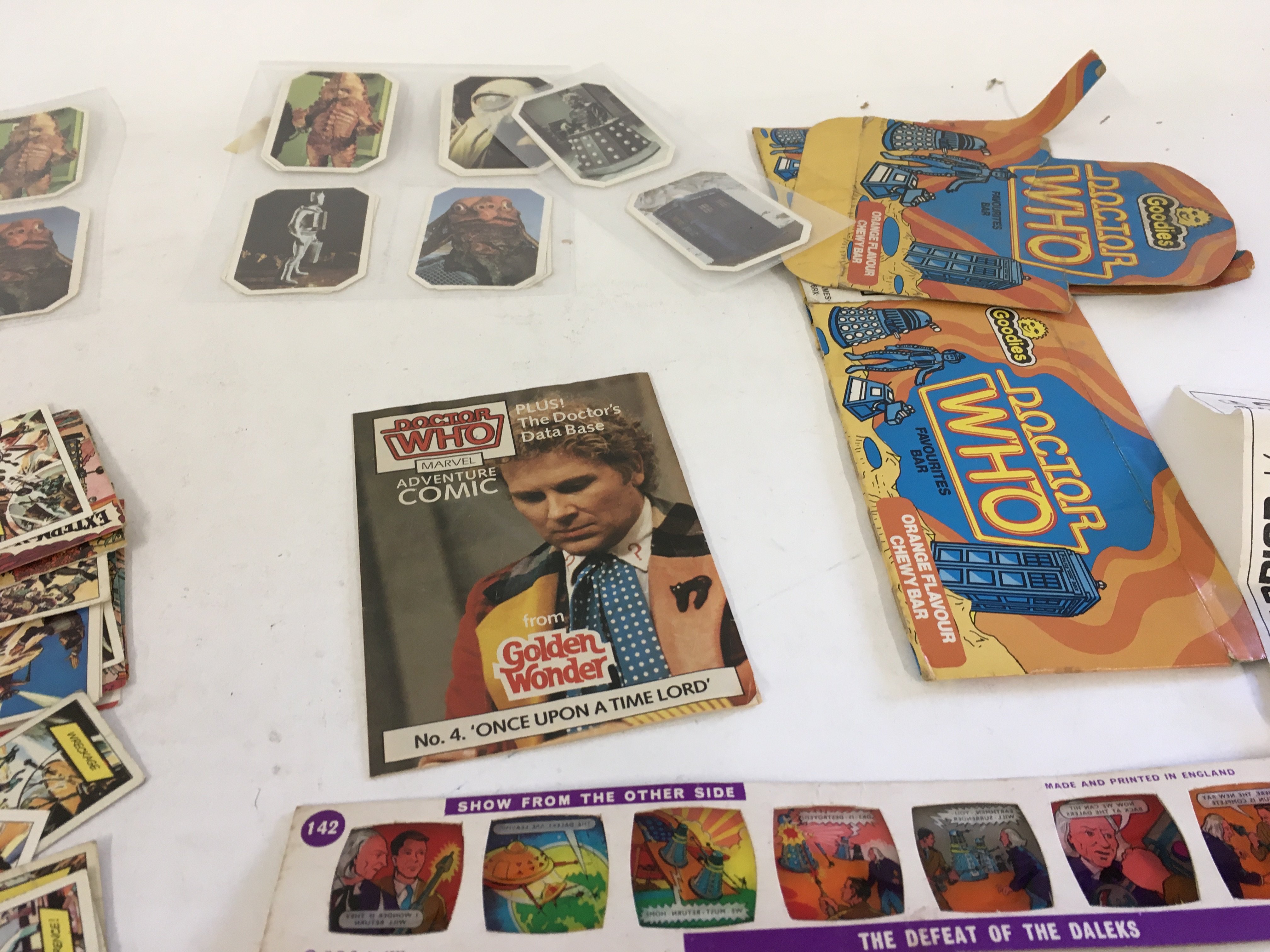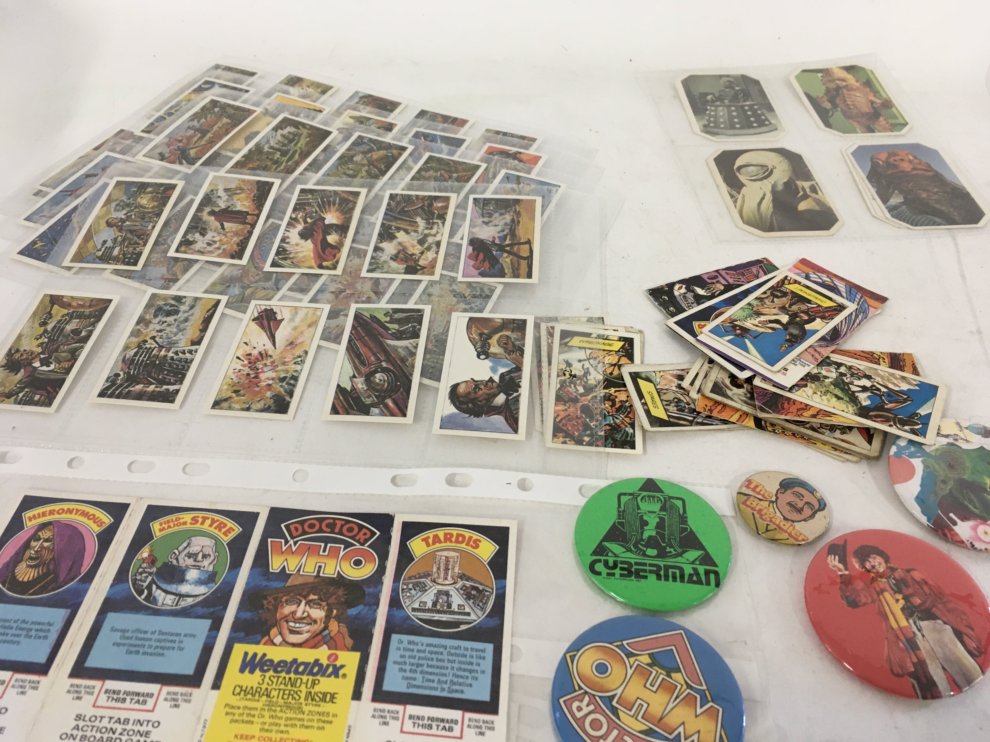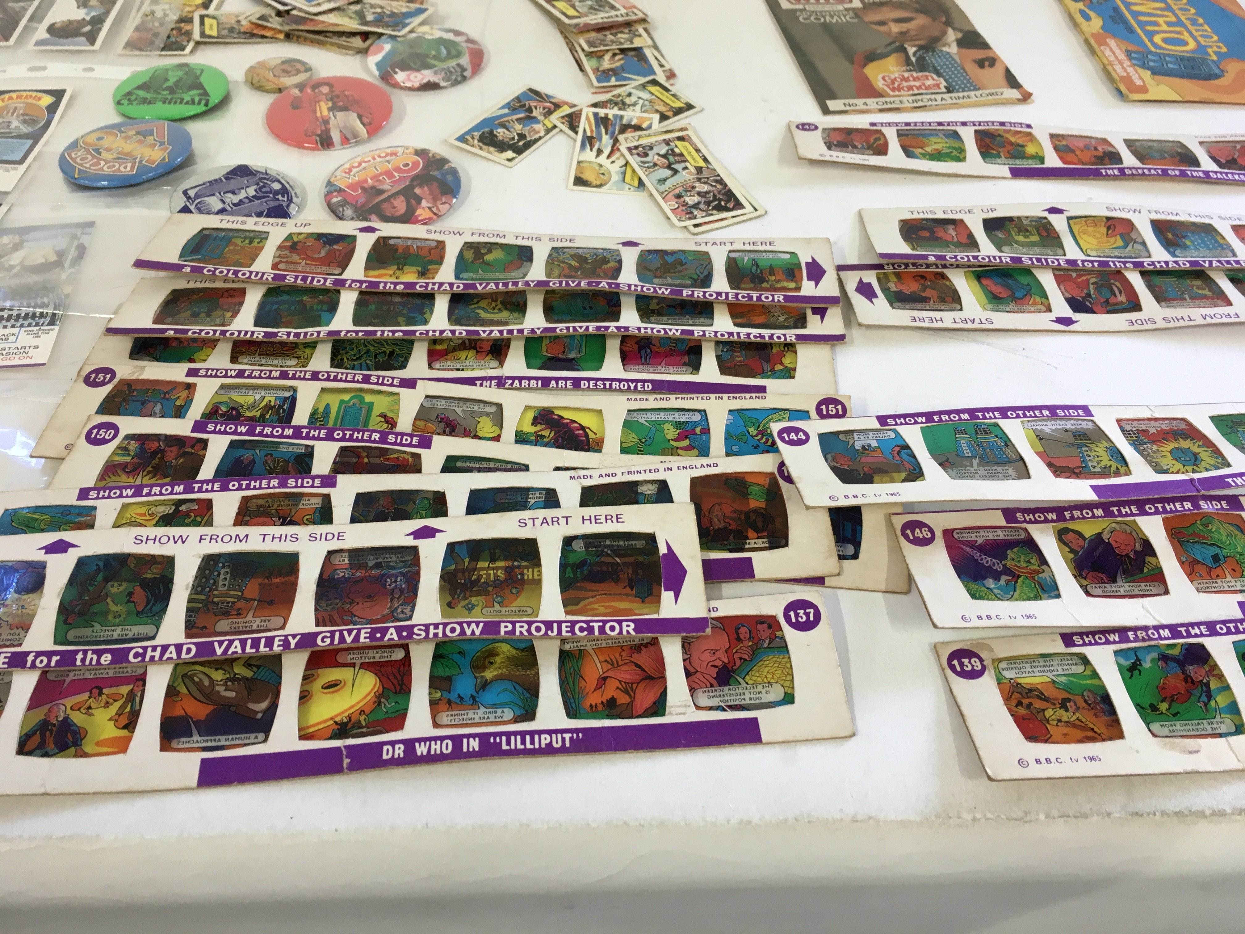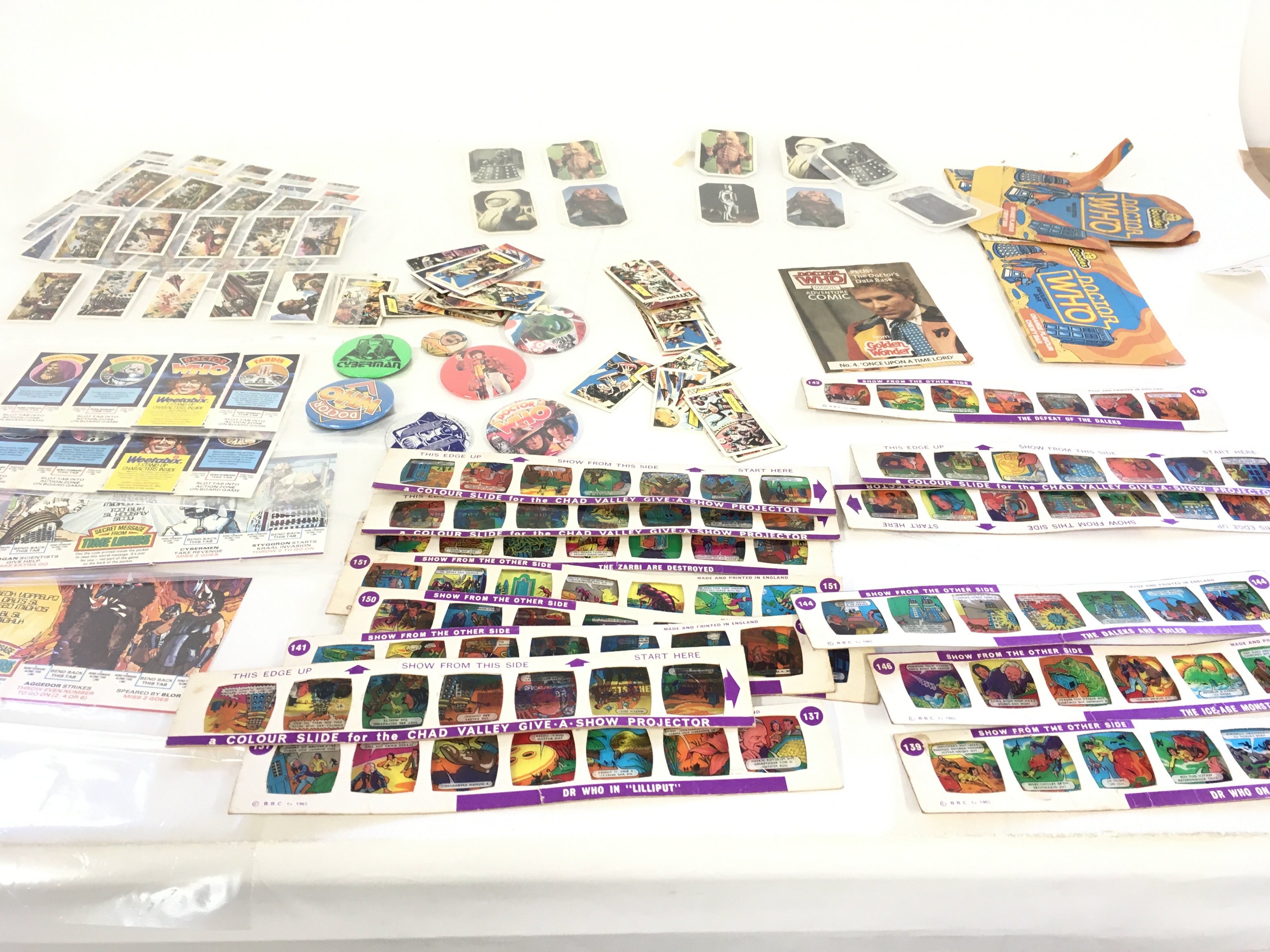 A collection of Dr Who pieces including Chad Valley picture slides for Give A Show..weetabix stand up card figures..badges and cards