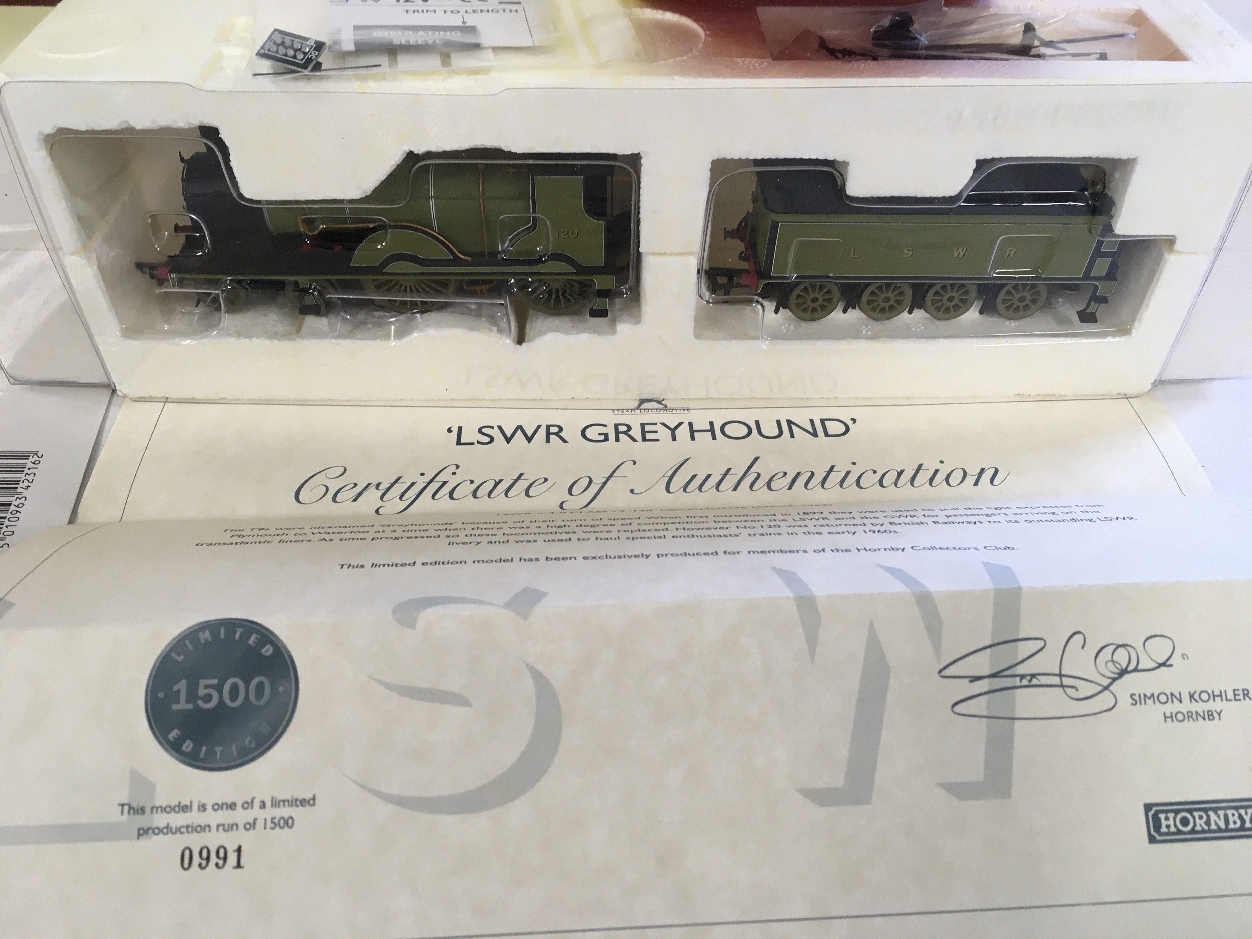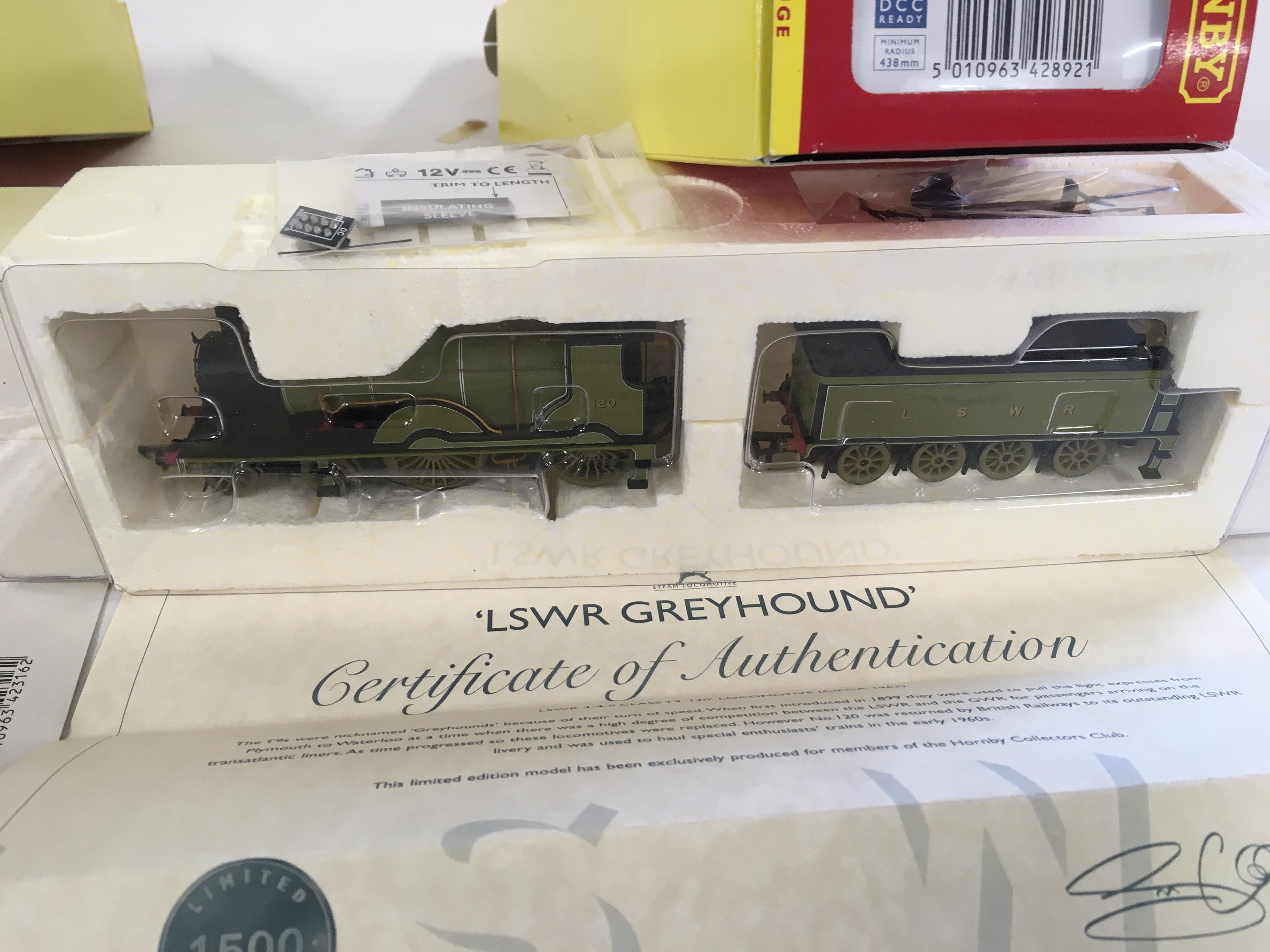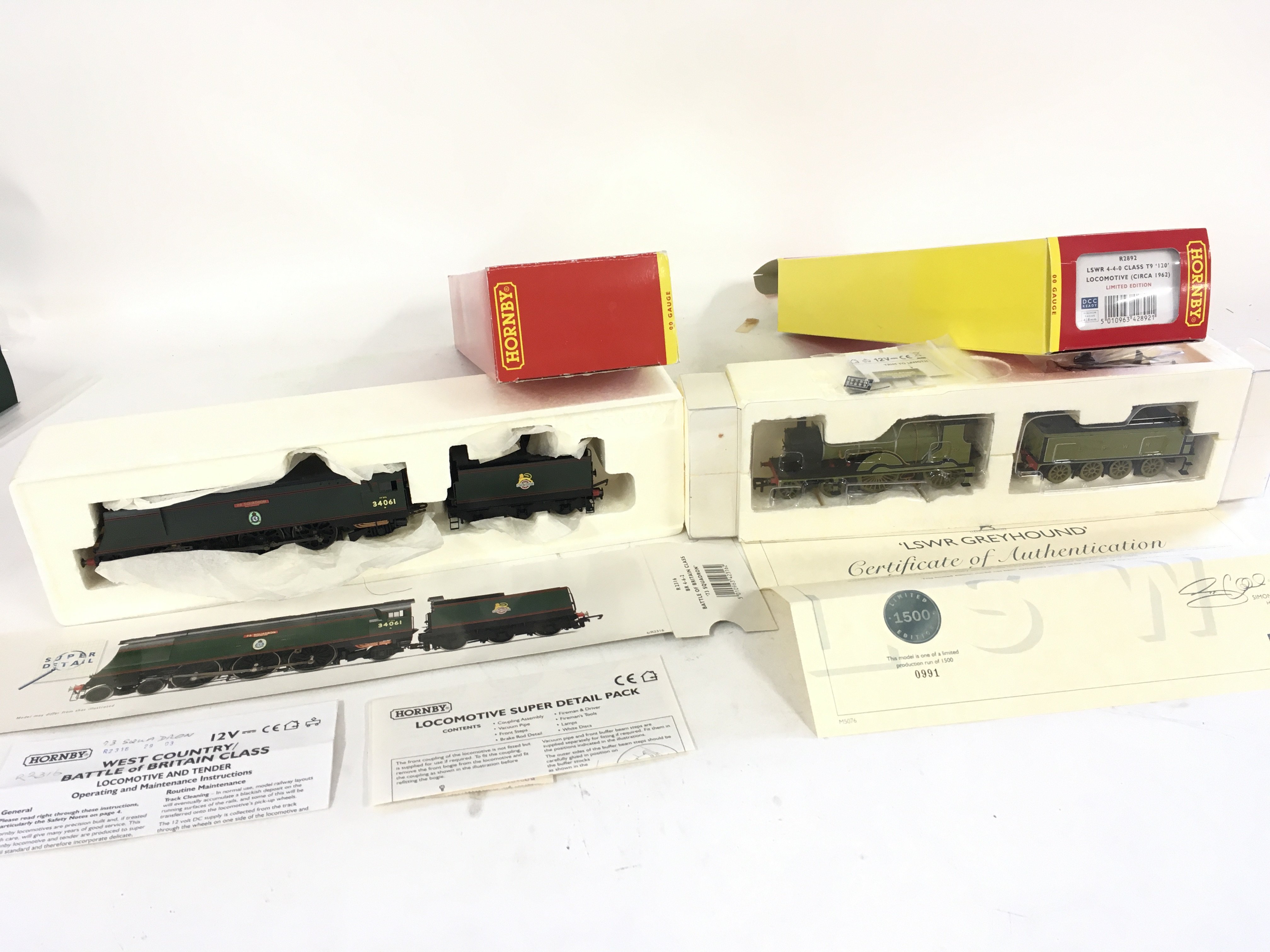 Two Boxed Hornby 00 gauge model railway locomotives with tender including R2892 LSWR Greyhound DCC ready. no 991 in limited edition run of 1500 CoA included..R2316 Battle of Britain class .
