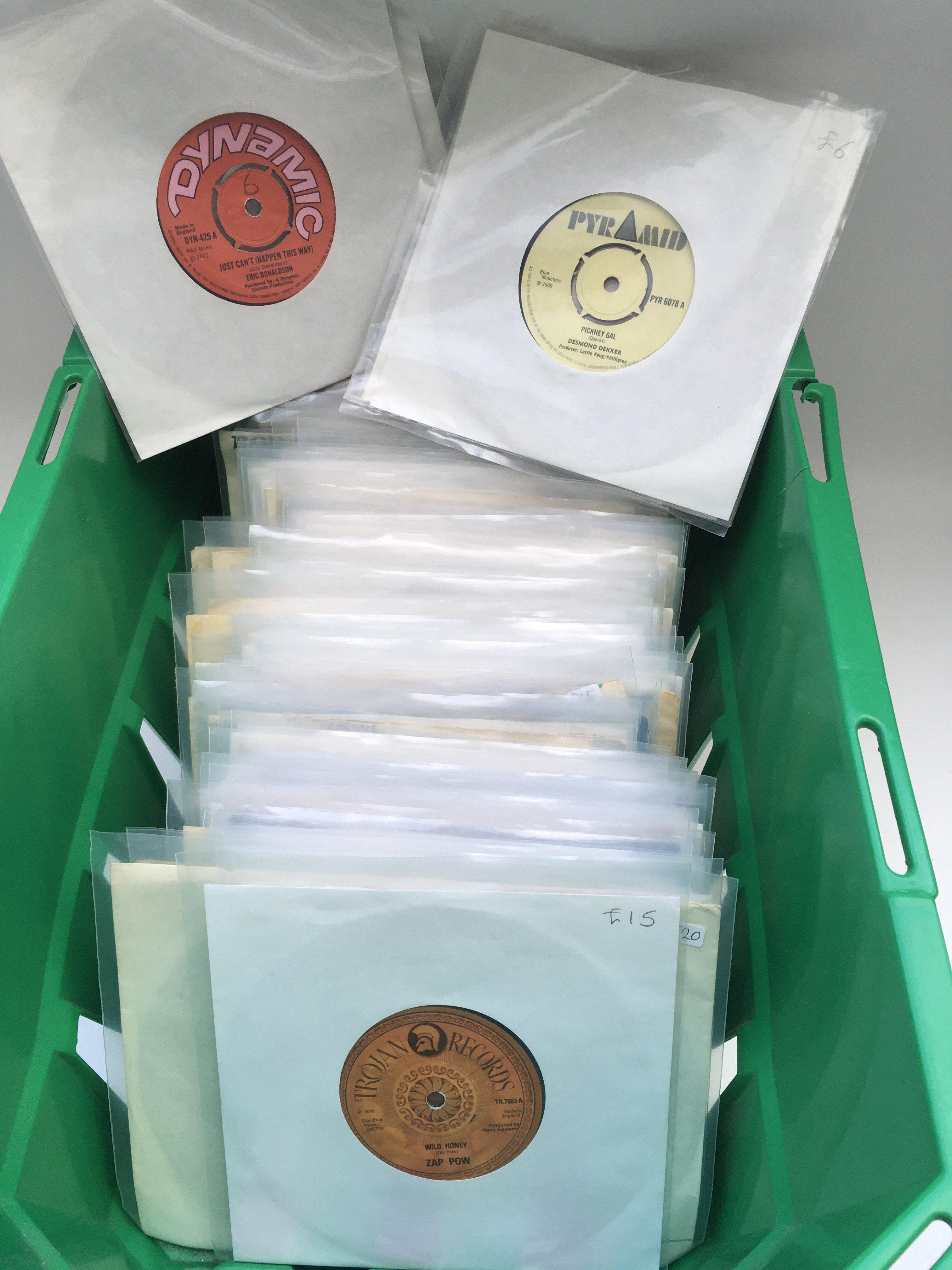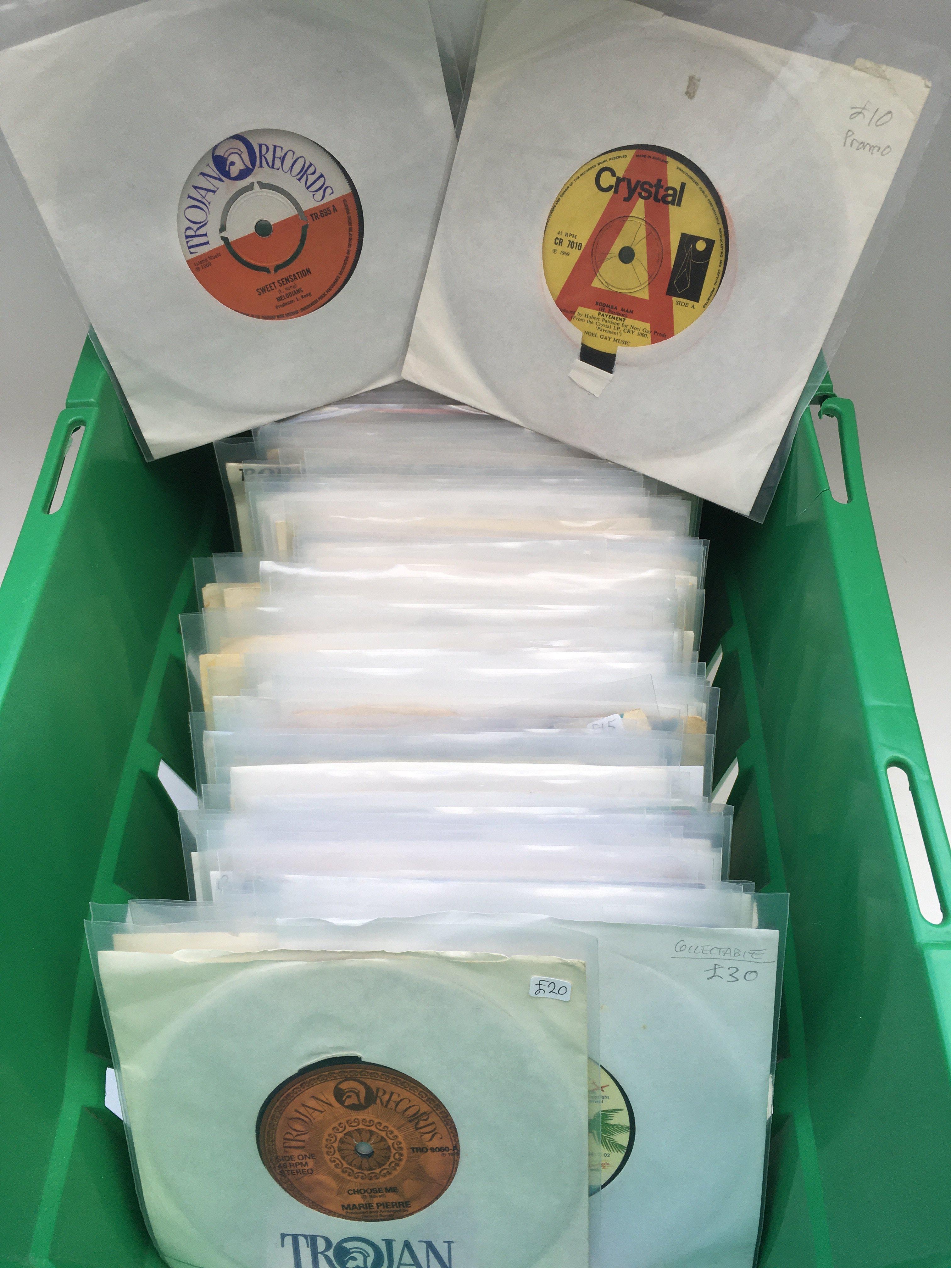 A box containing a collection of reggae 7" singles by various artists including Bob Marley, Steel Pulse, Melodians, Desmond Dekker and many more.