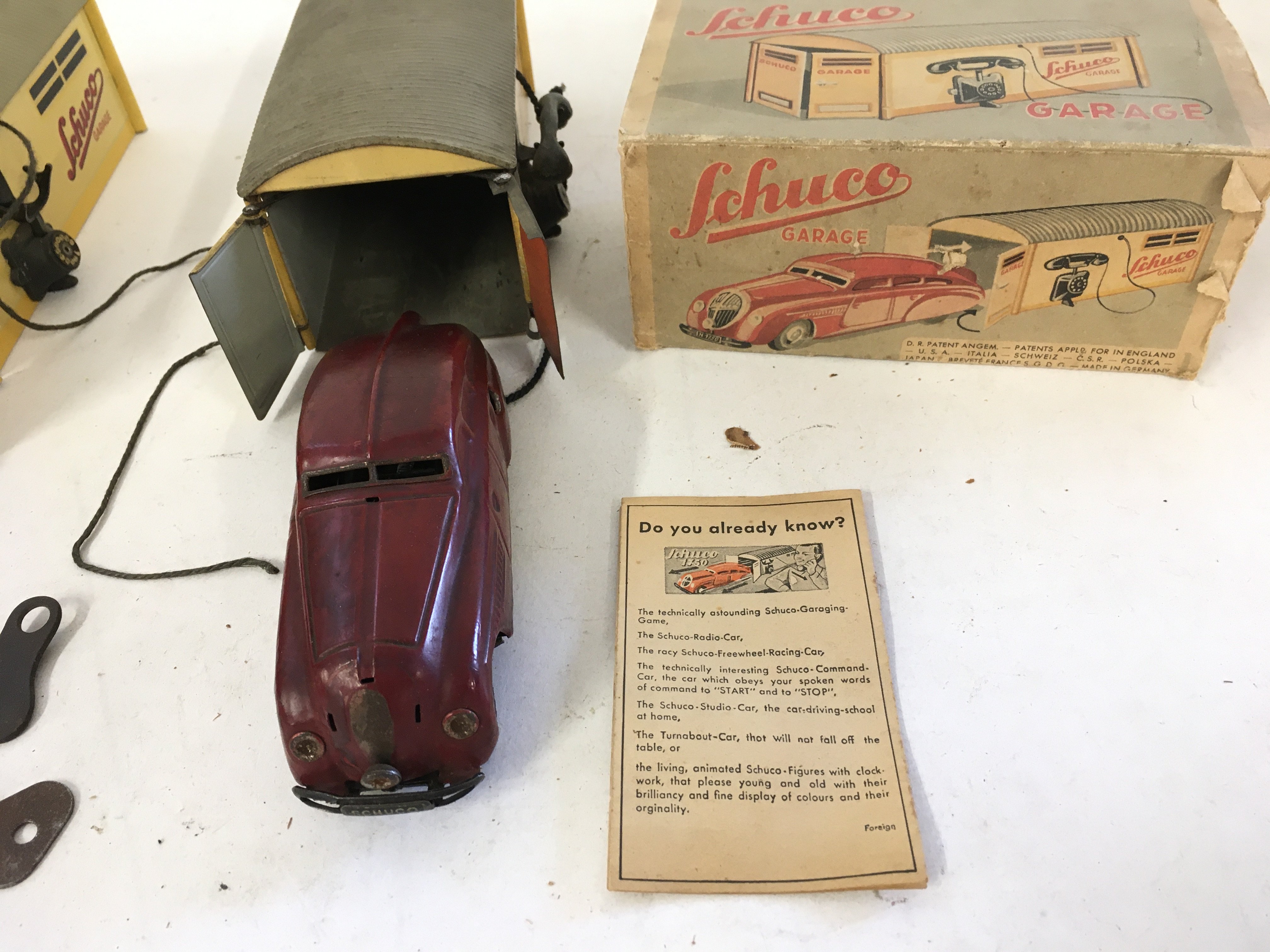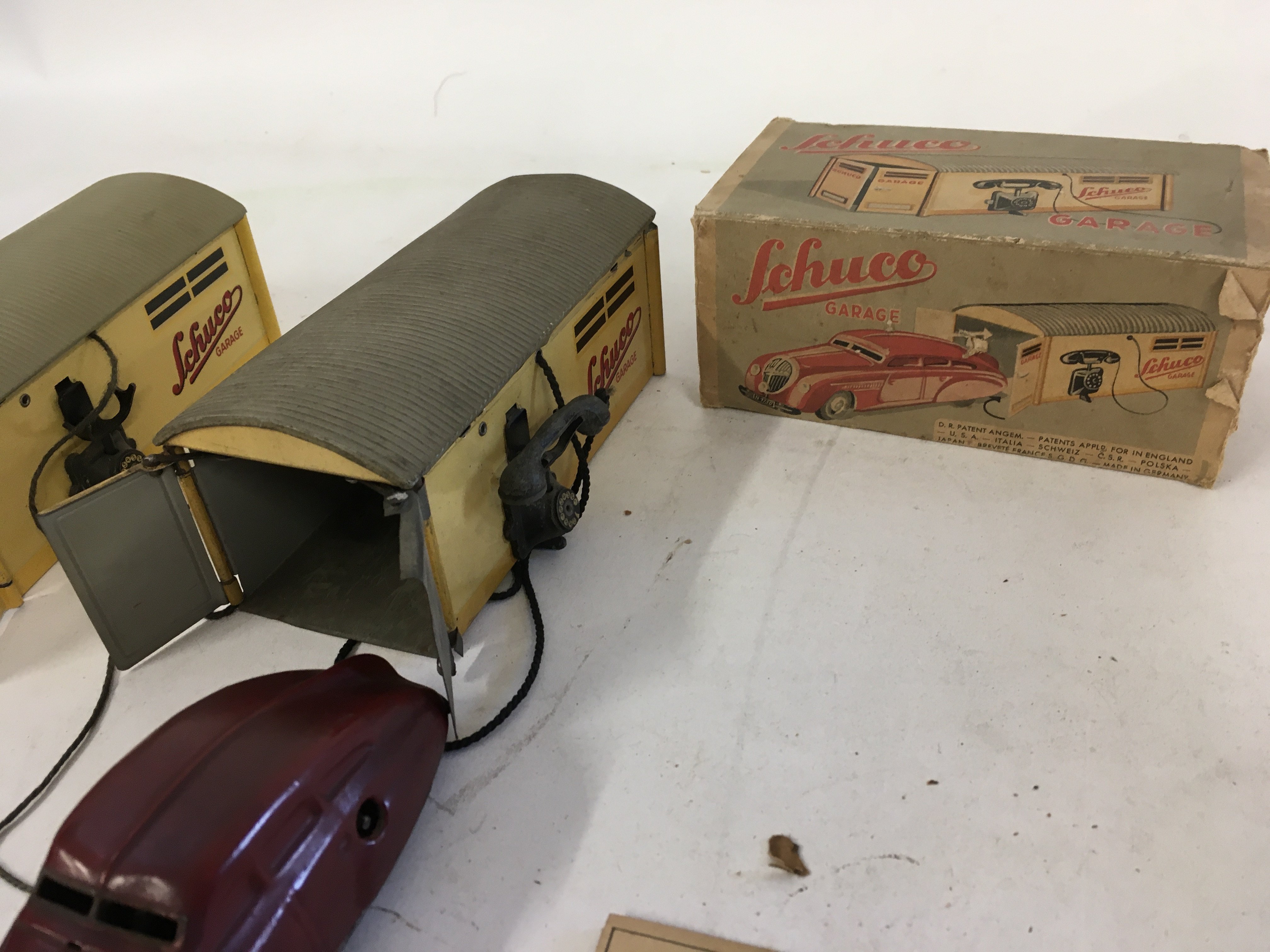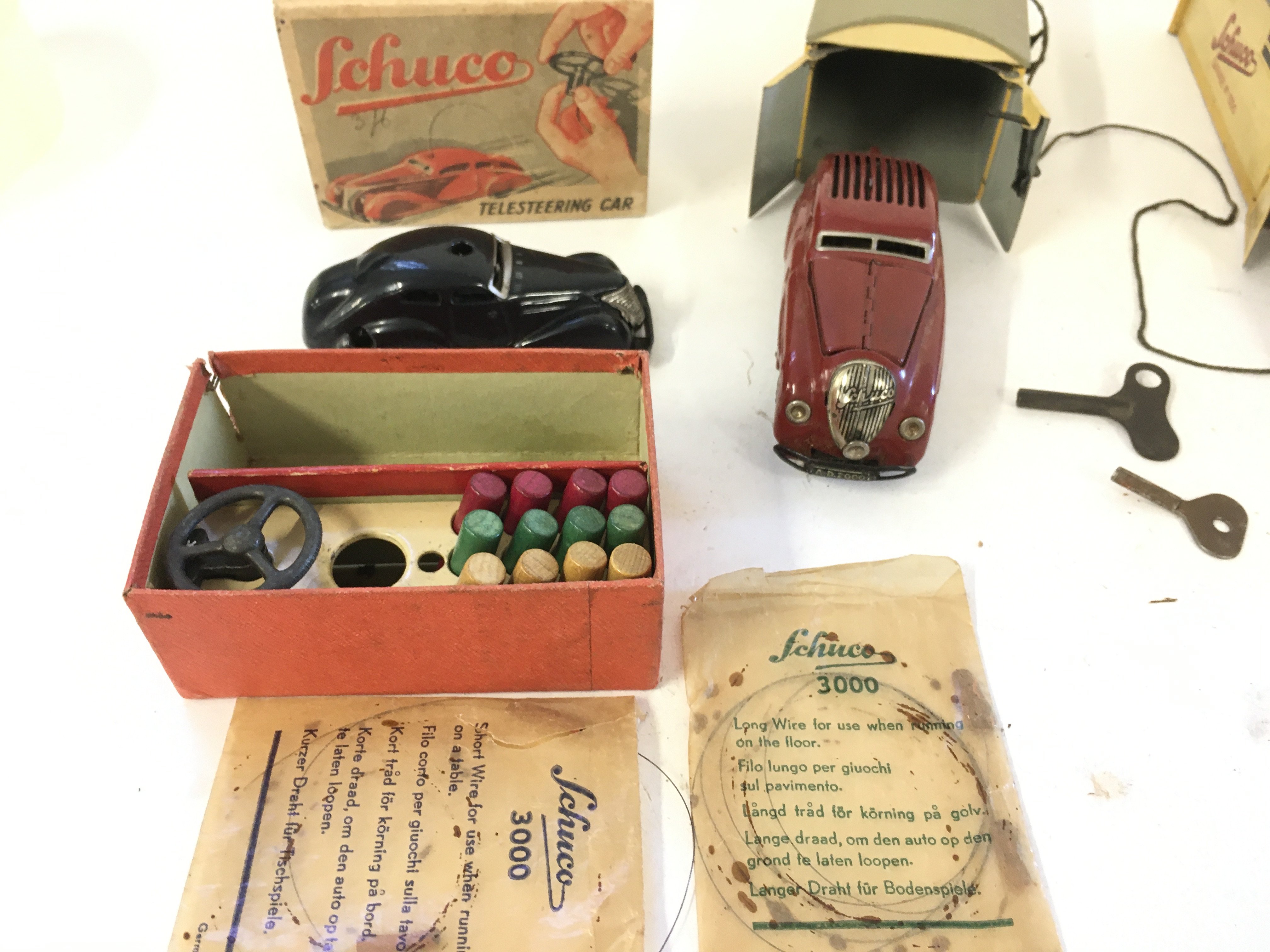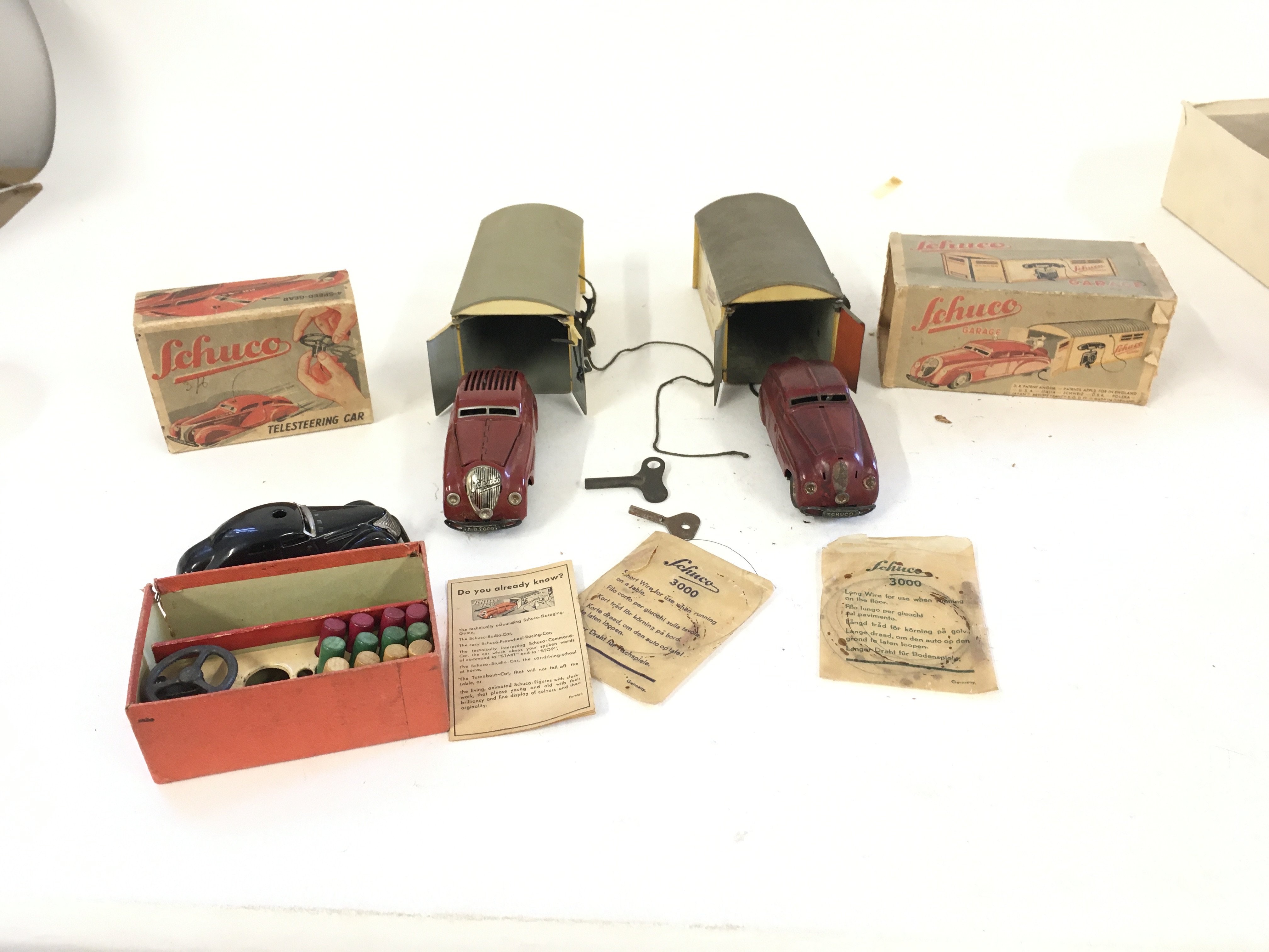 A collection of of 3 Playworn vintage Schuco toys includes two garages with cars and 1 telesteering car with instructions and accessories.