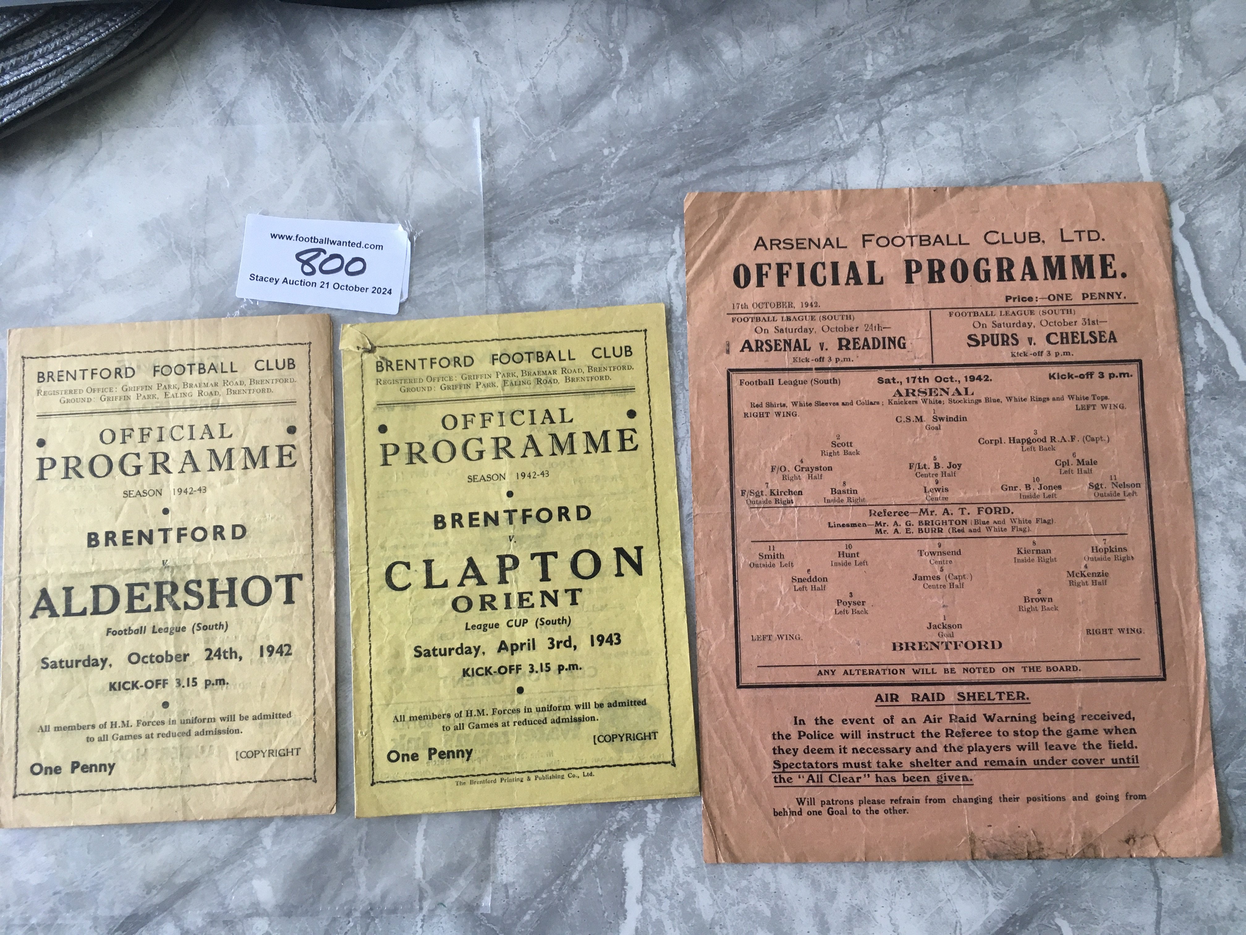 Brentford 42/43 Football Programmes: Homes v Aldershot league and Clapton Orient cup plus Arsenal away in the league. Good. (3)