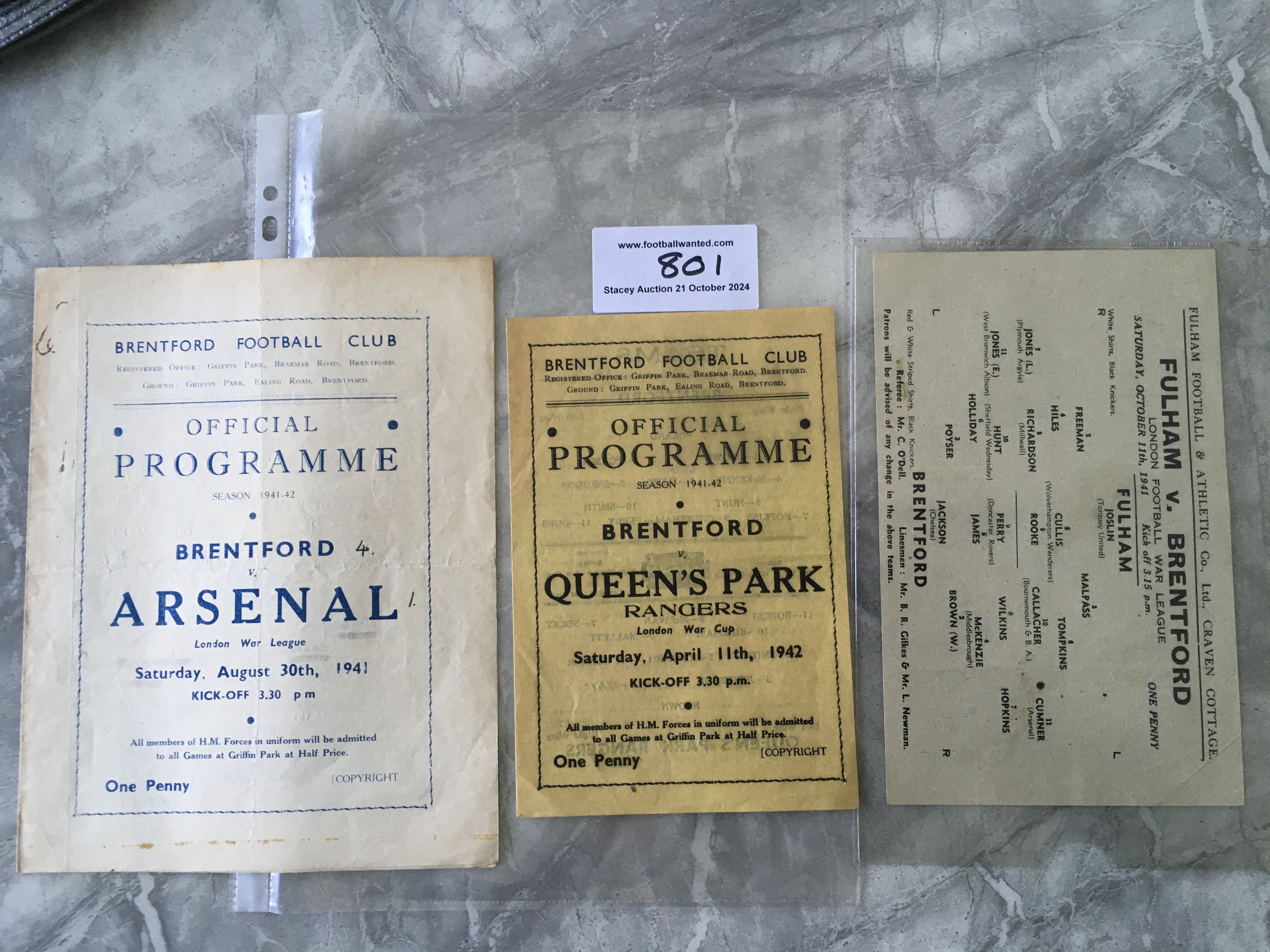 Brentford 41/42 Football Programmes: Homes v Arsenal league with score to cover and QPR cup plus Fulham away in the league. Good. (3)