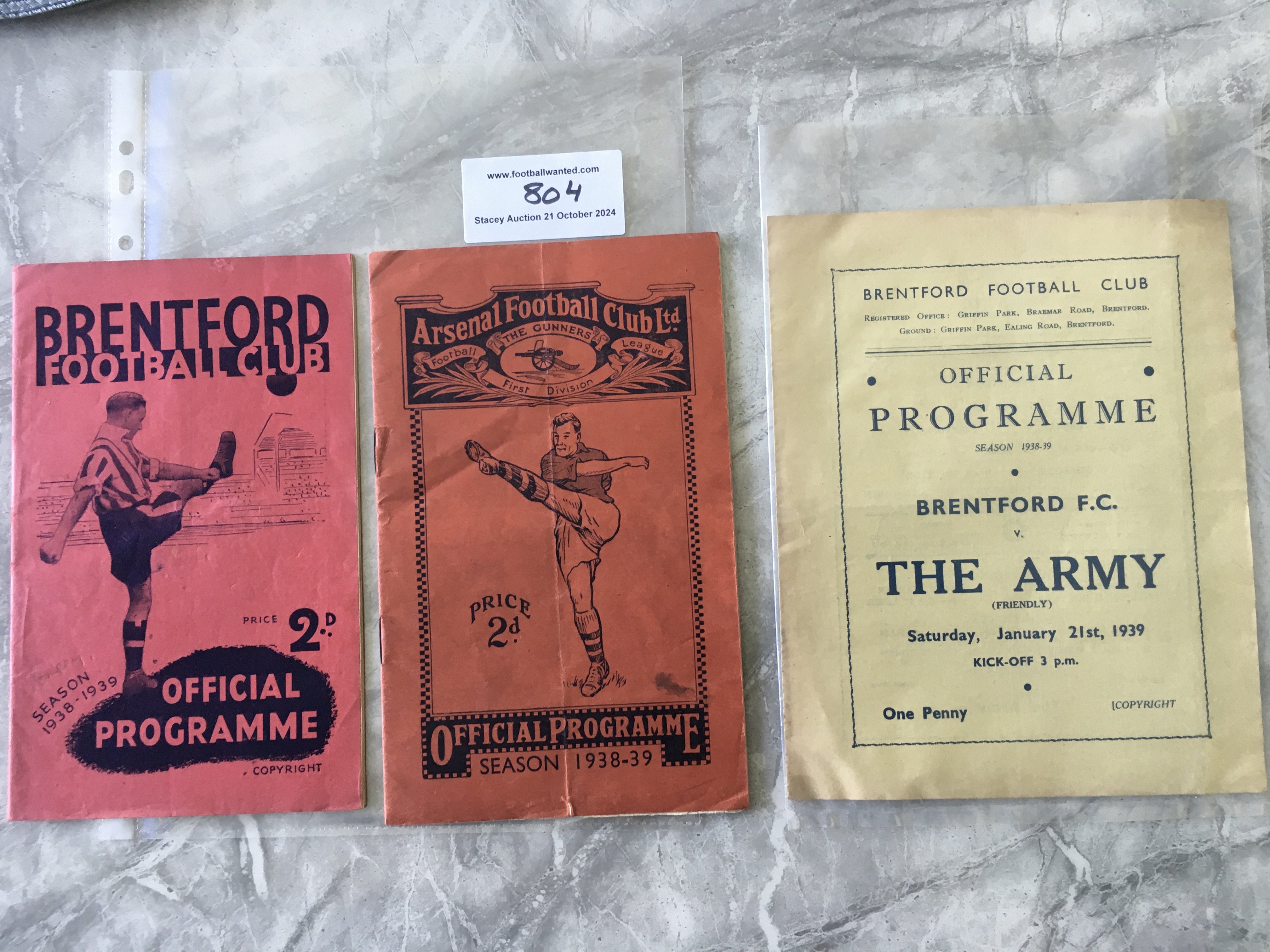 Brentford 38/39 Football Programmes: Homes v The Army and Portsmouth plus Arsenal away which has a small tear on fold. Good unless stated. (3)