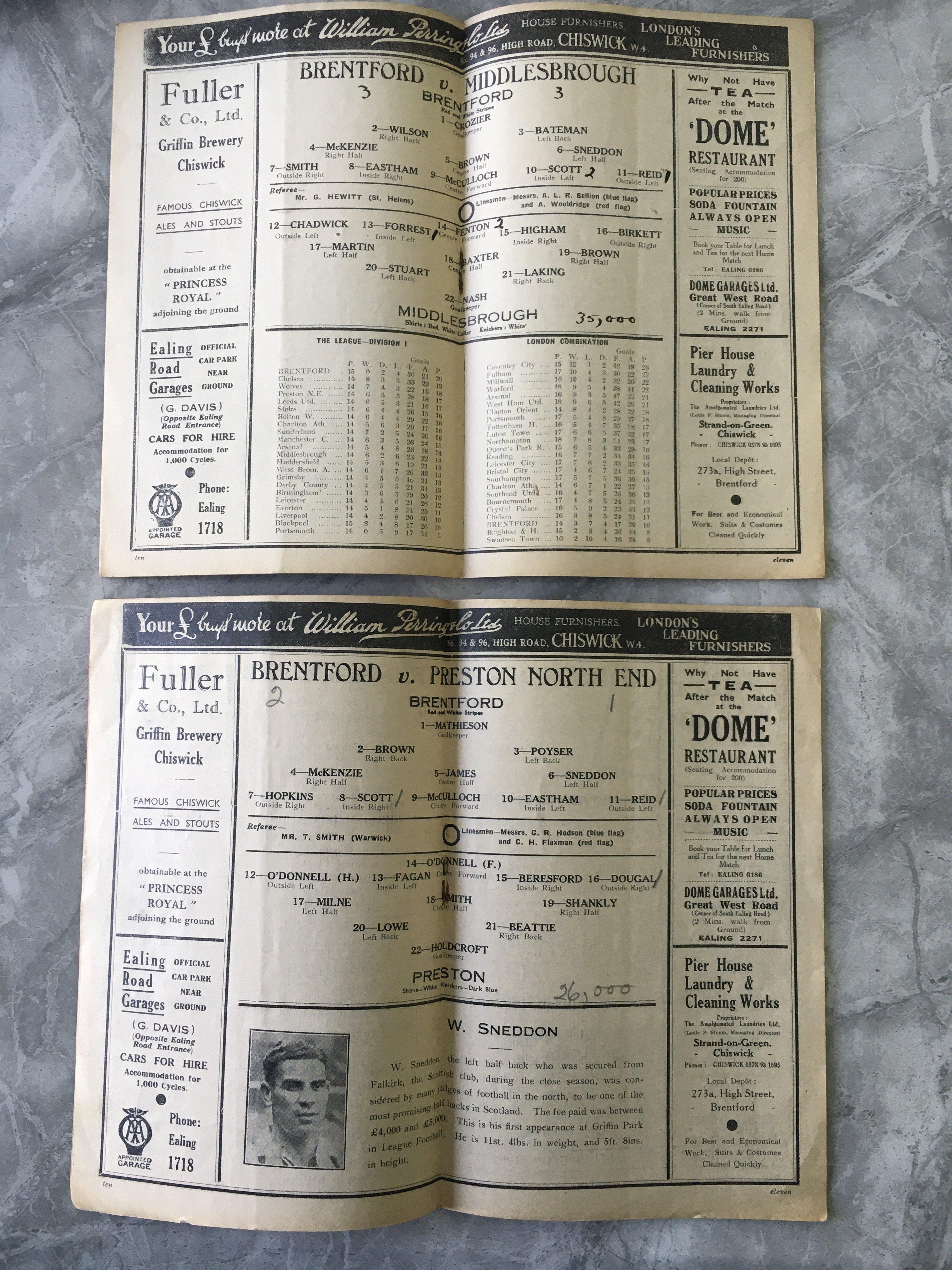Brentford 37/38:Home Football Programmes: Preston and Middlesbrough both very good with score and scorers noted to team page inside. (2)