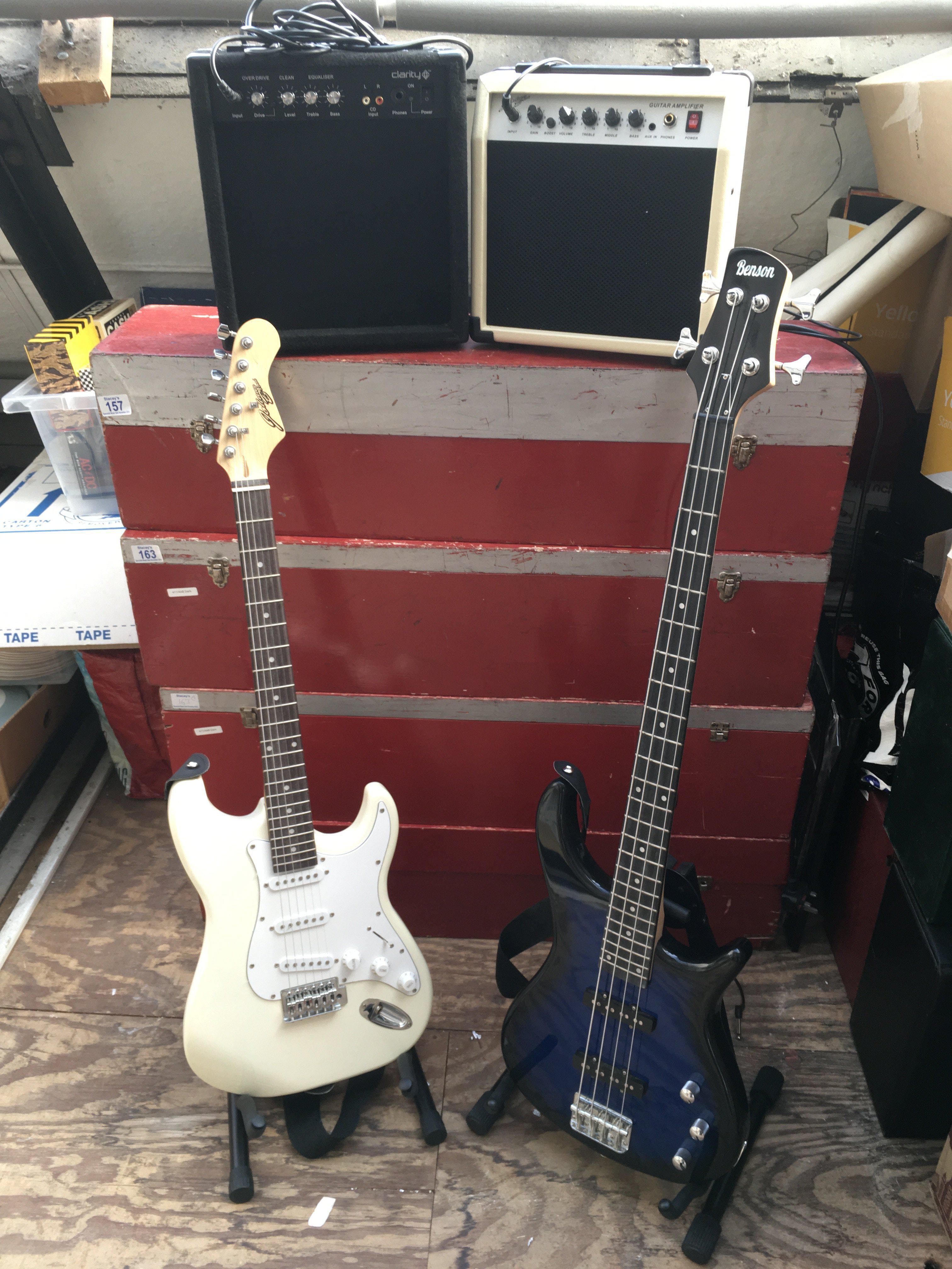 A Johnny Brook Strat style electric guitar, a Benson bass guitar and two practice amps.