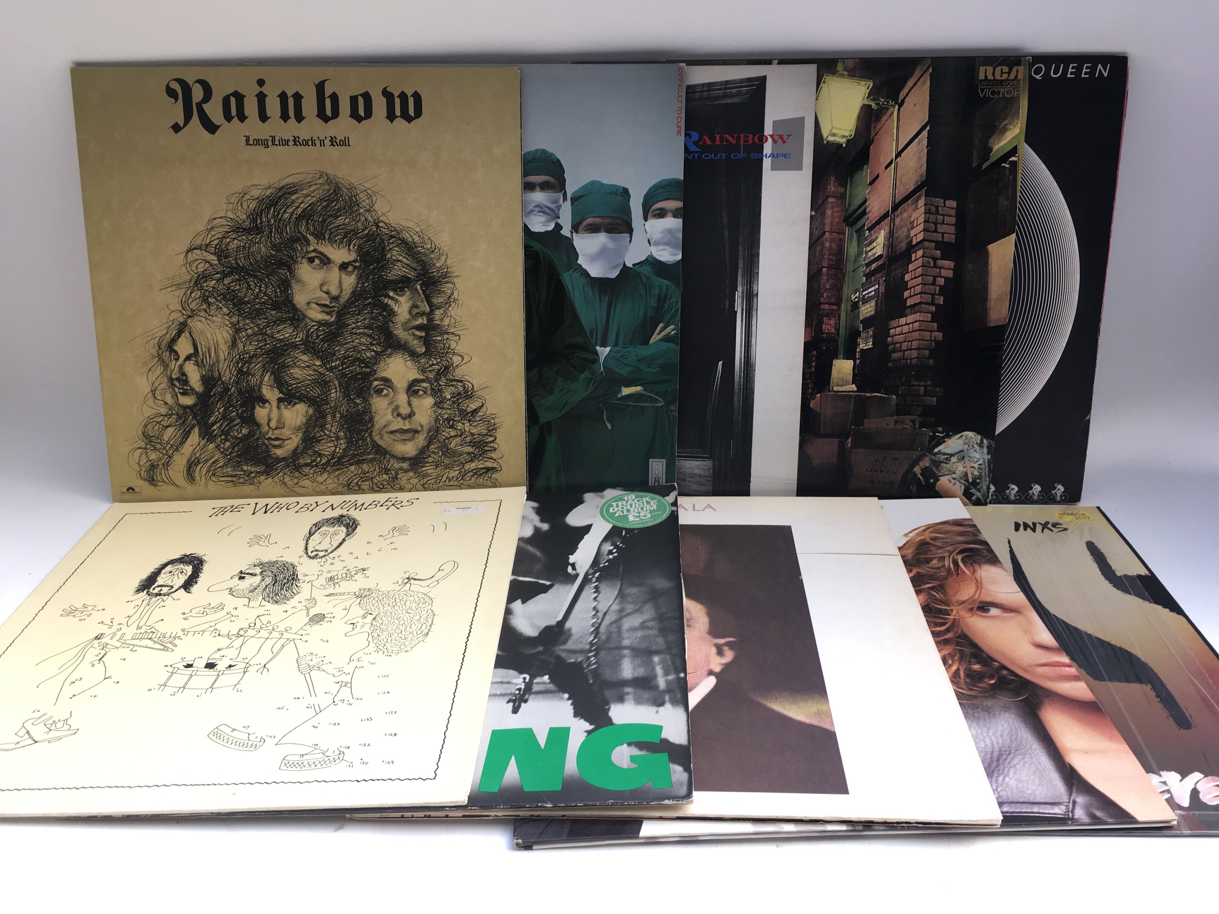 Ten rock LPs by various artists including Rainbow, Queen, INXS and others.