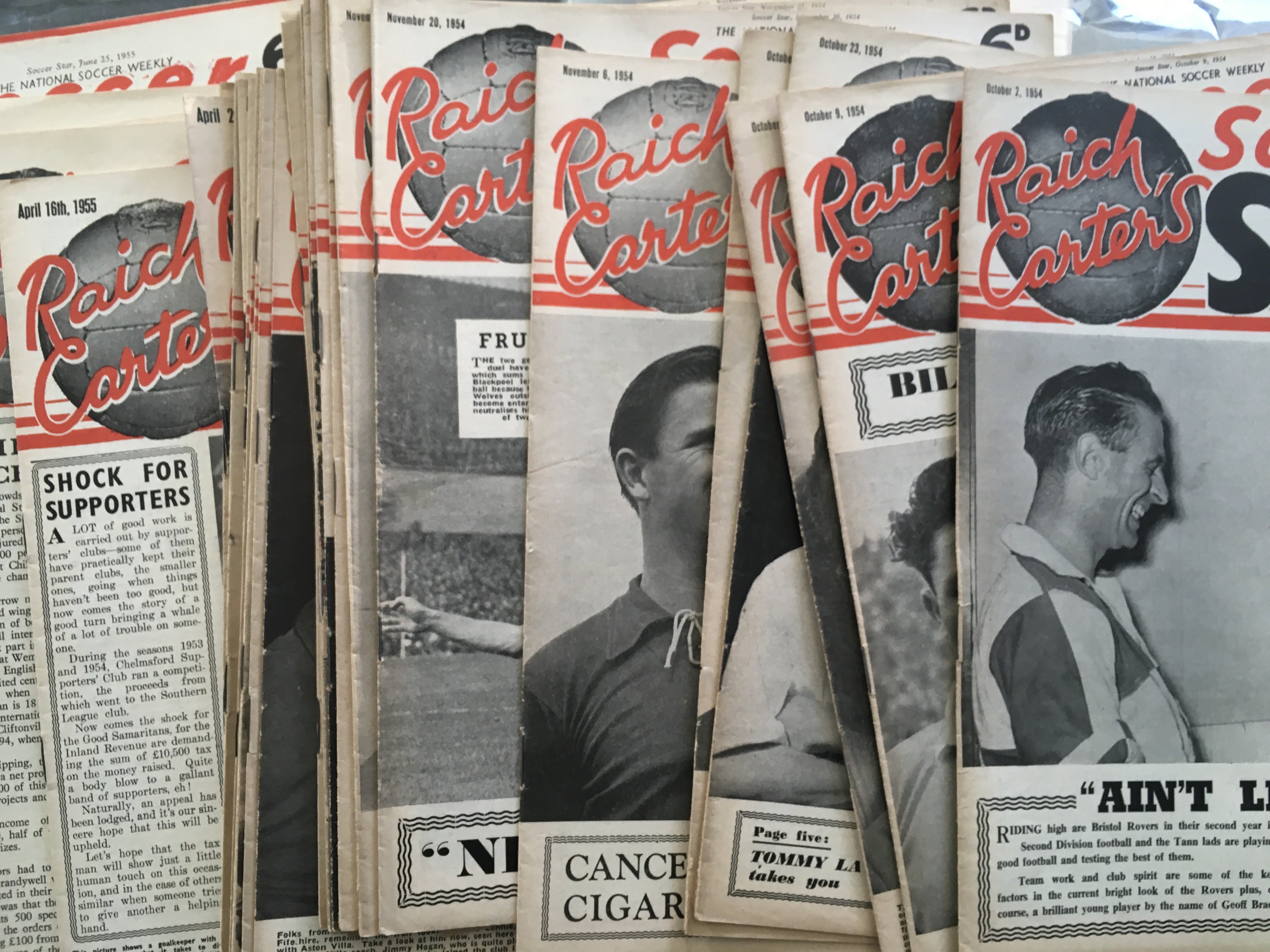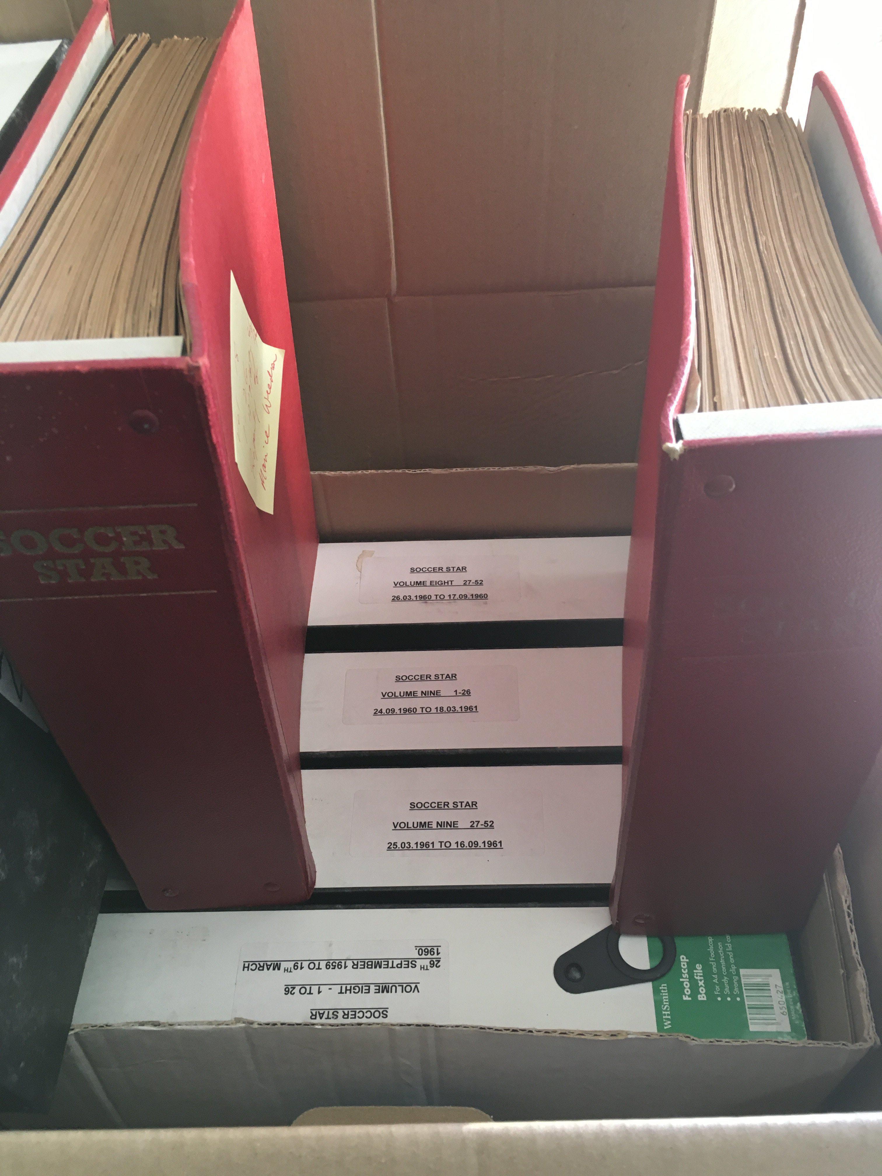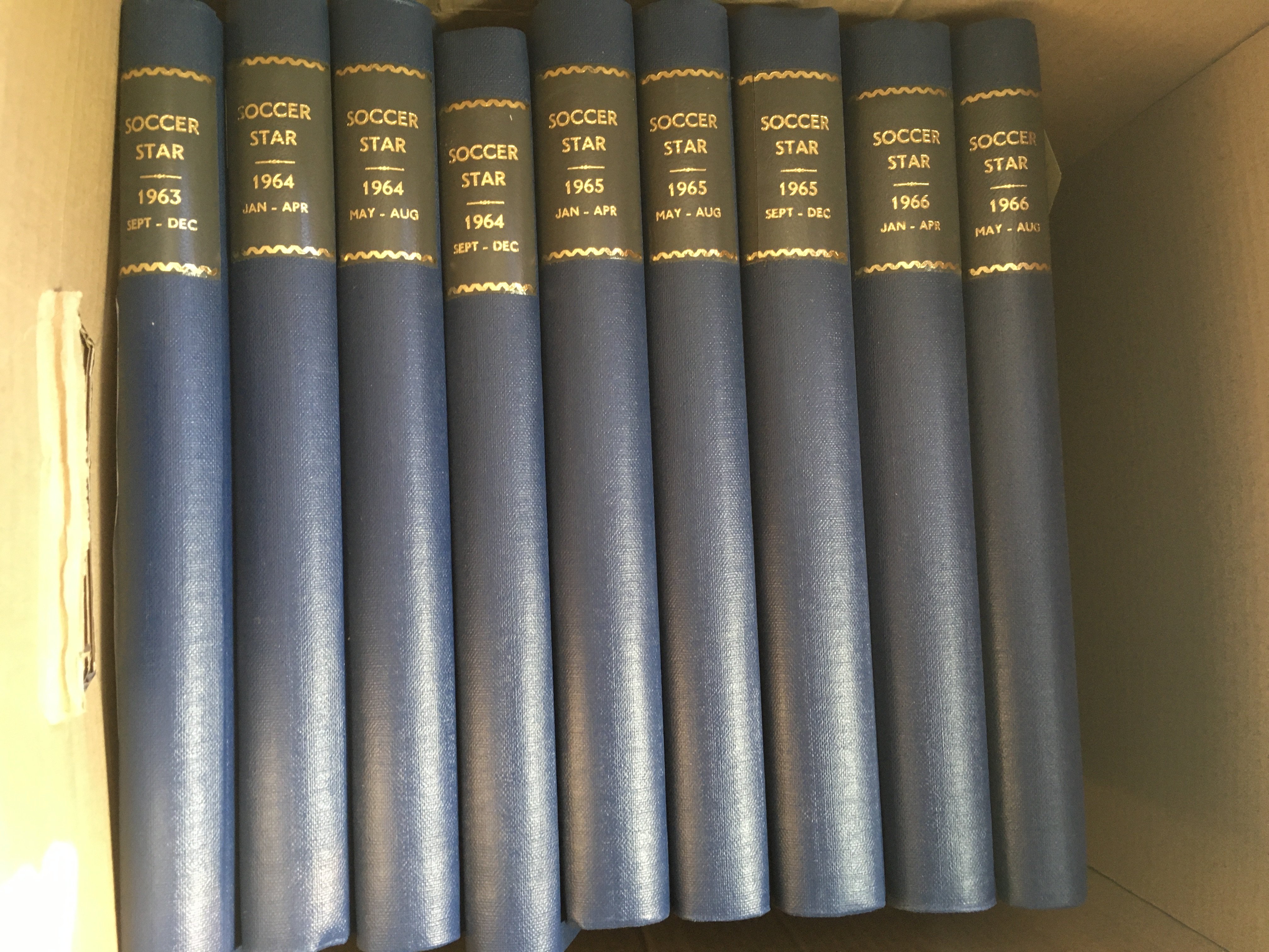 Soccer Star Complete Seasons Of Football Magazines: Some the former property of a Maurice Weedon. Bound red volumes from 57/58 and 69/70. Loose sets from 54/55 then September 59 to Sept 62. From 63 to 66 there are 9 blue smaller bound volumes. Would be over 400 issues in excellent condition. (2 large boxes)
