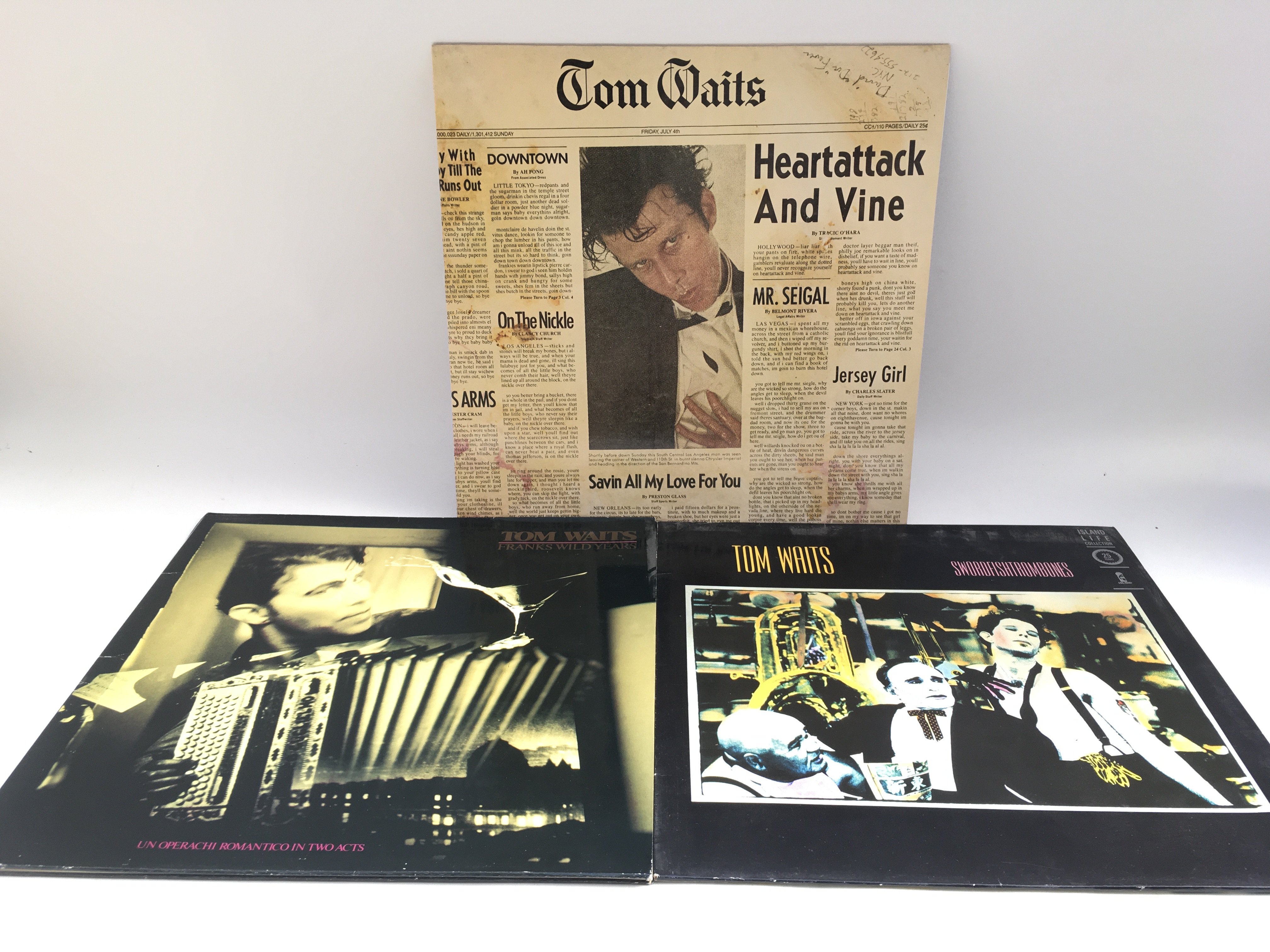 Three Tom Waits LPs comprising 'Heart Attack And Vine', 'Swordfishtrombones' and 'Frank's Wild Years'.