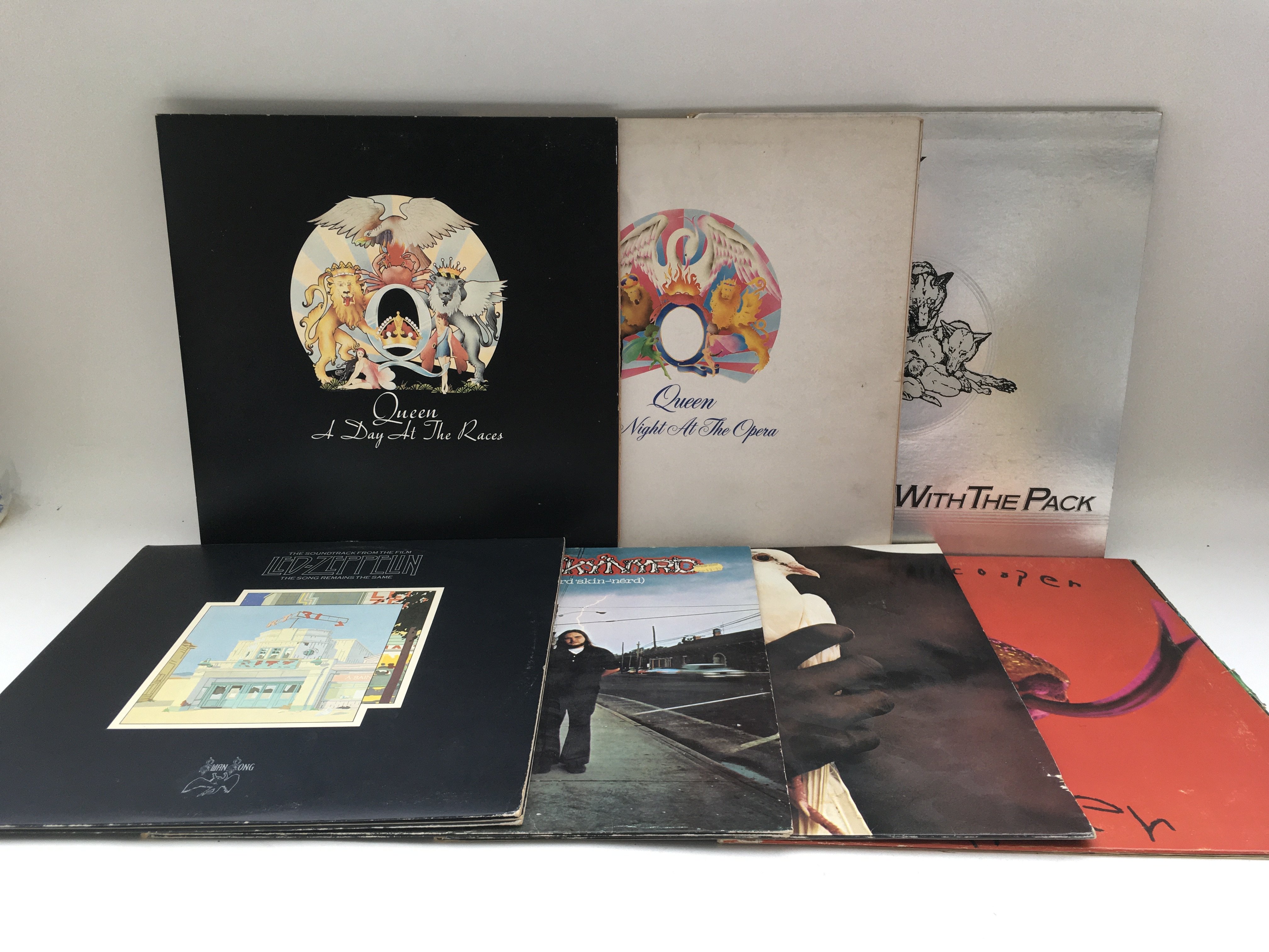 Seven rock LPs by various artists including Queen, Led Zeppelin and others.