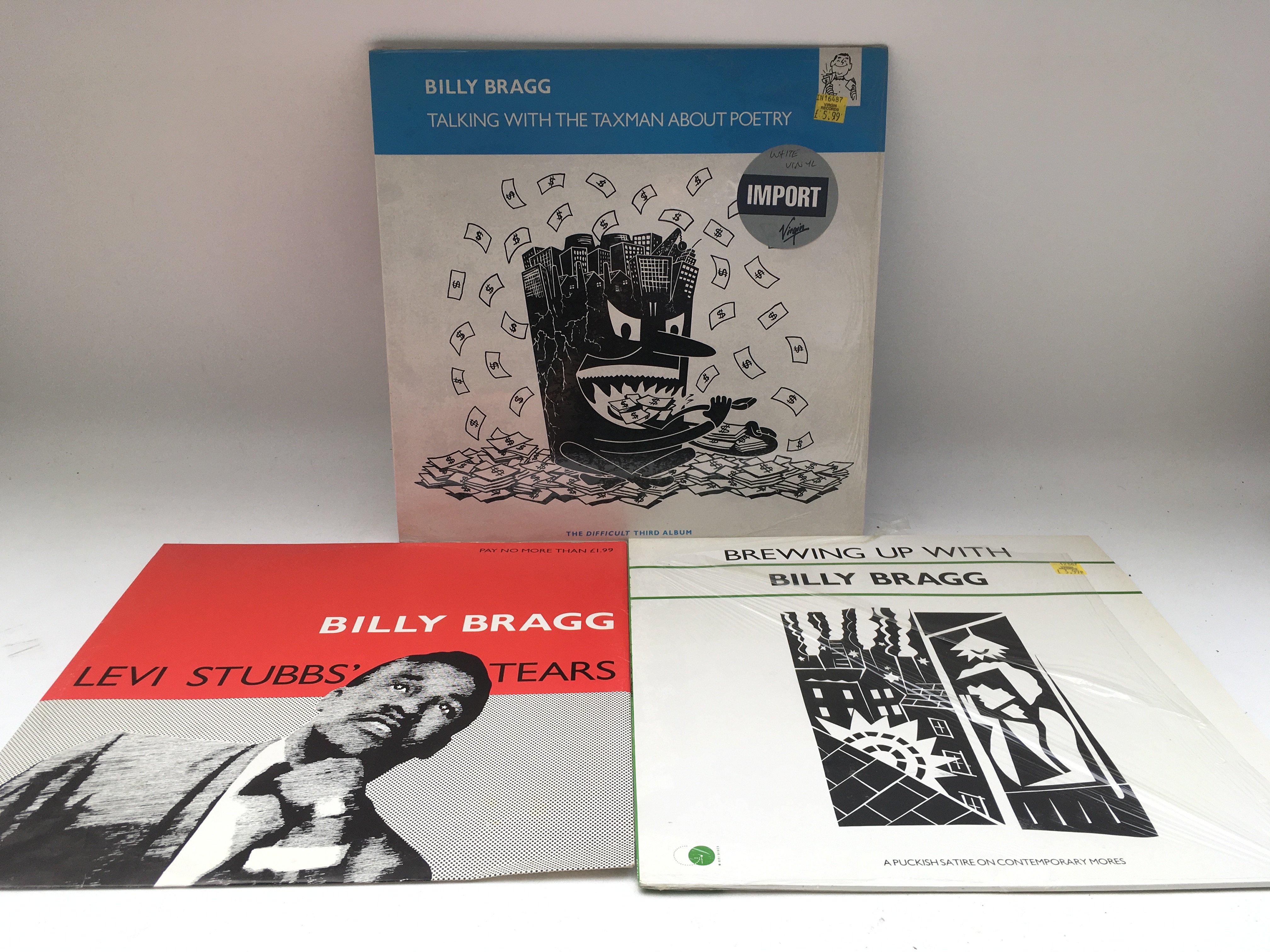 Three Billy Bragg LPs including a white vinyl 'Talking With The Taxman About Poetry', 'Brewing Up With' and 'Levi Stubbs' Tears'.