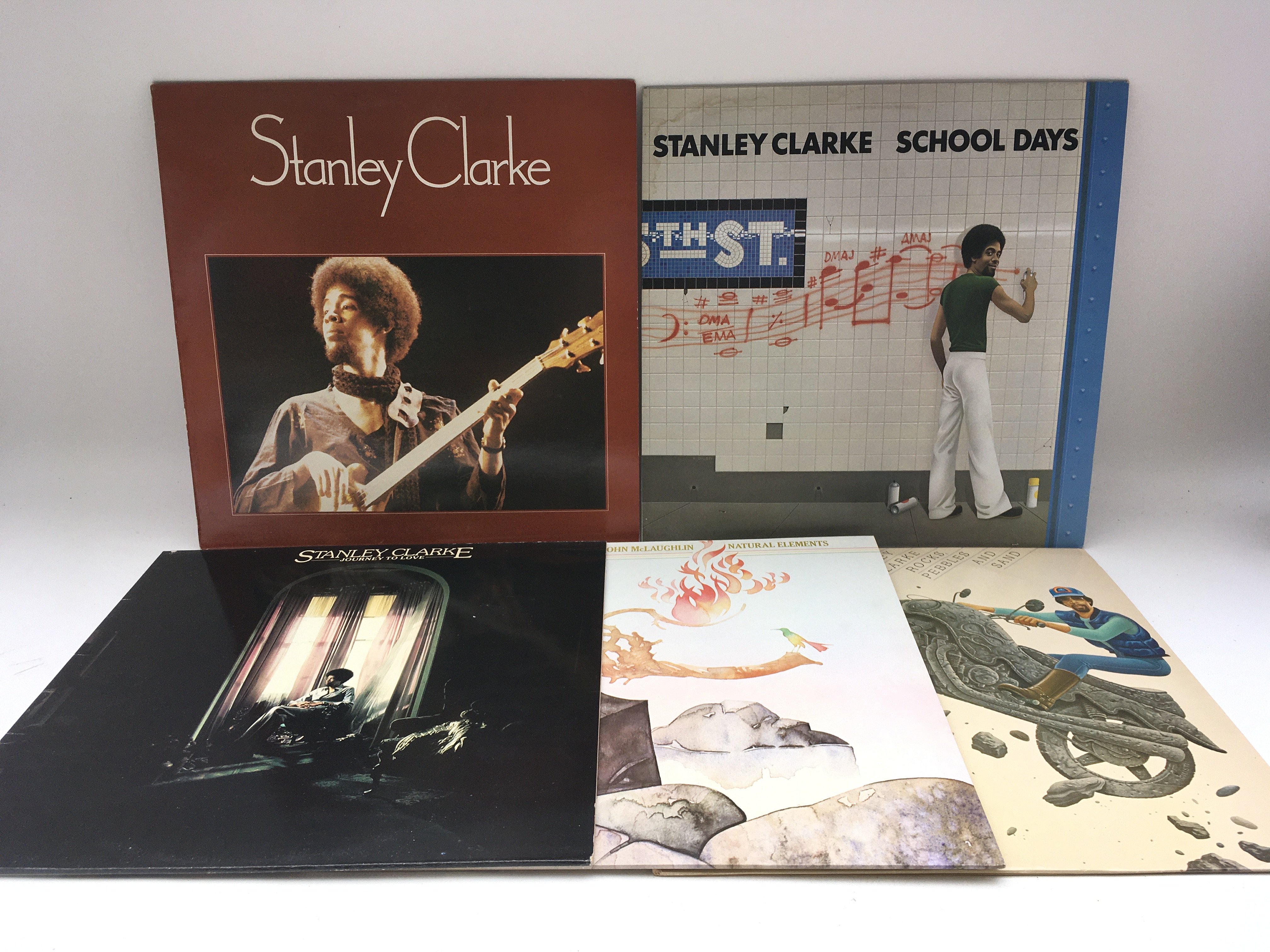 Five Stanley Clarke LPs comprising 'School Days', 'Journey To Love' and others.