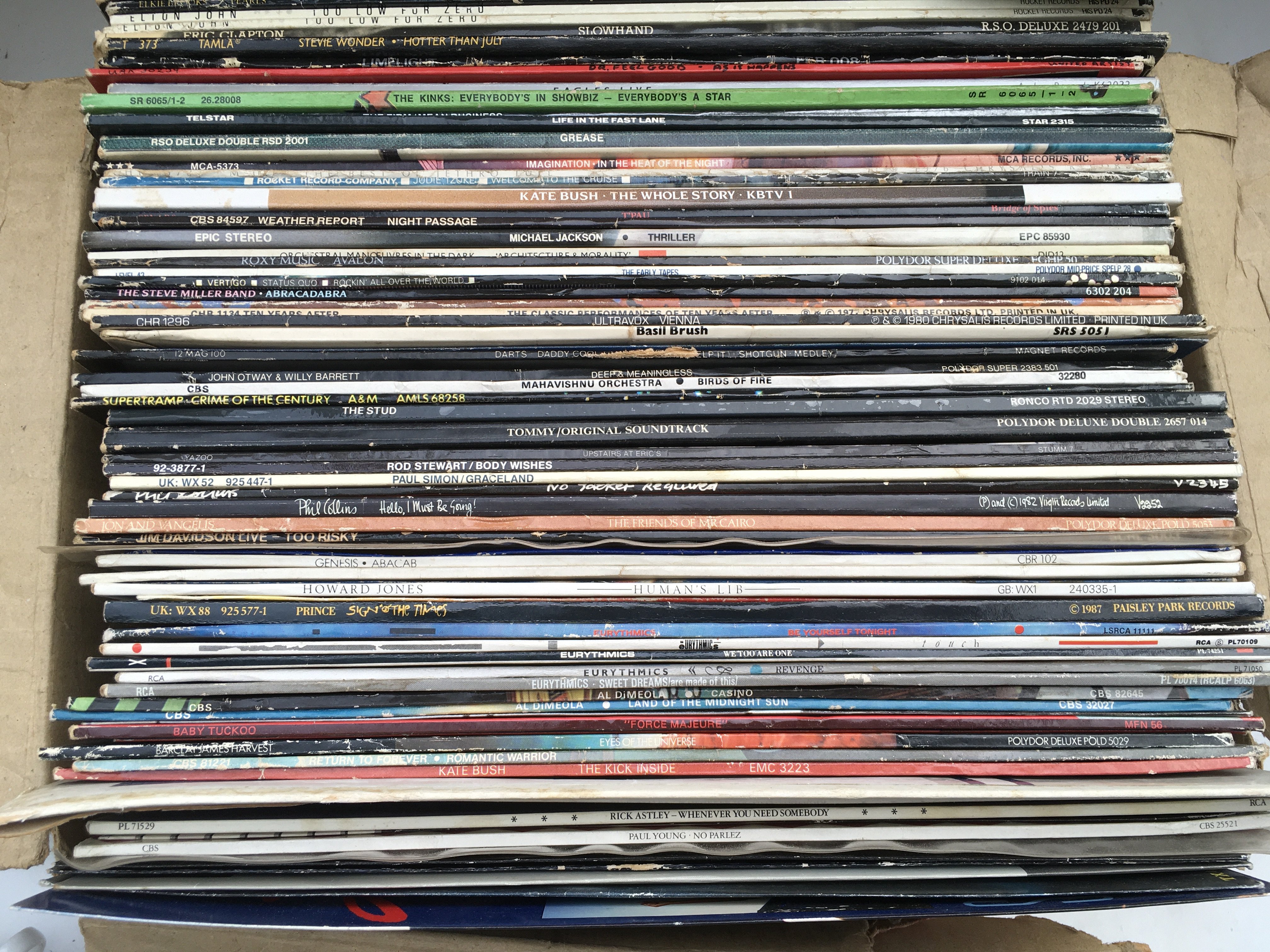 A box of LPs and 12" singles by various artists including Kate Bush, Eurythmics, Prince and others.