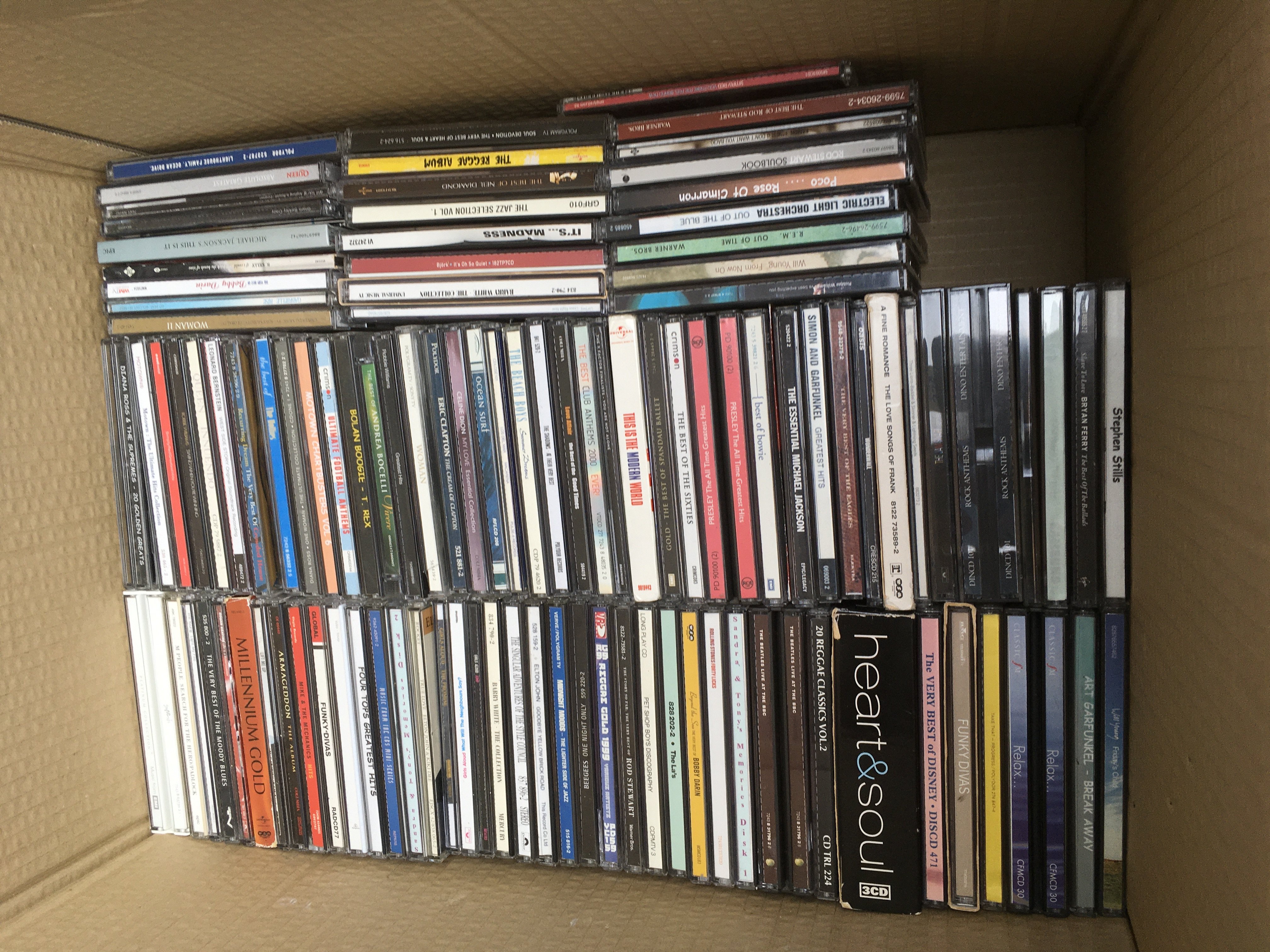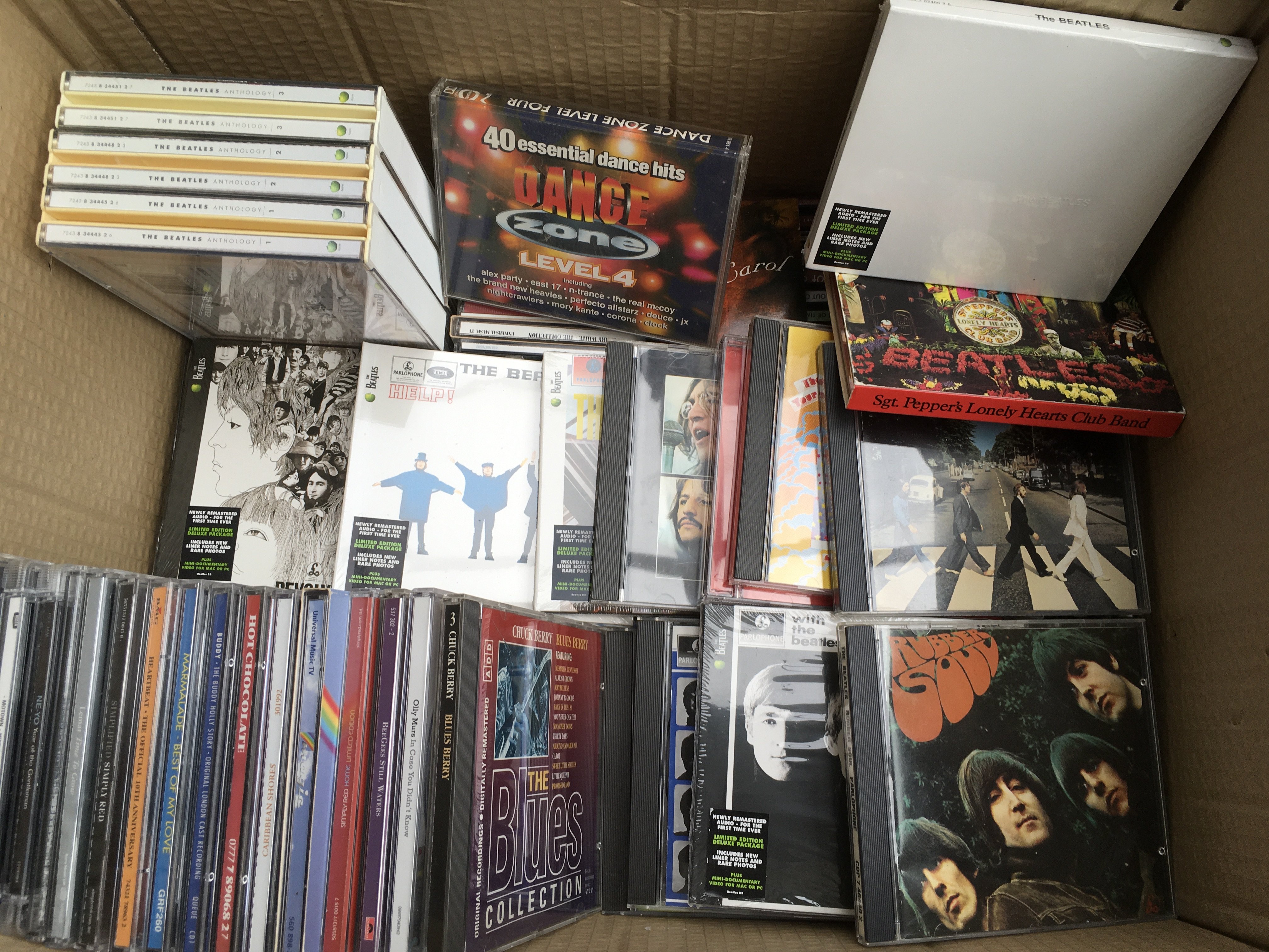 A box of CDs by various artists including The Beatles, Marc Bolan, REM and many more.