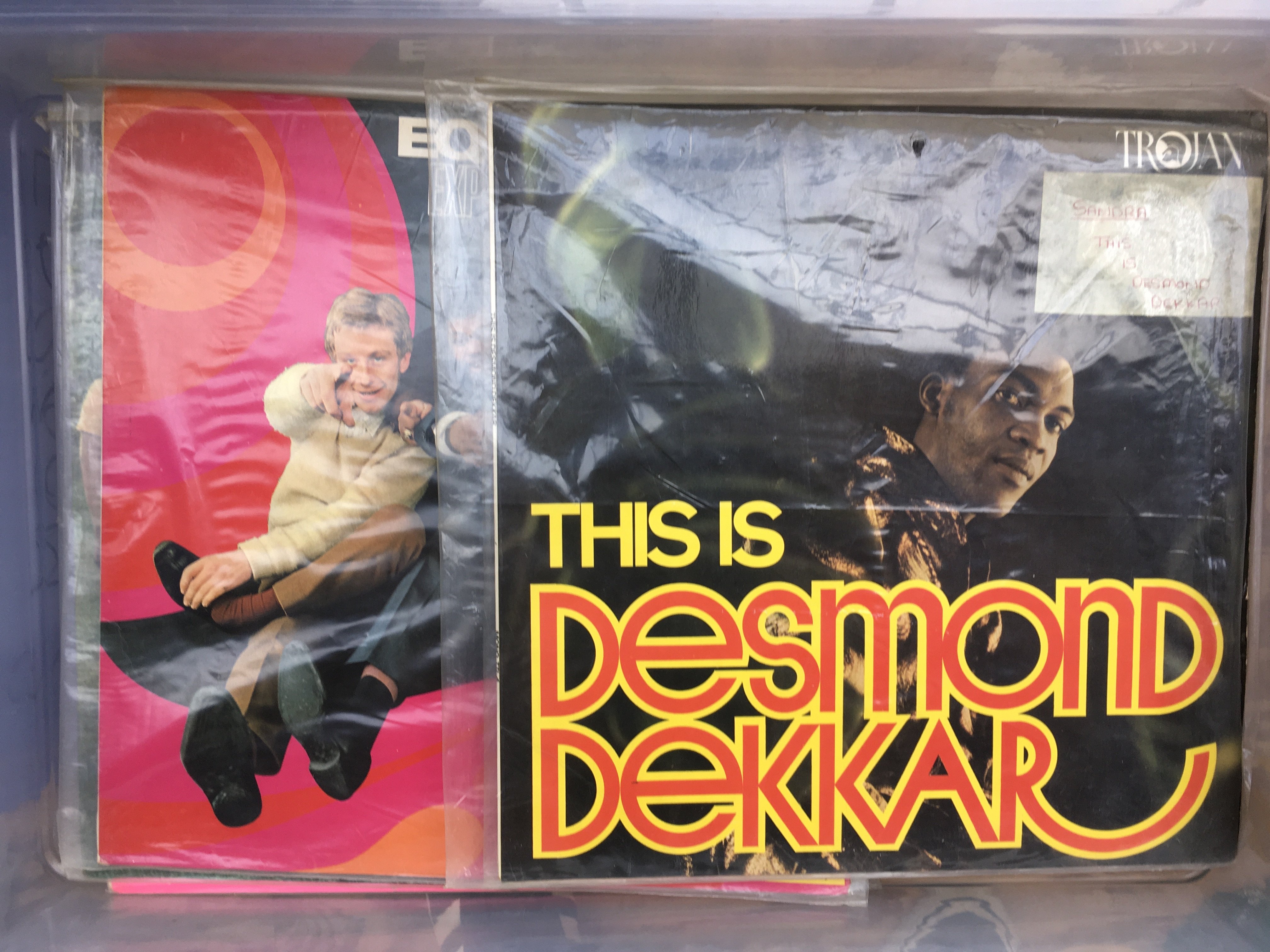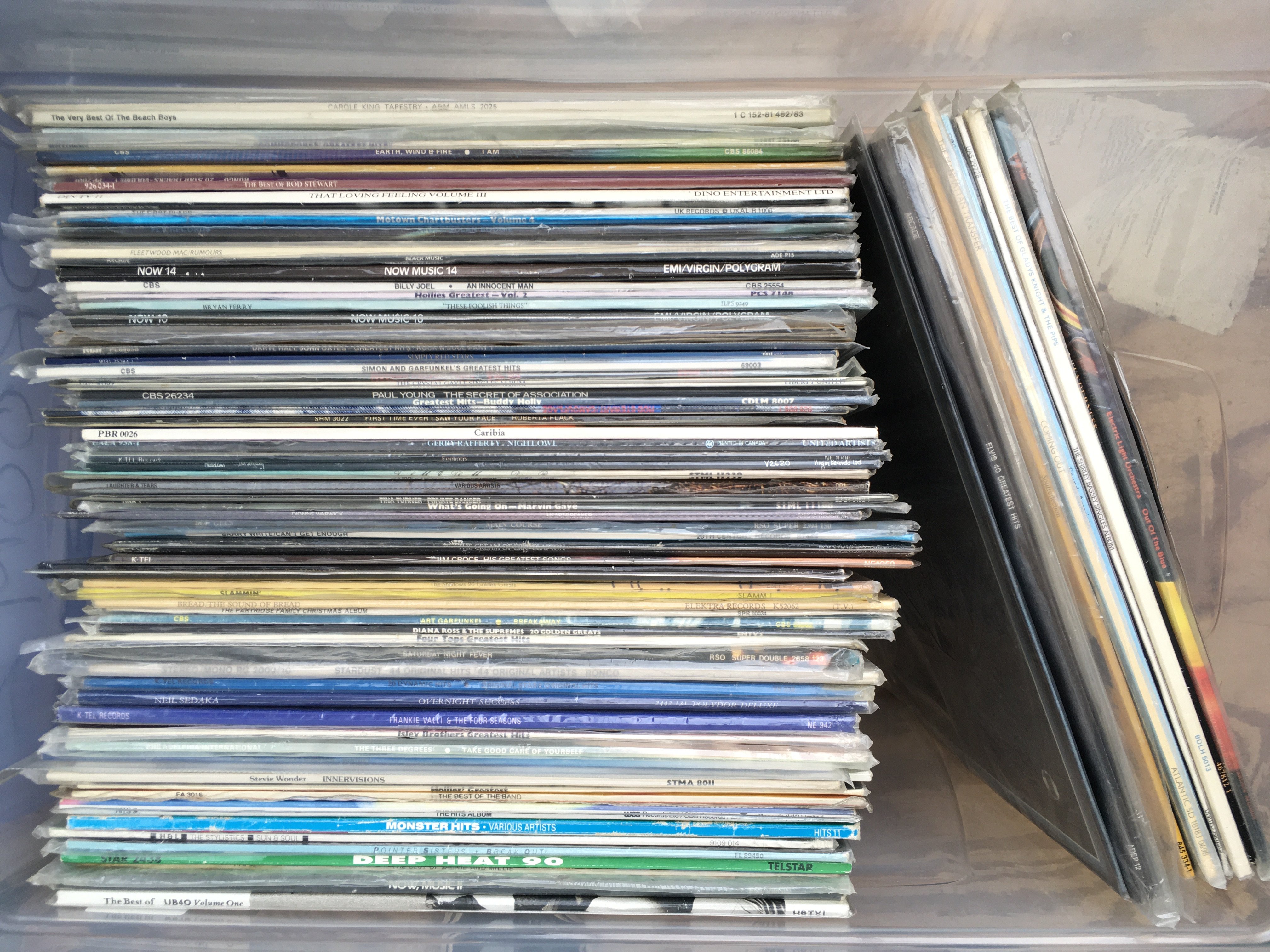 A box of LPs by various artists including Marvin Gaye, Stevie Winder, UB40 and others.