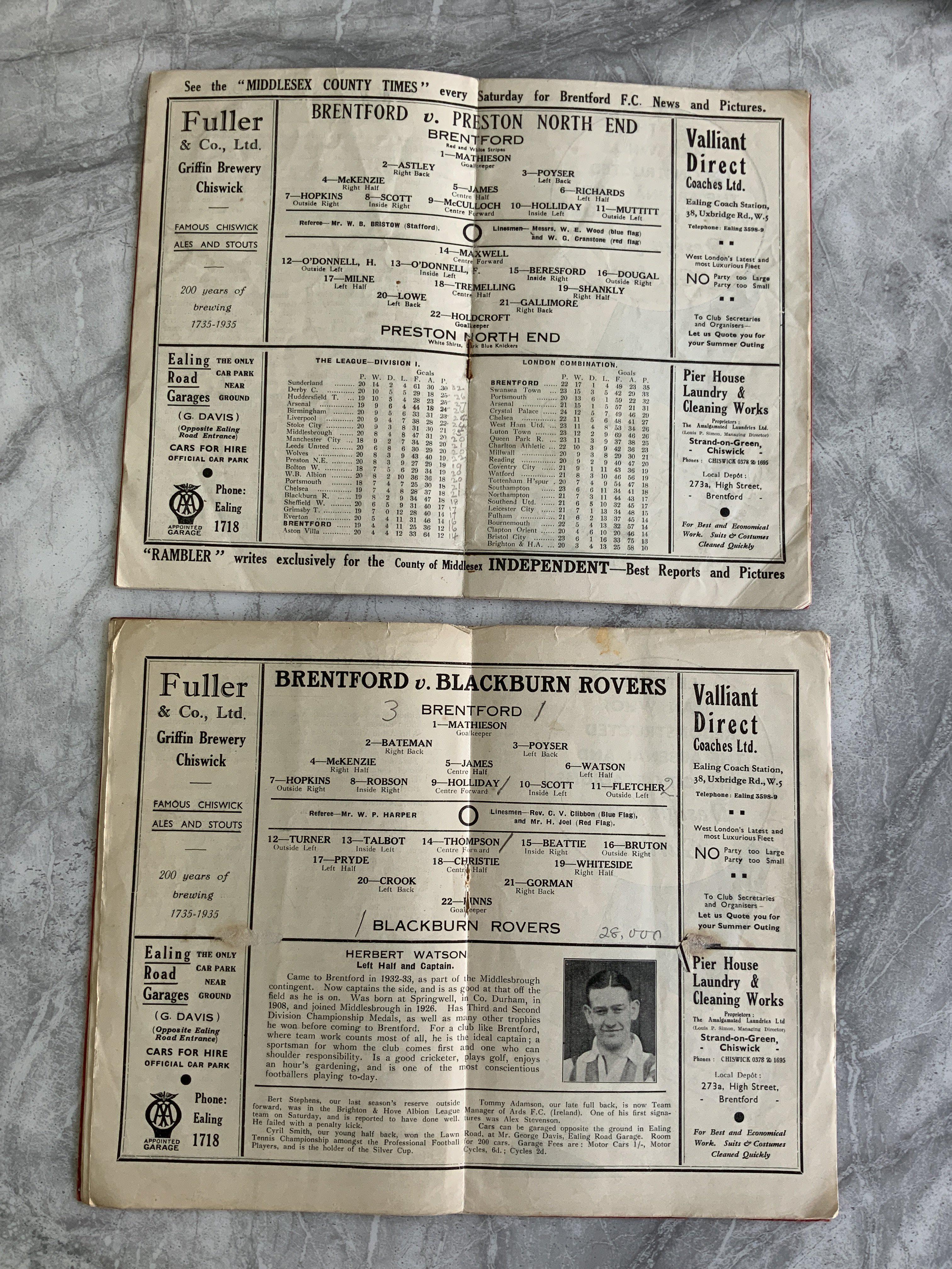 Brentford 35/36 Home Football Programmes: Blackburn middle page loose. Preston, both very good with some pencilled team changes. (2)