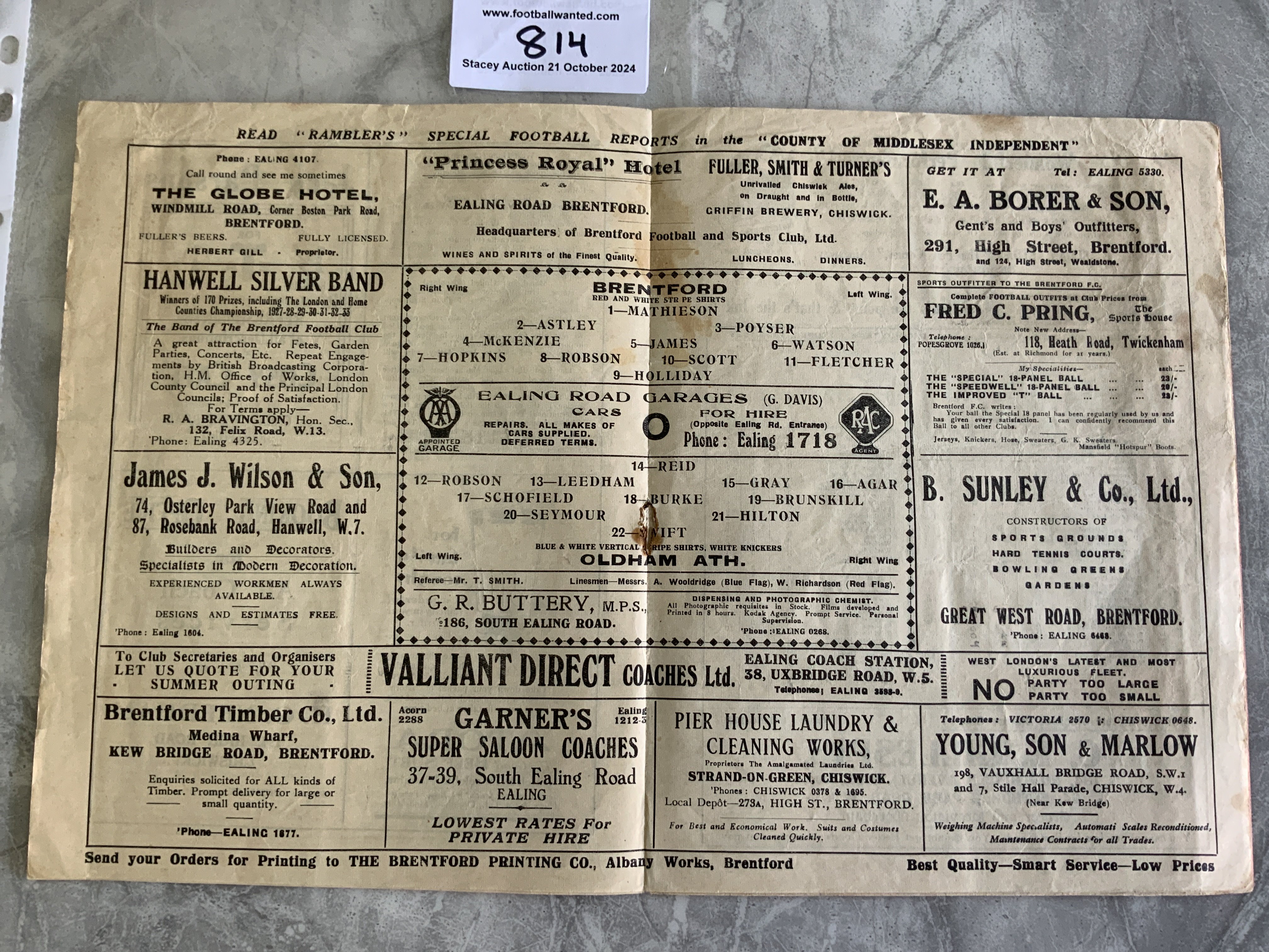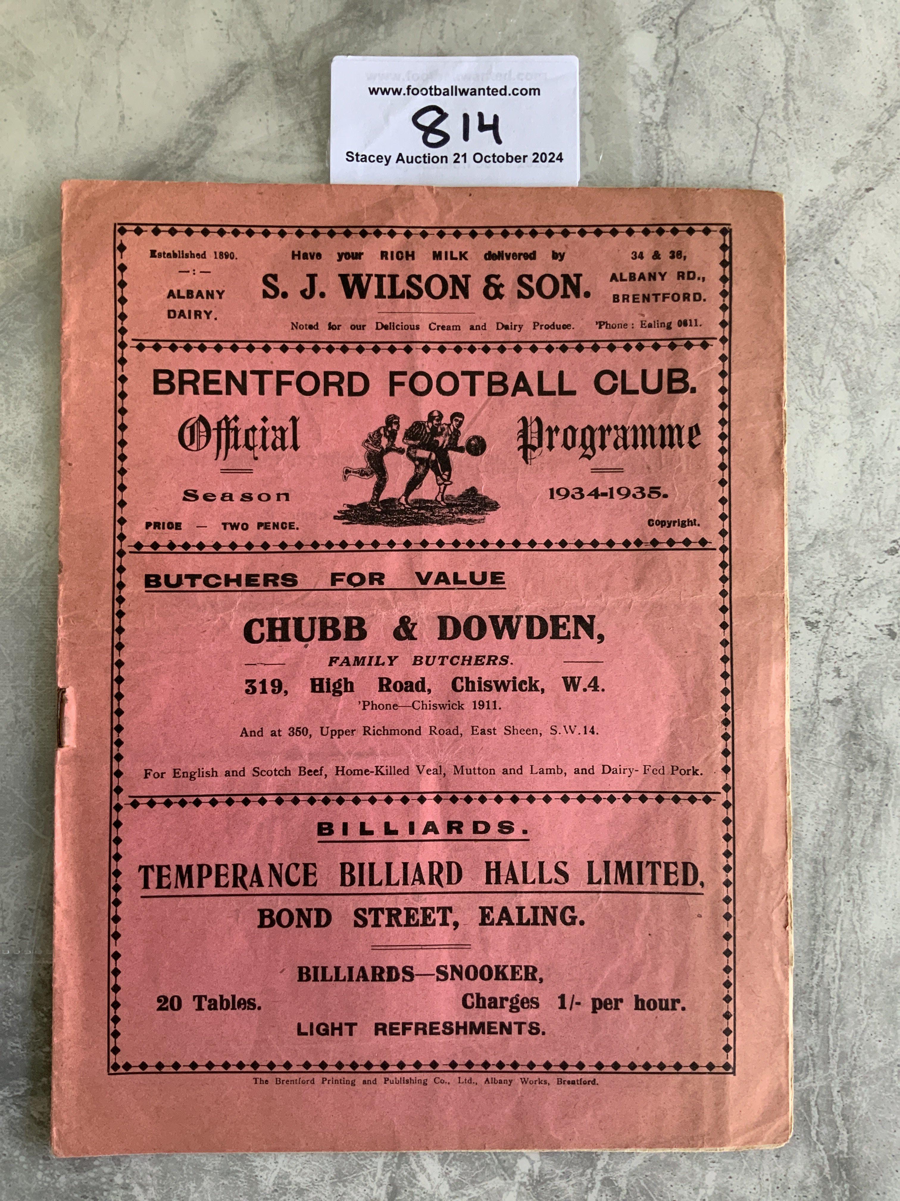 34/35 Brentford v Oldham Football Programme: Last of the big pink style in fair/good condition with no team changes. Staple removed leaving small hole.