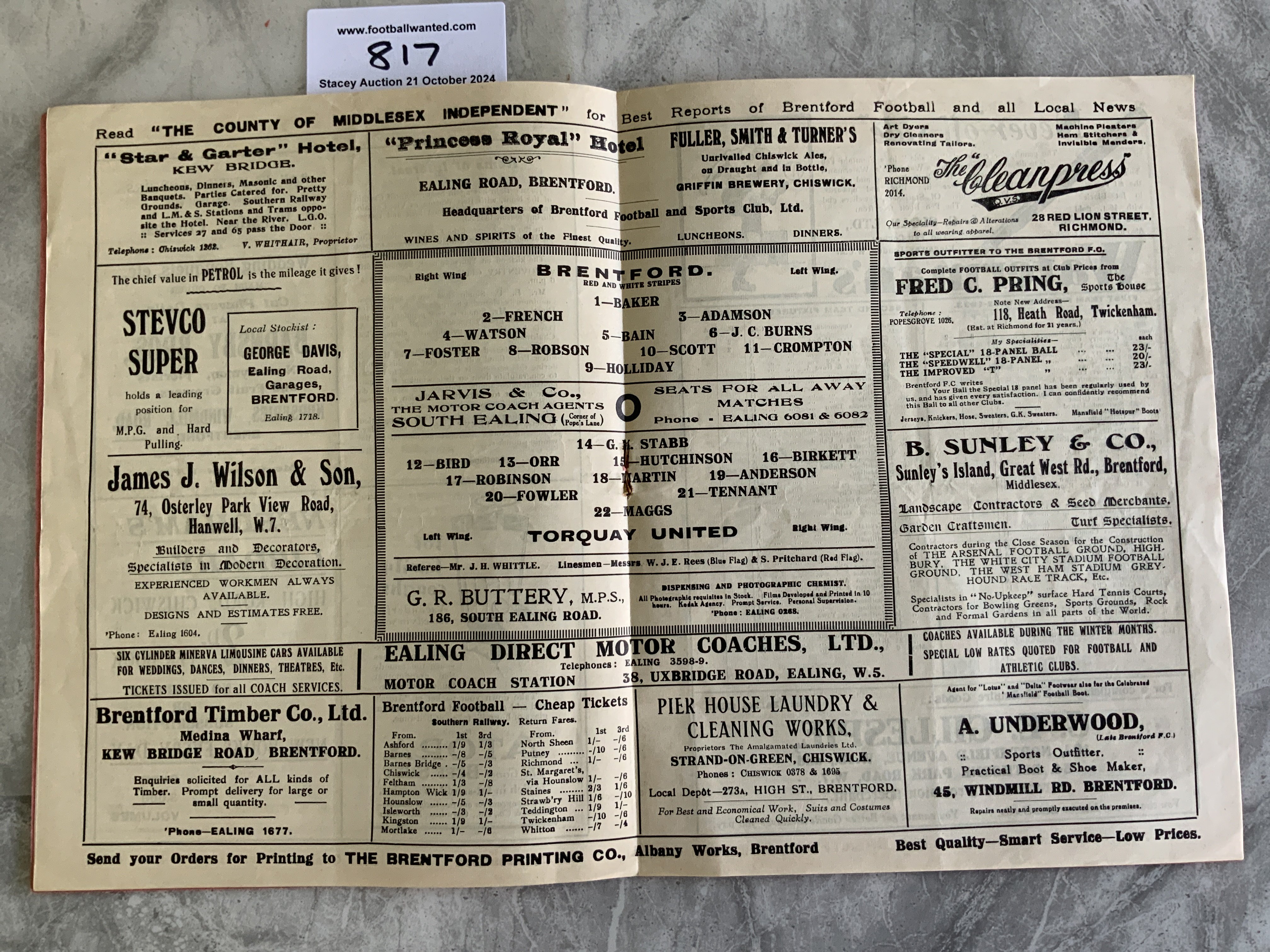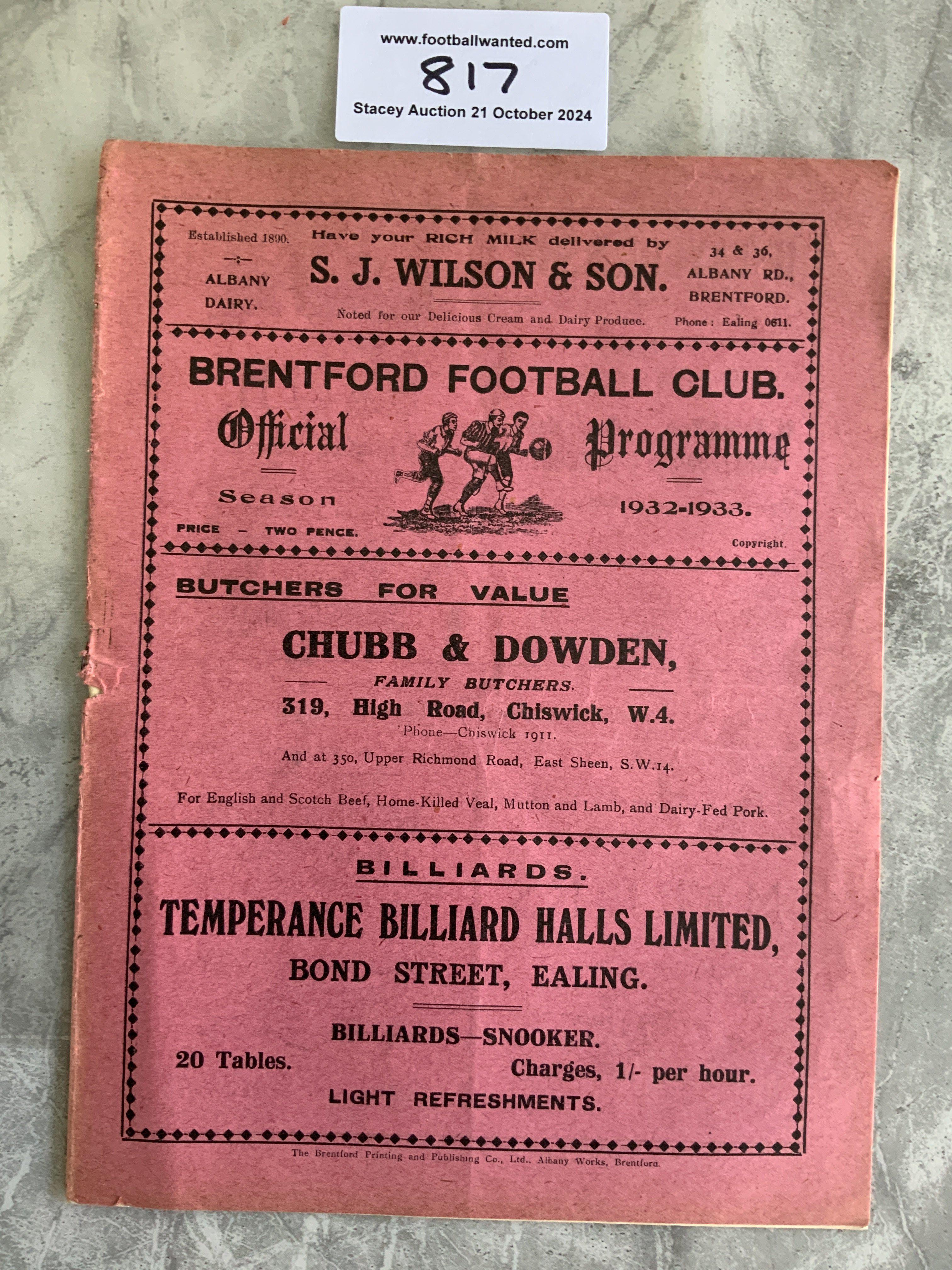 32/33 Brentford v Torquay United Football Programme: Large pink style in excellent condition with no team changes. Tiny tear in staple area.