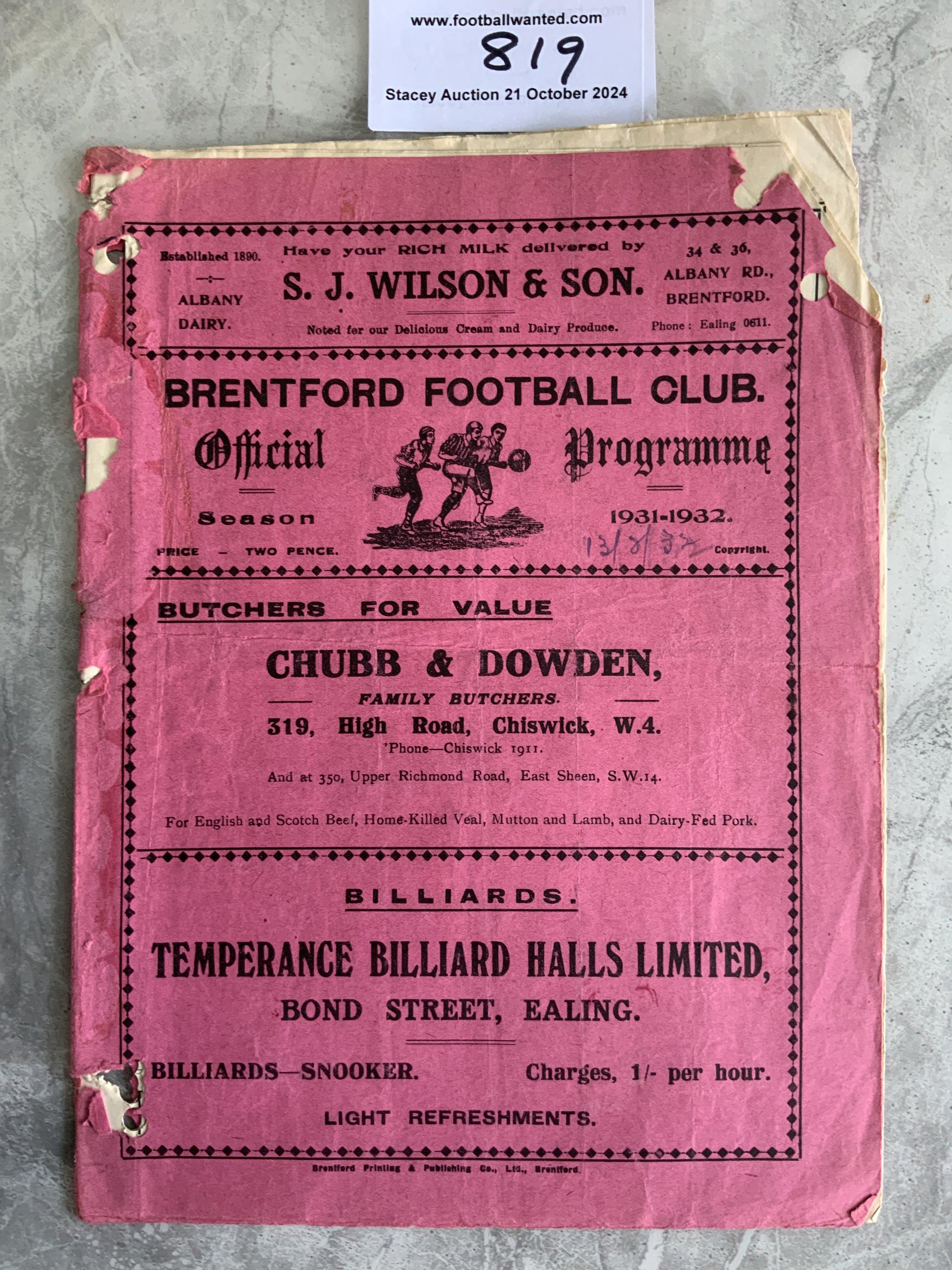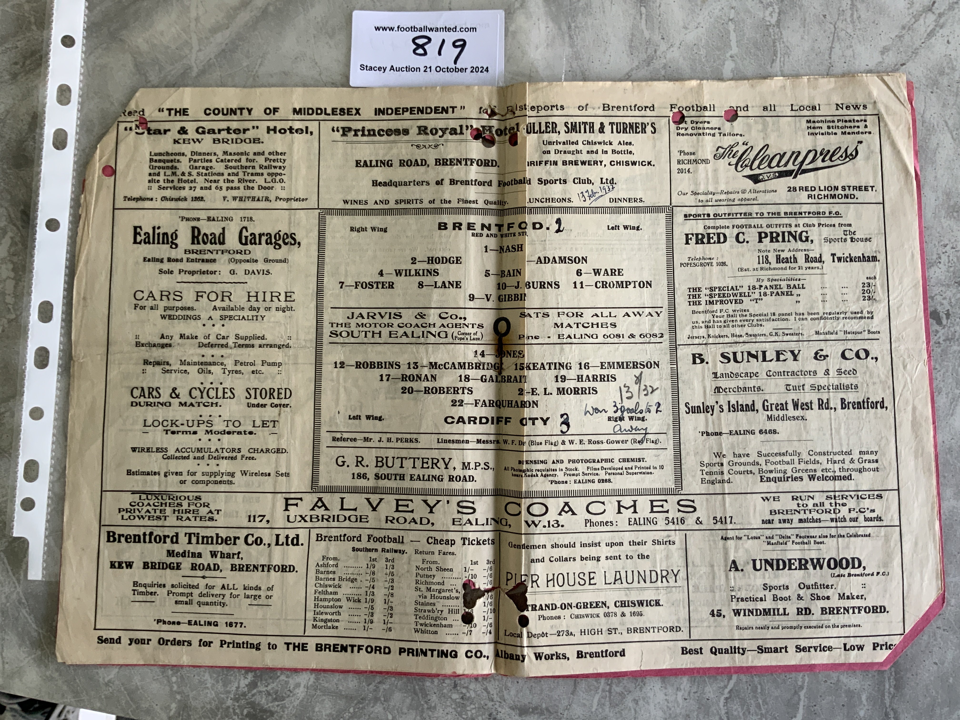 31/32 Brentford v Cardiff City Football Programme: Large pink style in poor condition with tears punch holes and paper loss.