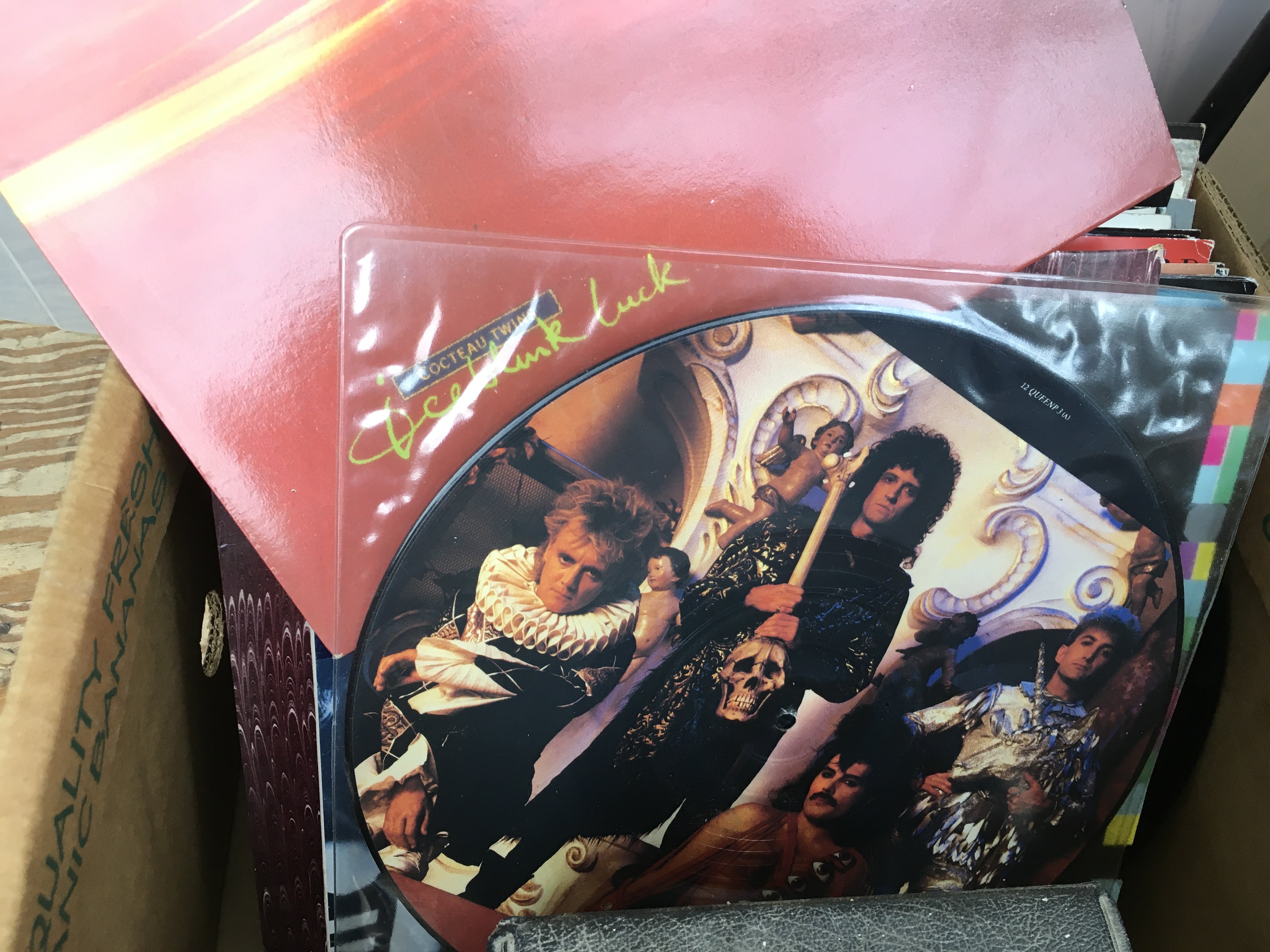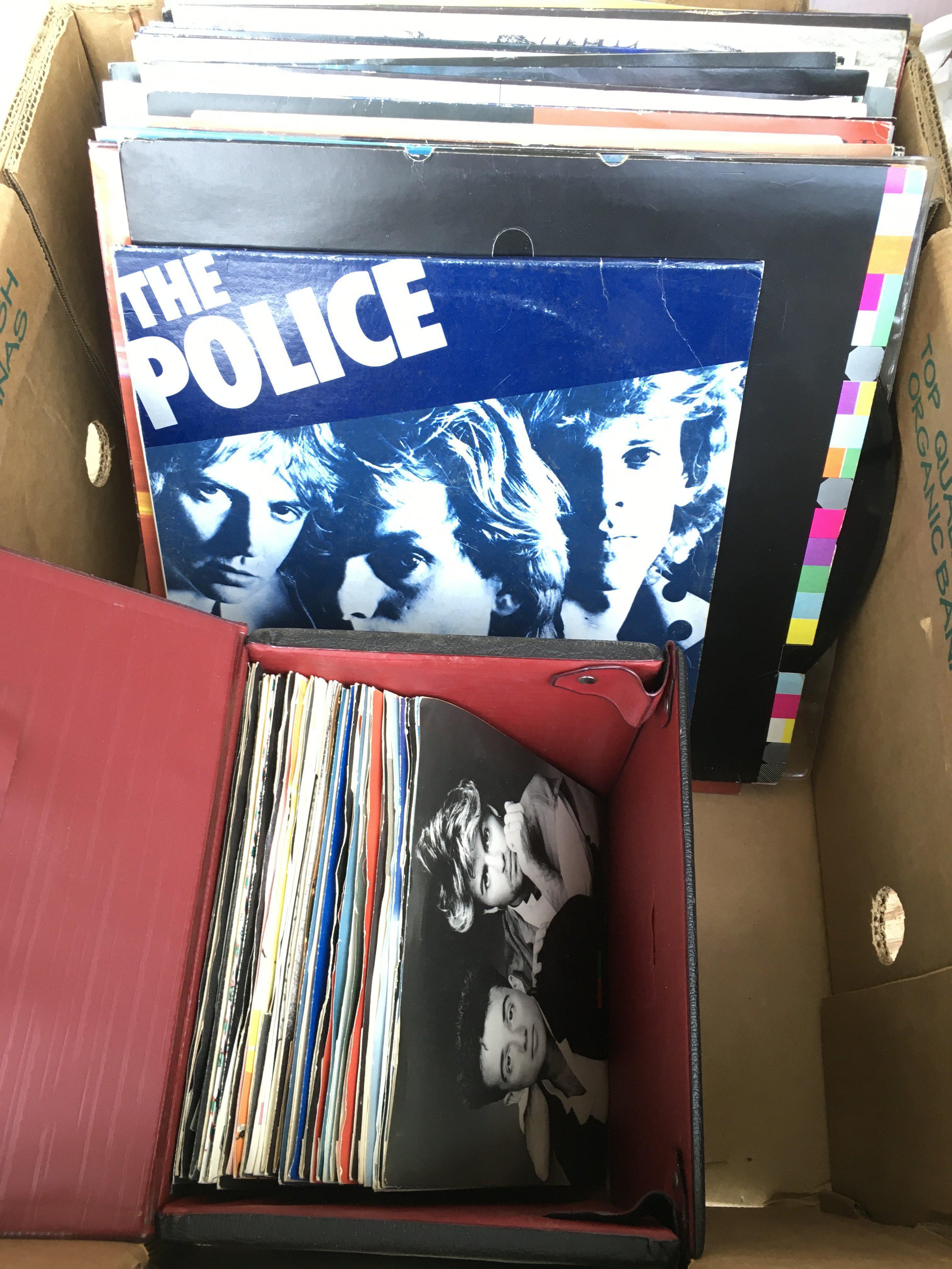 A box of mainly 1980s 7" and 12" singles by variouS artists including New Order, Cocteau Twins, The Pogues and others, also including a 2LP 10" 'Regatta De Blanc' LP by The Police.