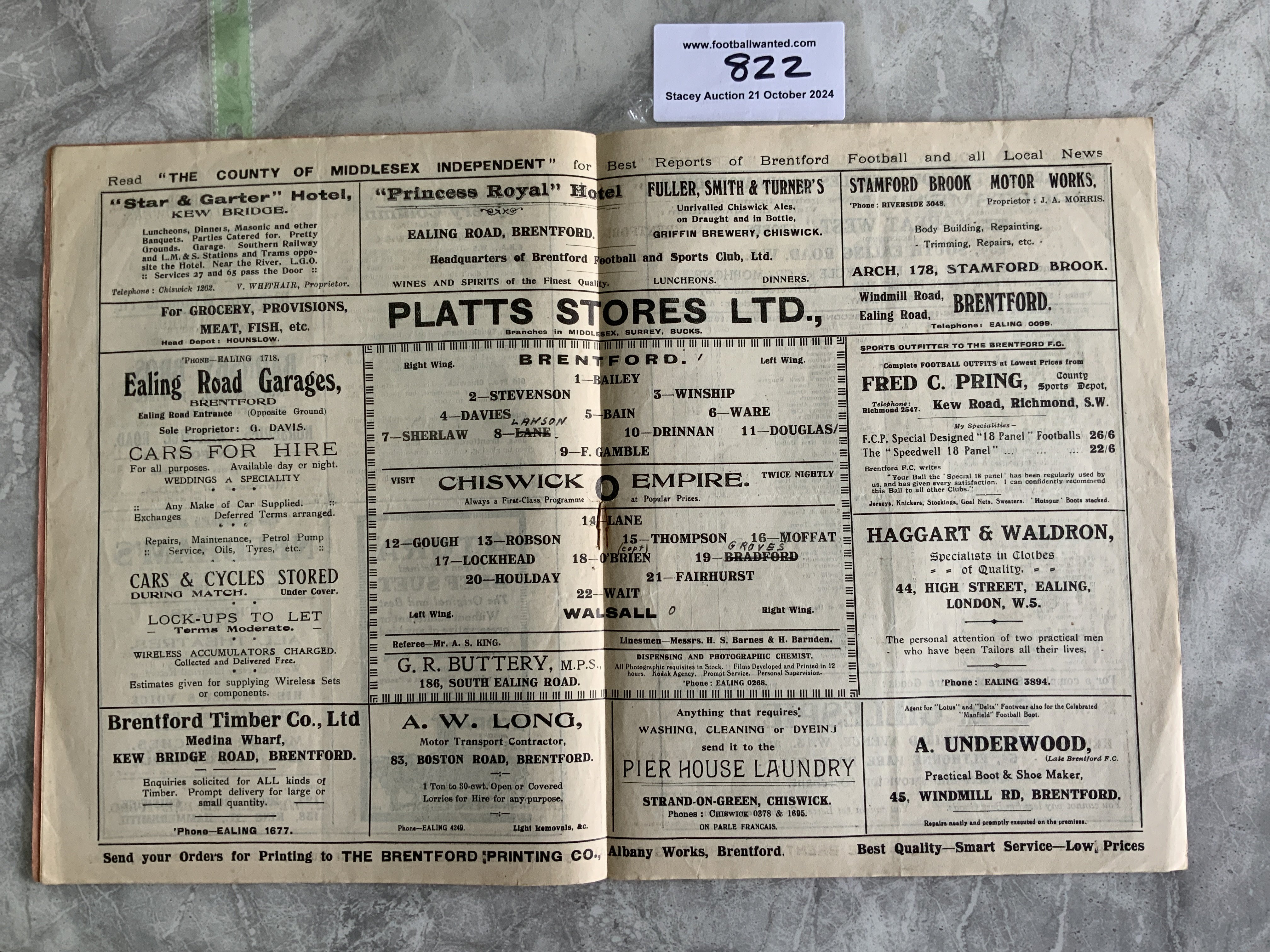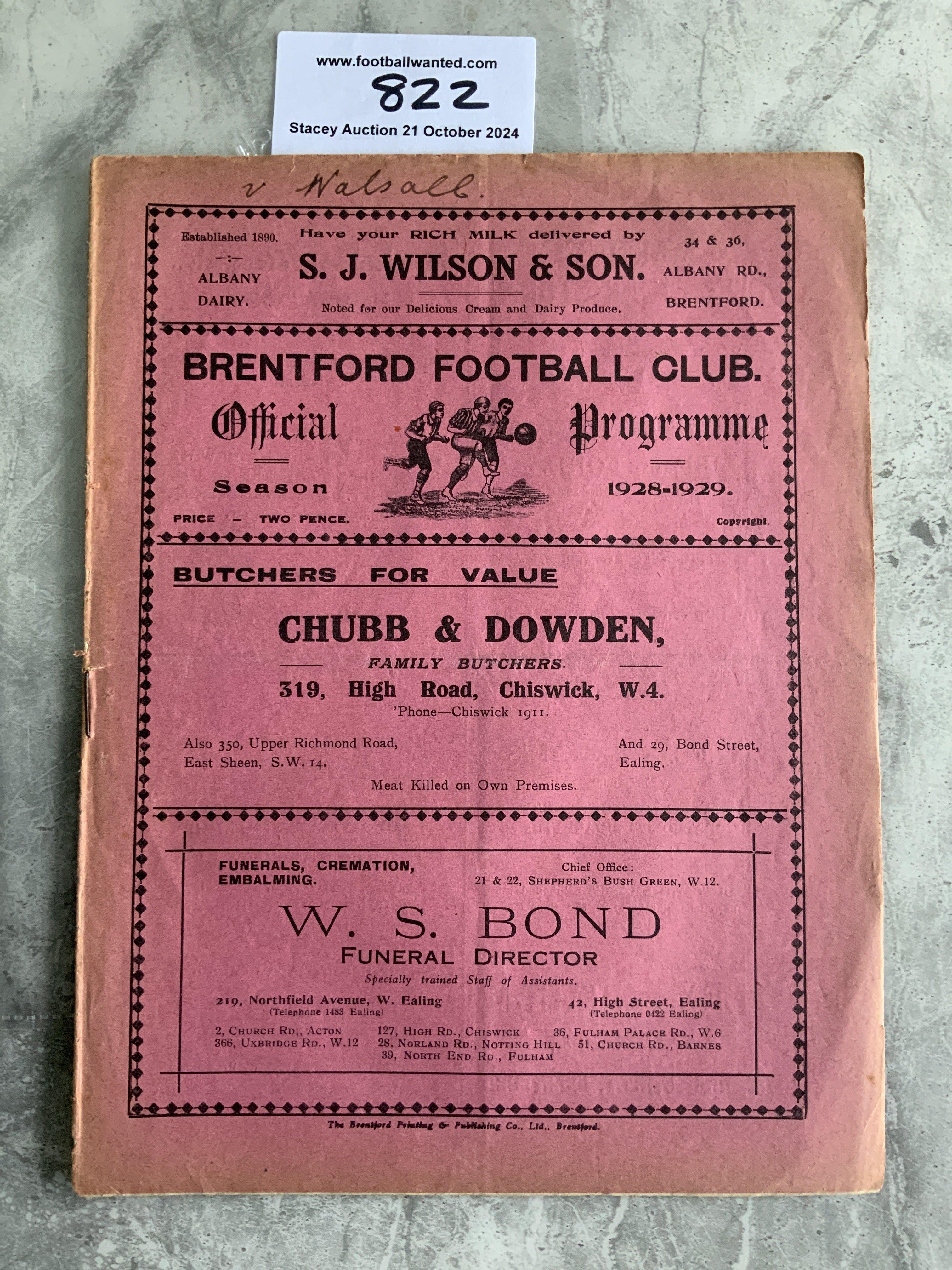 28/29 Brentford v Walsall Football Programme: Large pink style in good condition with team changes. The word Walsall written to border of cover.