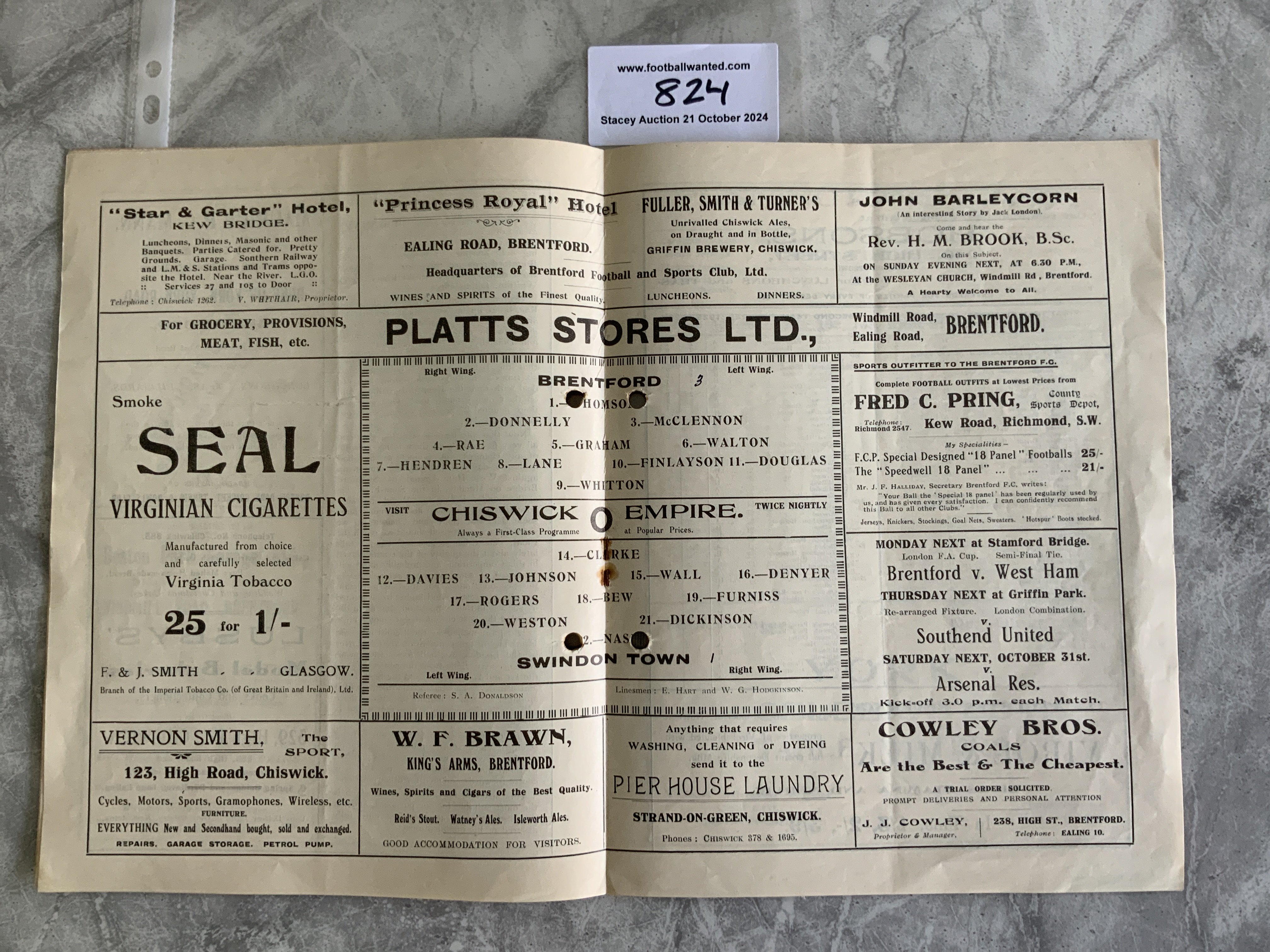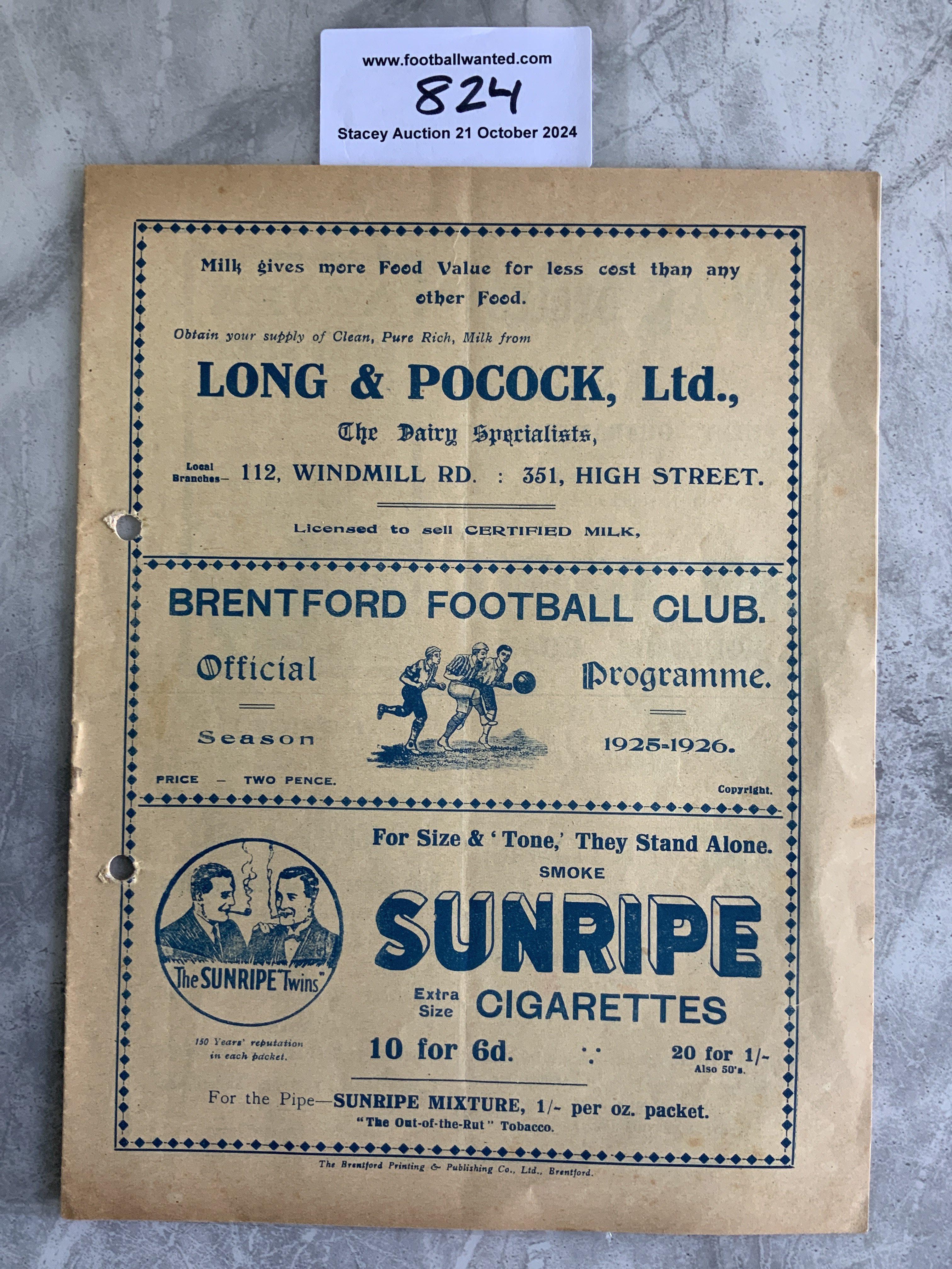 25/26 Brentford v Swindon Football Programme: Last of the cream style which has punch holes and a small bit of paper loss to rear border. No team changes but score written inside.