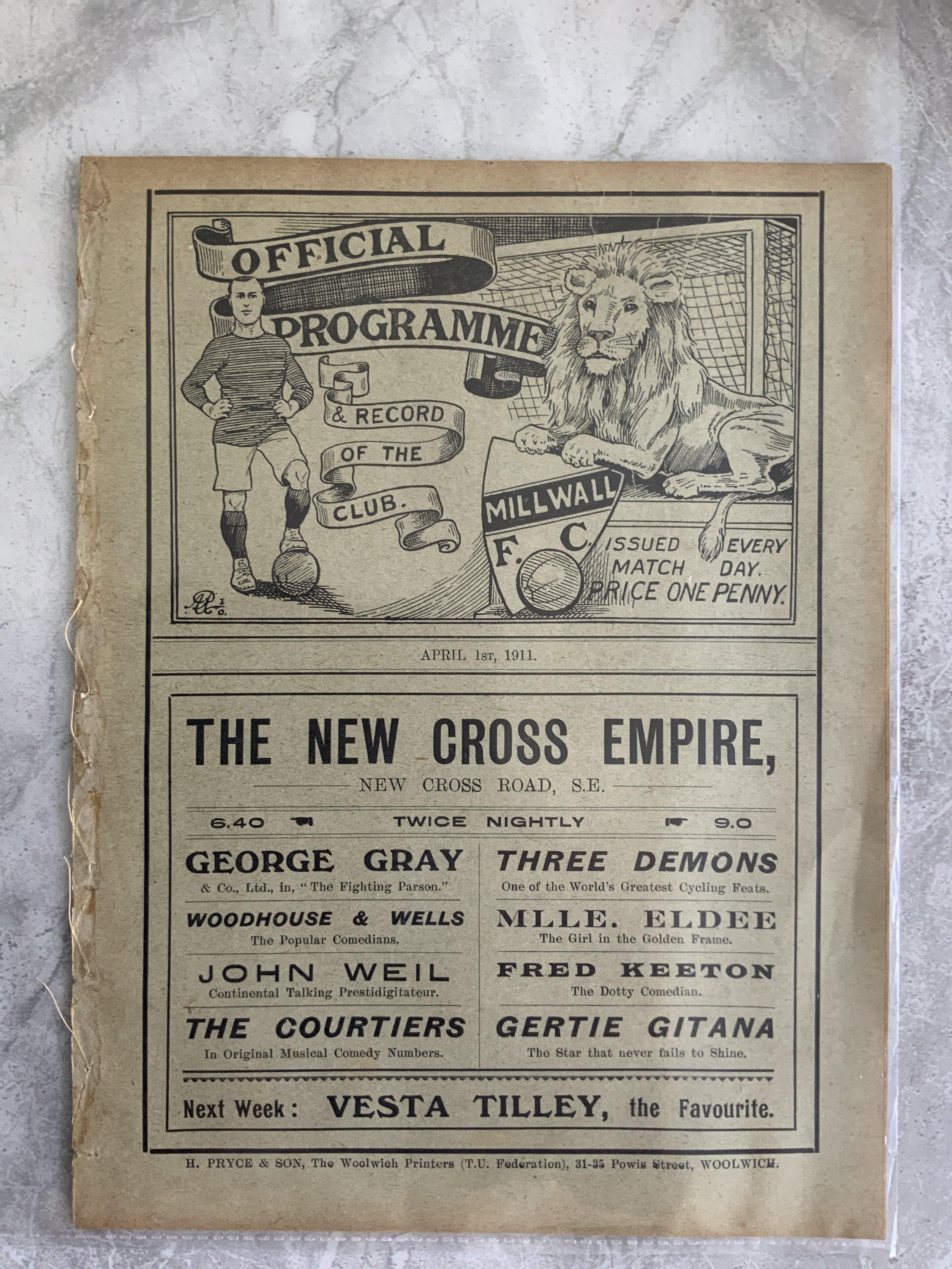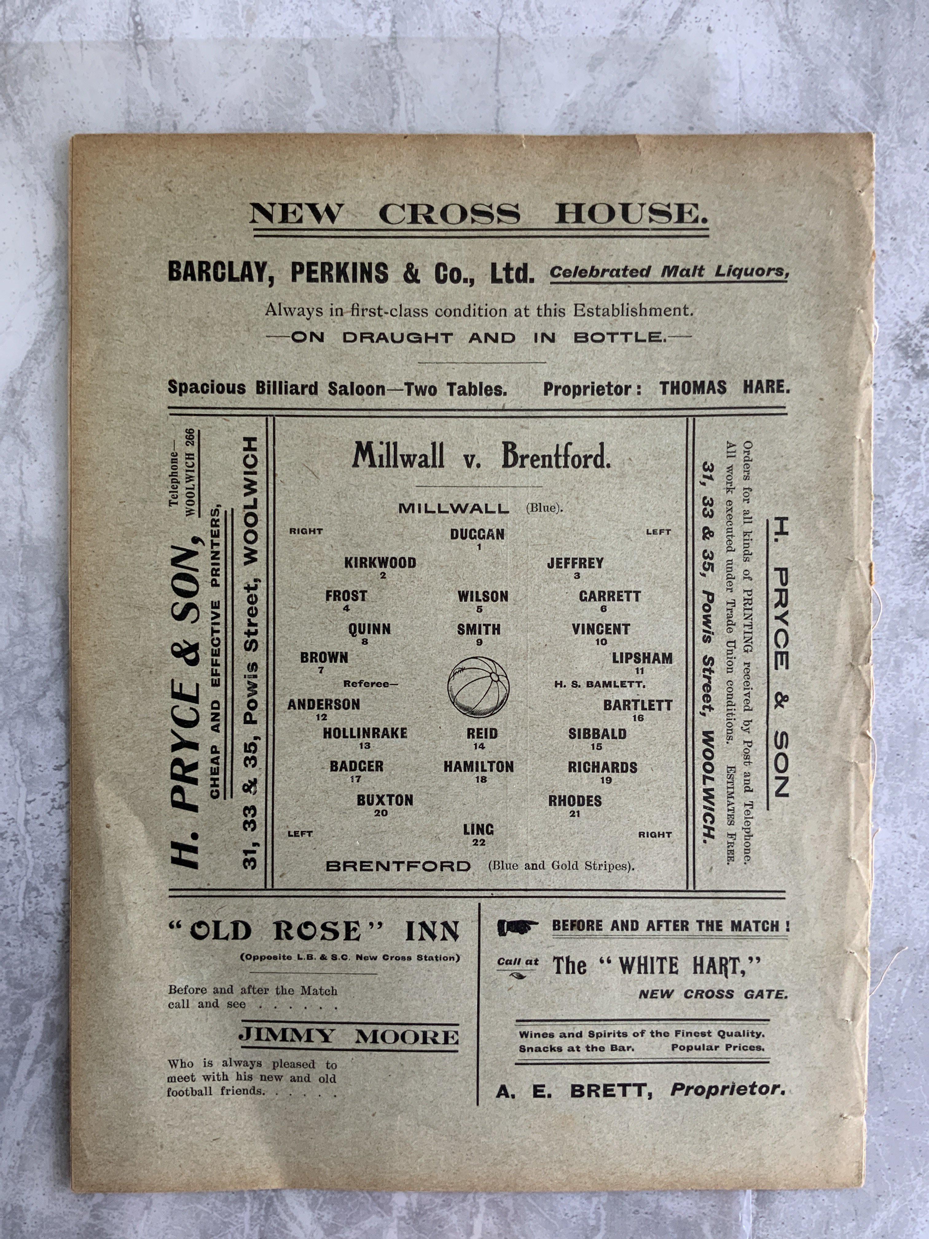 1910 - 1911 Millwall v Brentford Football Programme: Ex bound in good condition with no team changes. First team Southern League match with covers intact.