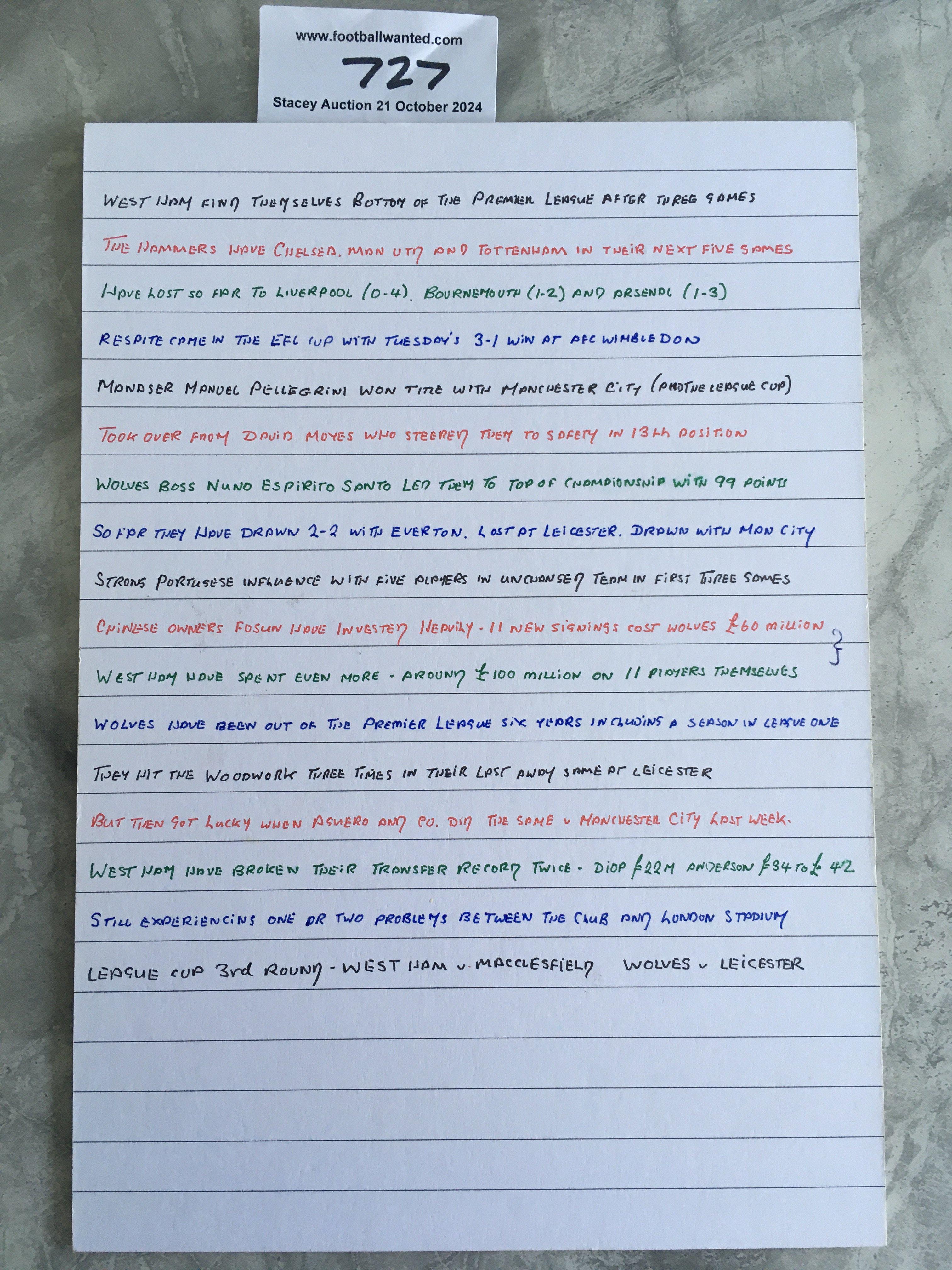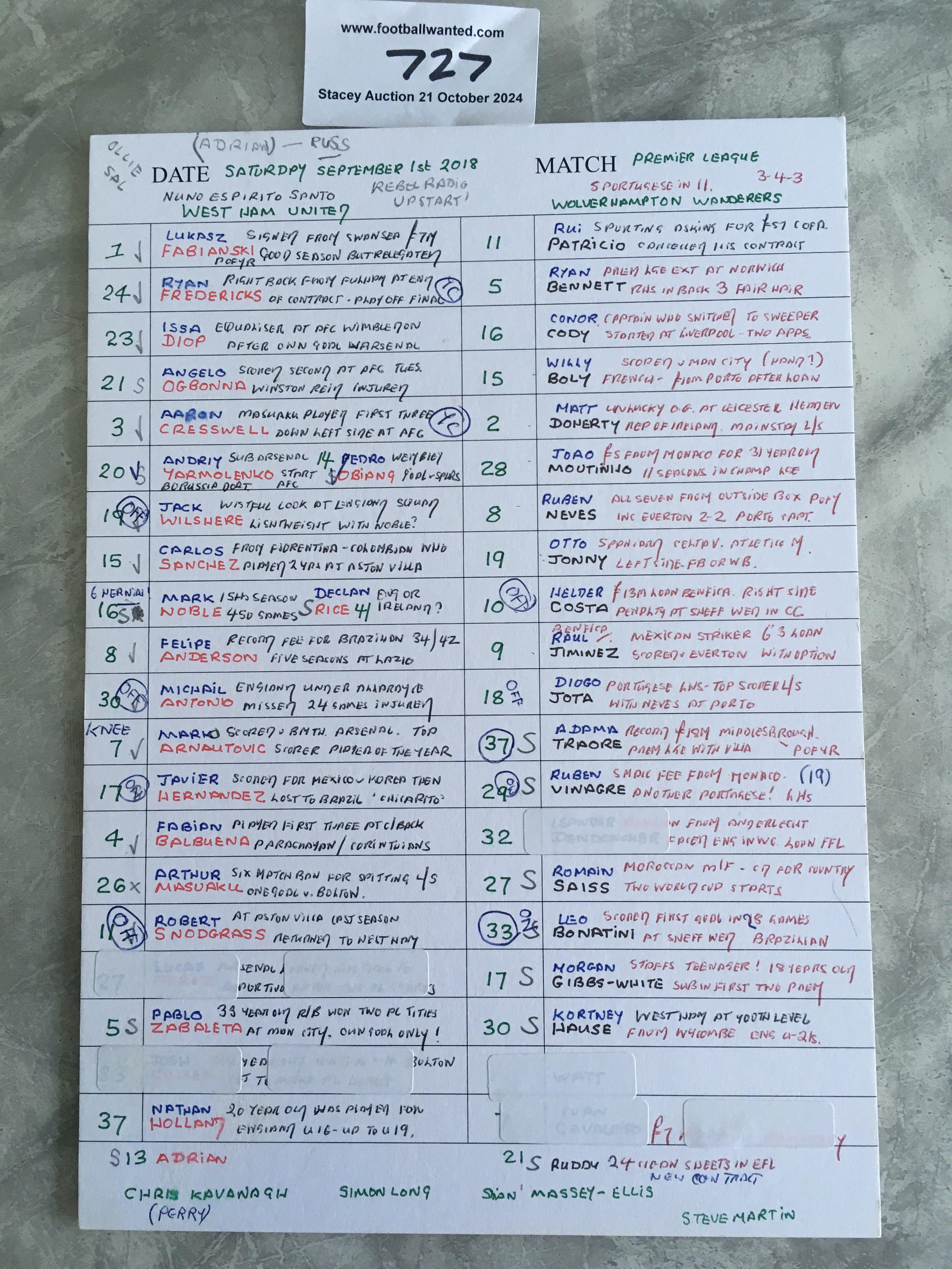 John Motsons Notes For West Ham v Wolves Football Match: Match dated 1 9 2018 which consist of hand written notes on A4 card regarding each player and facts to mention on the rear regarding teams. Hand written as always by his wife.