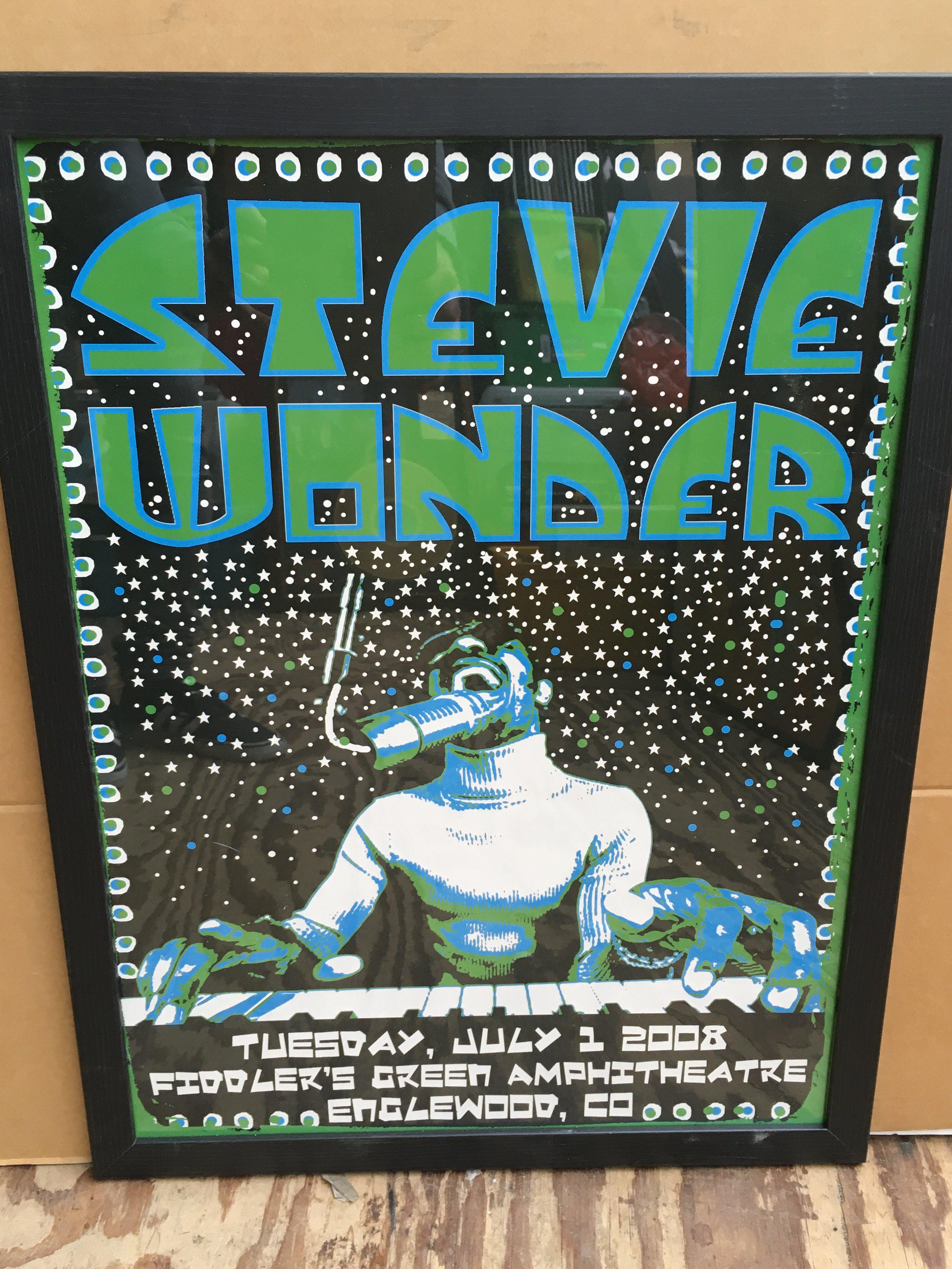 A Stevie Wonder poster advertising an appearance at Fiddler's Green Amphitheatre, Englewood on Tuesday, 1st July 2008, approx 51cm x 66cm.
