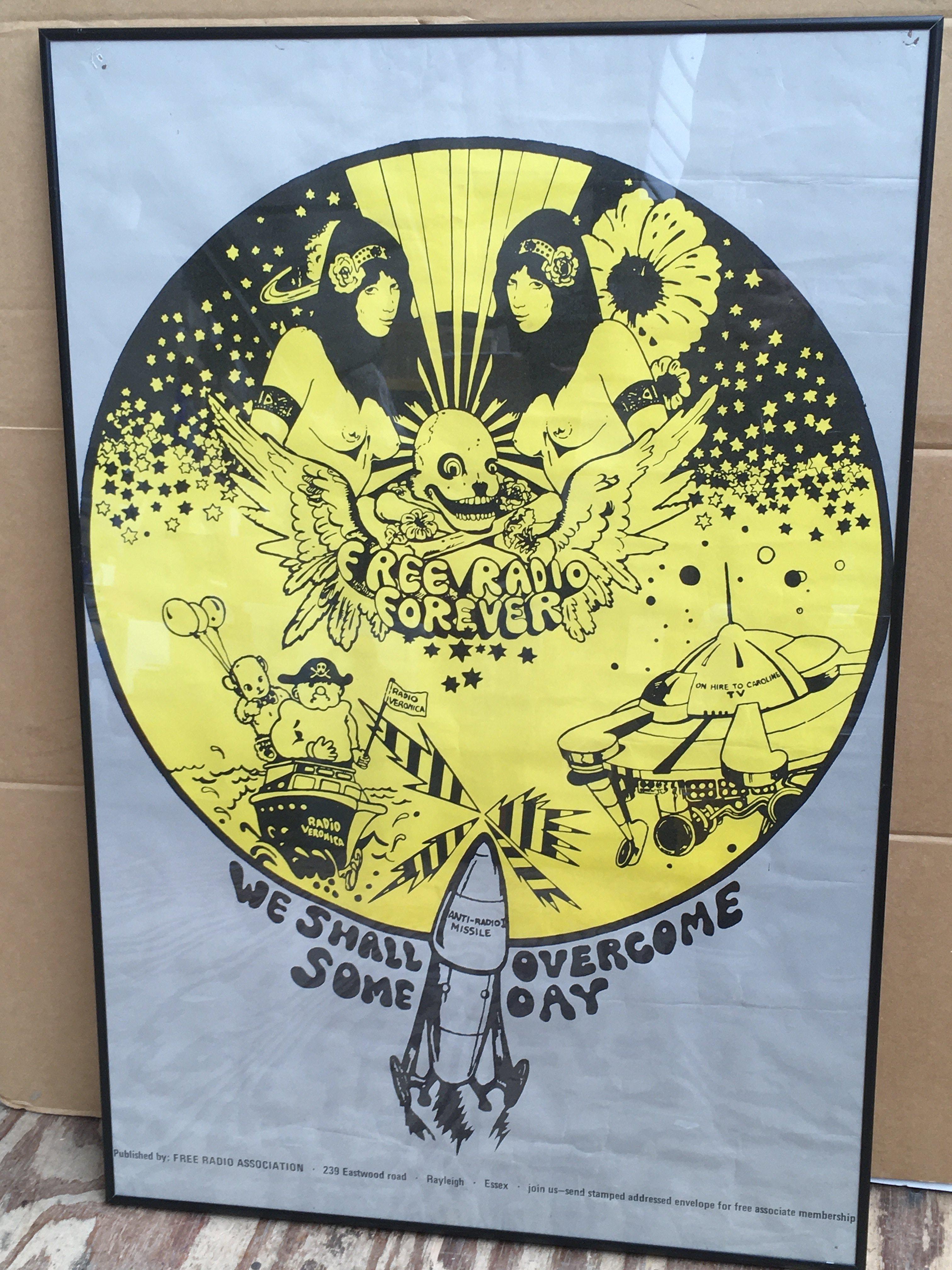 A framed and glazed pirate radio psychedelic poster published by the Free Radio Association, 239 Eastwood Road, Rayleigh, Essex, approx 51cm x 77cm.