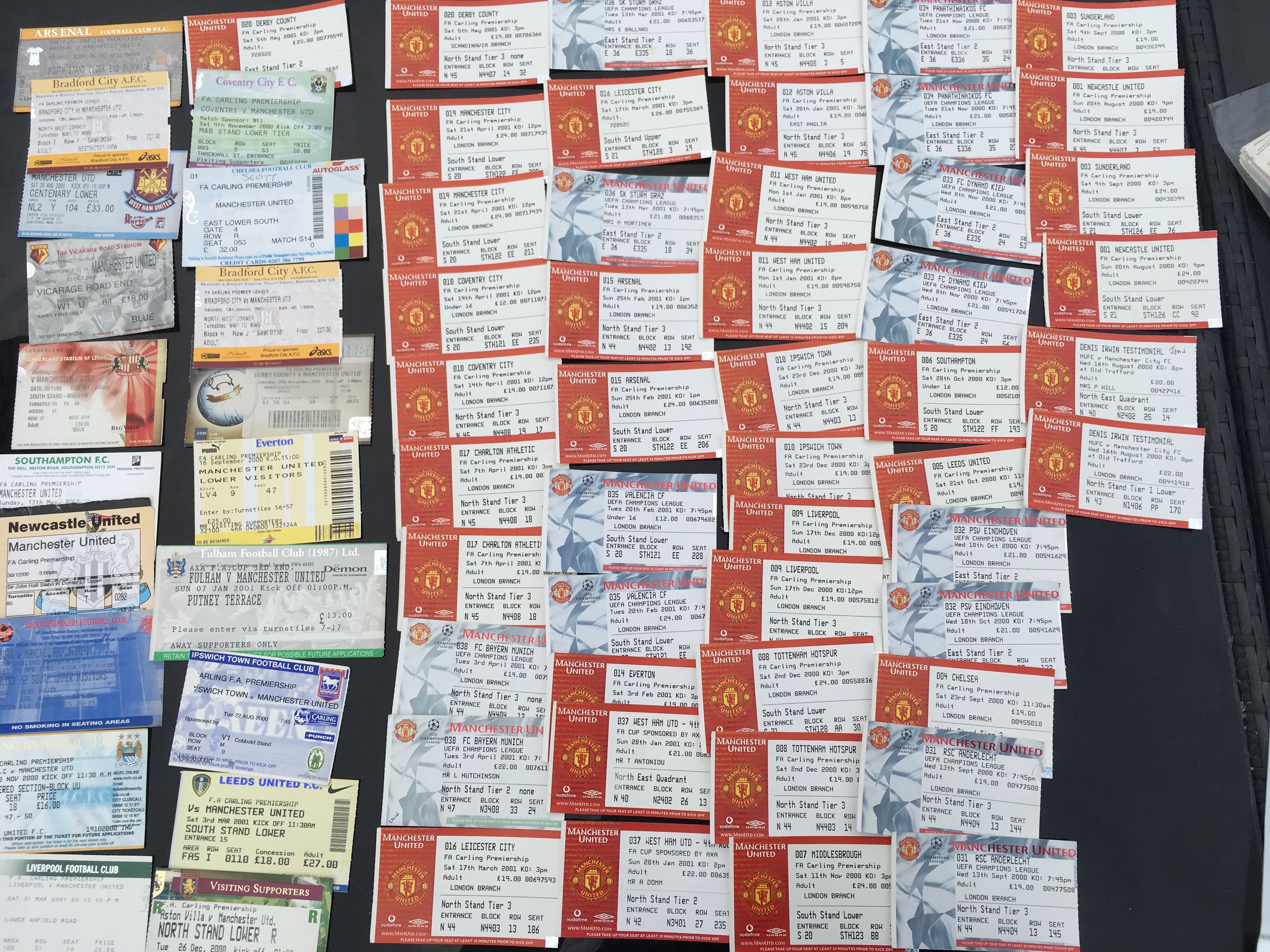2000/2001 Manchester United Football Tickets: 49 home tickets and 19 away tickets in good condition with duplication. (68)