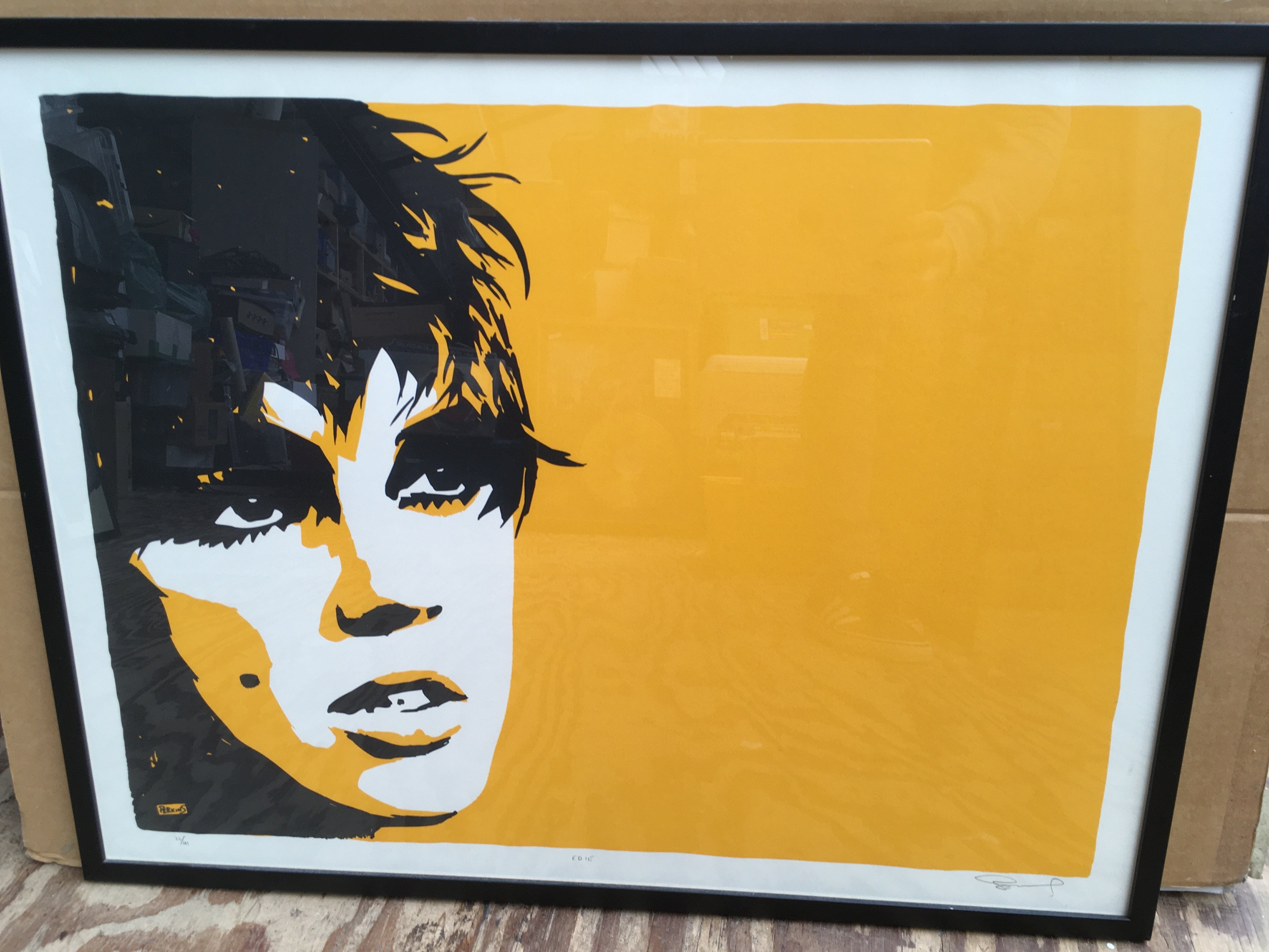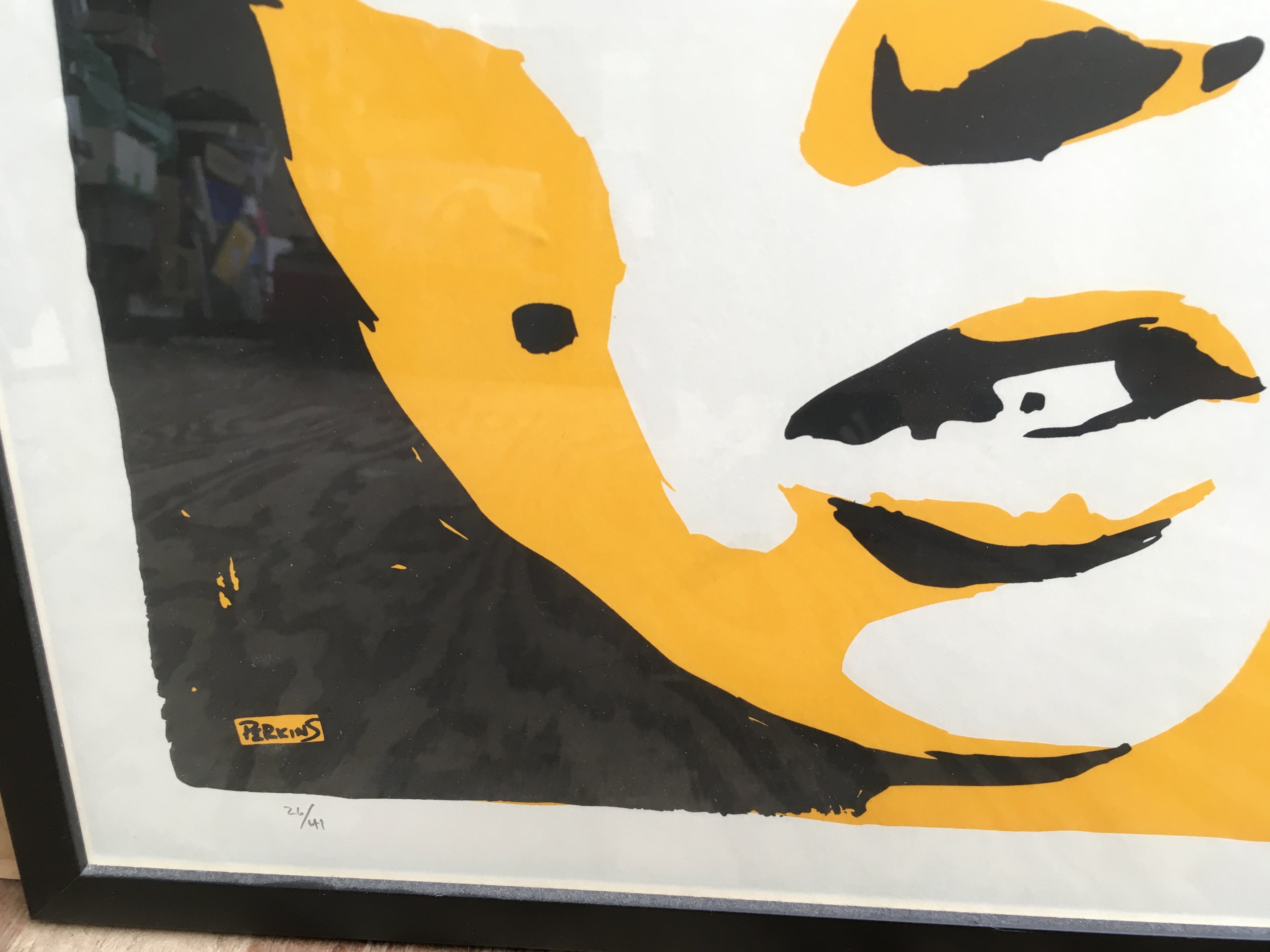 A framed and glazed limited edition, signed and numbered pop art print by Perkins titled 'Edie', numbered 26/41, approx 68.5cm x 53.5cm.