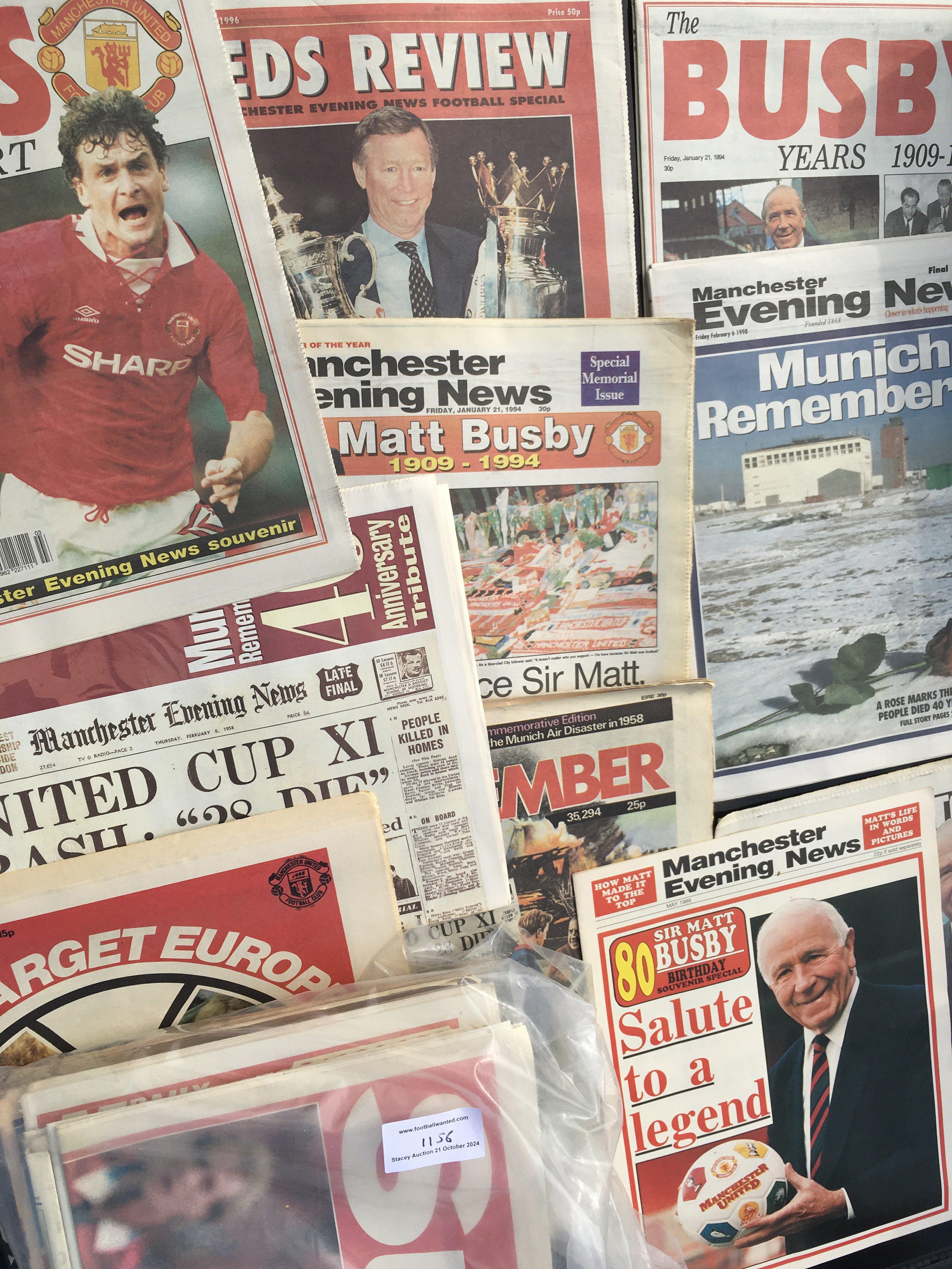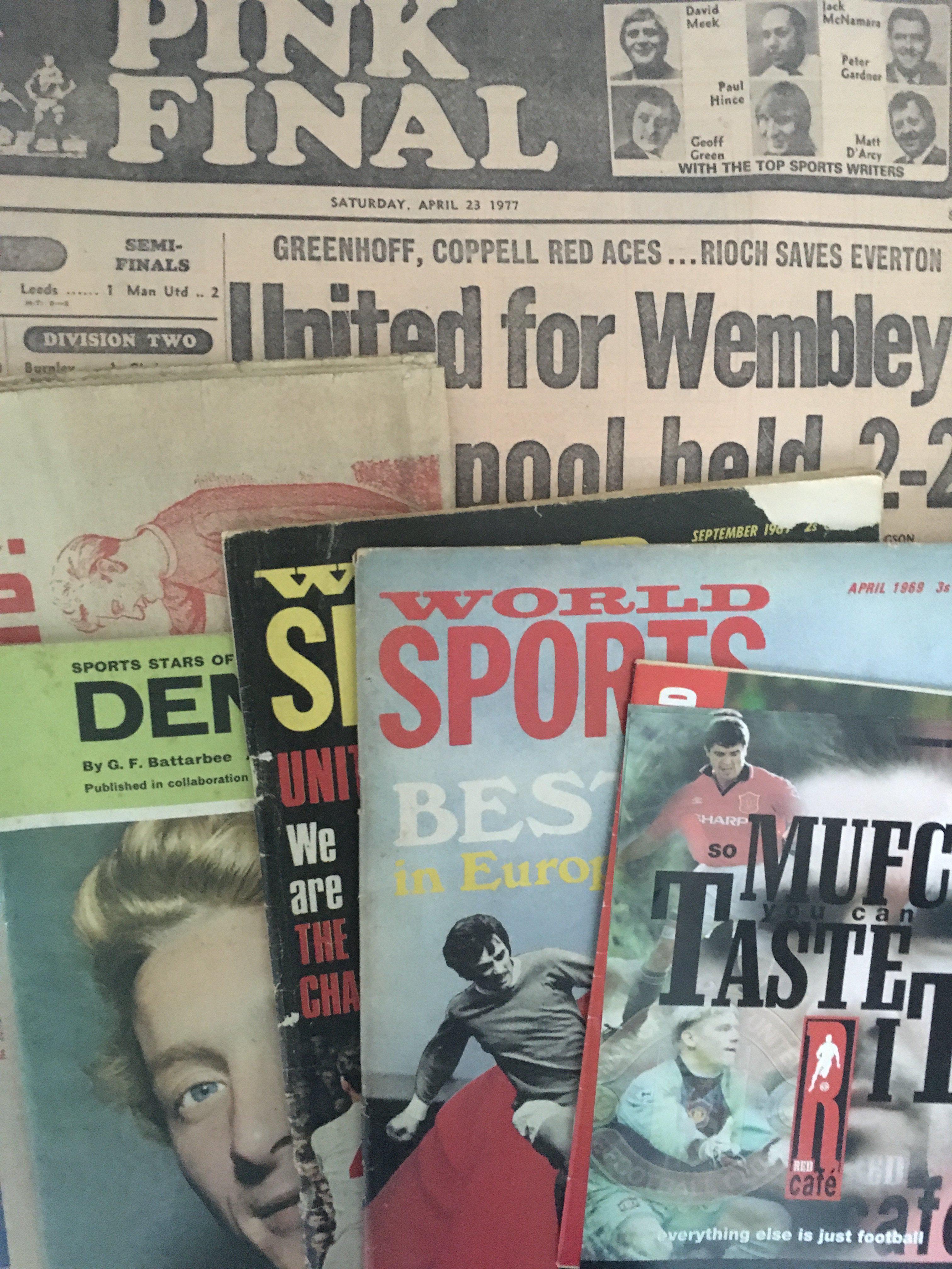 Manchester United Cup Winning Football Newspaper Collection: 35 newspapers and magazines featuring success between 1989 and 1999. Interesting. C/W some Manchester United books and a quantity of old newspapers some relating to Manchester United. (2 boxes)