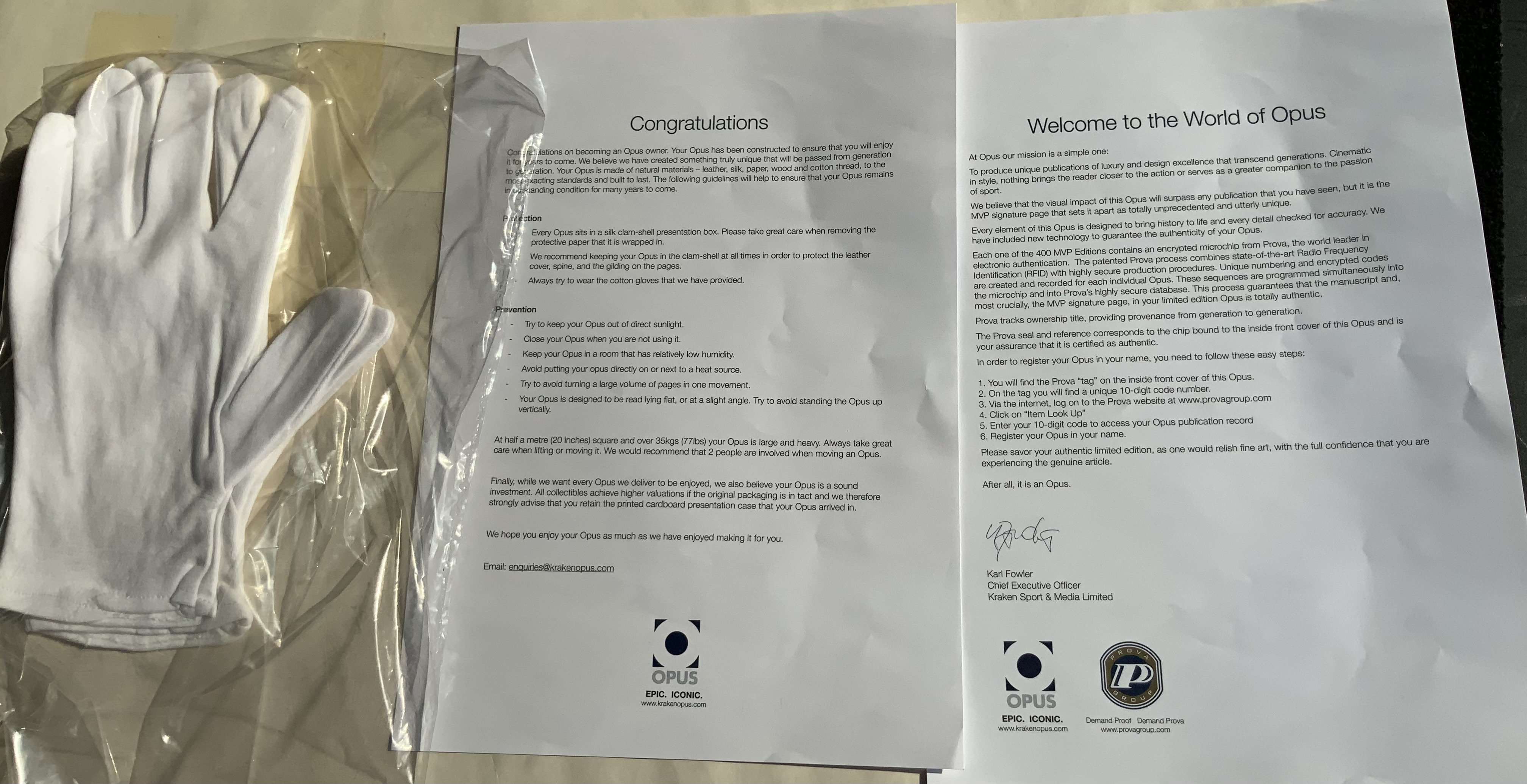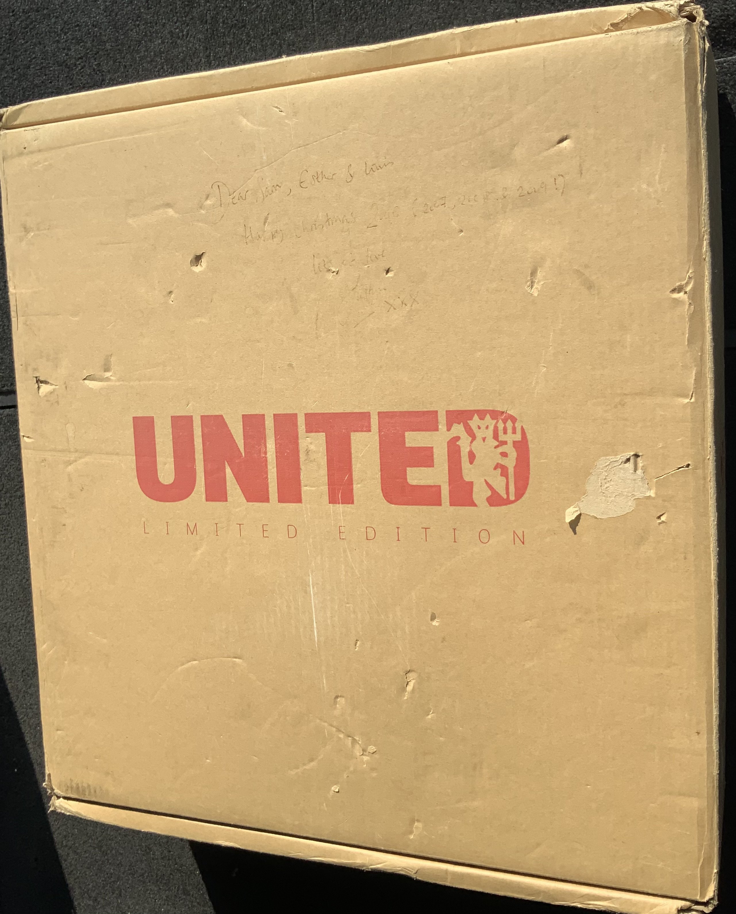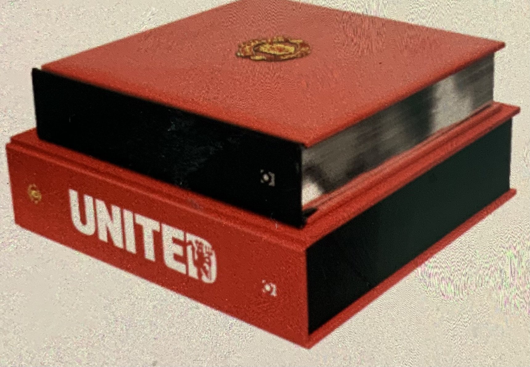 Manchester United Rare Opus Unopened Boxed Football Book: Limited edition stunning heavy book. We have not opened the book as its still sealed but online we have a stock photograph of the book as we did not want to remove it. Leather bound by hand printed on silk coated paper. Over 2000 images each individually varnished. 60 x 60 x 14 cm and an almost unliftable 37 kilos. This will undoubtedly be signed by Ferguson and Charlton and possibly others. We have been informed this cost 3k new.