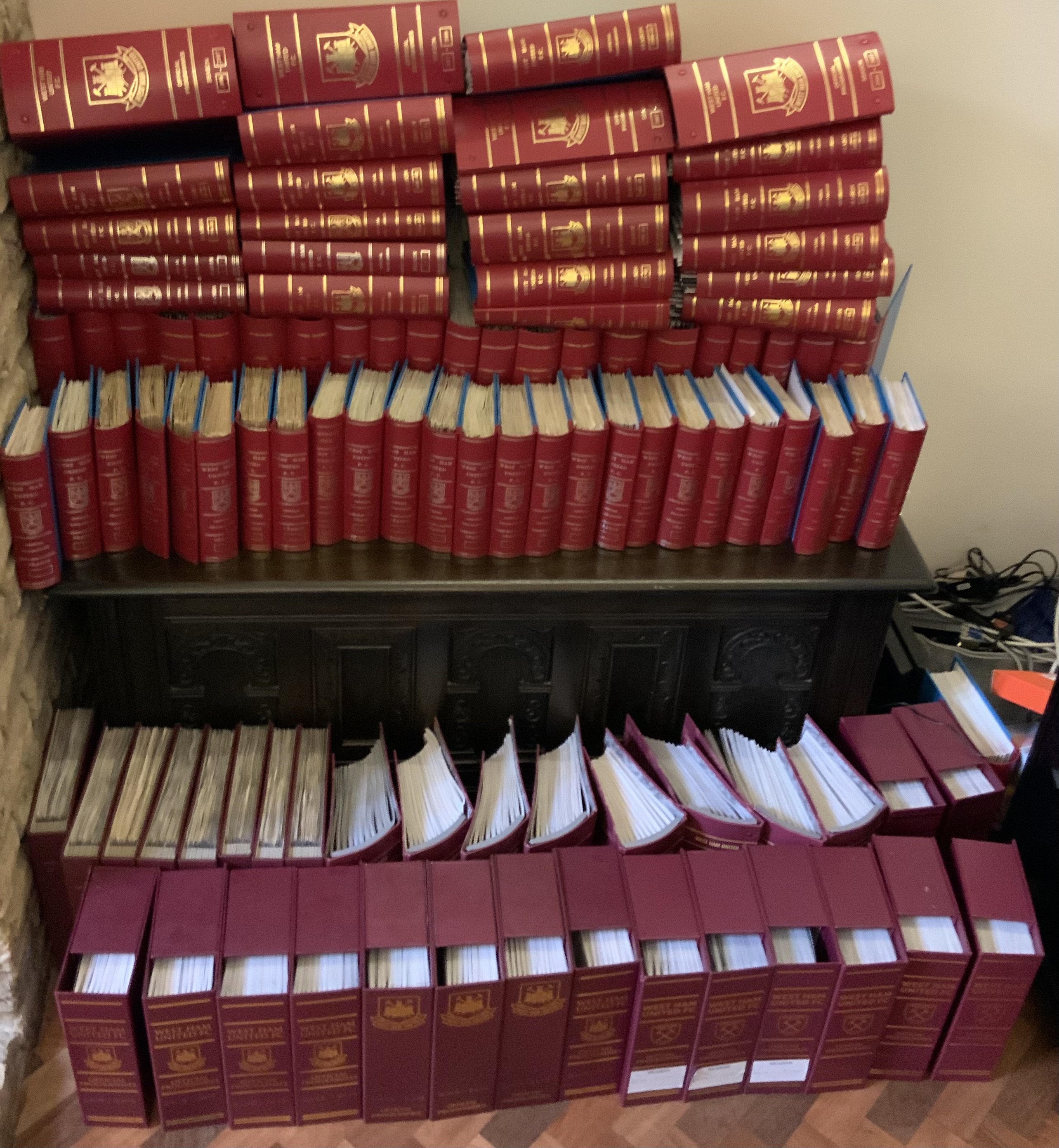West Ham Complete Home Football Programme Collection: From 50/51 to 2019/2020 nicely displayed in collectors binders. This incredible collection includes most reserves youth etc but they are copies as are all programmes from 50/51 to 57/58 which are displayed in folders. When the small programmes start in 58/59 they go through with first team matches to 2019/2020 in official binders and are possibly complete. Reserves in this period are copies. Collectors book included. Comprehensive attractive lot that must be viewed.