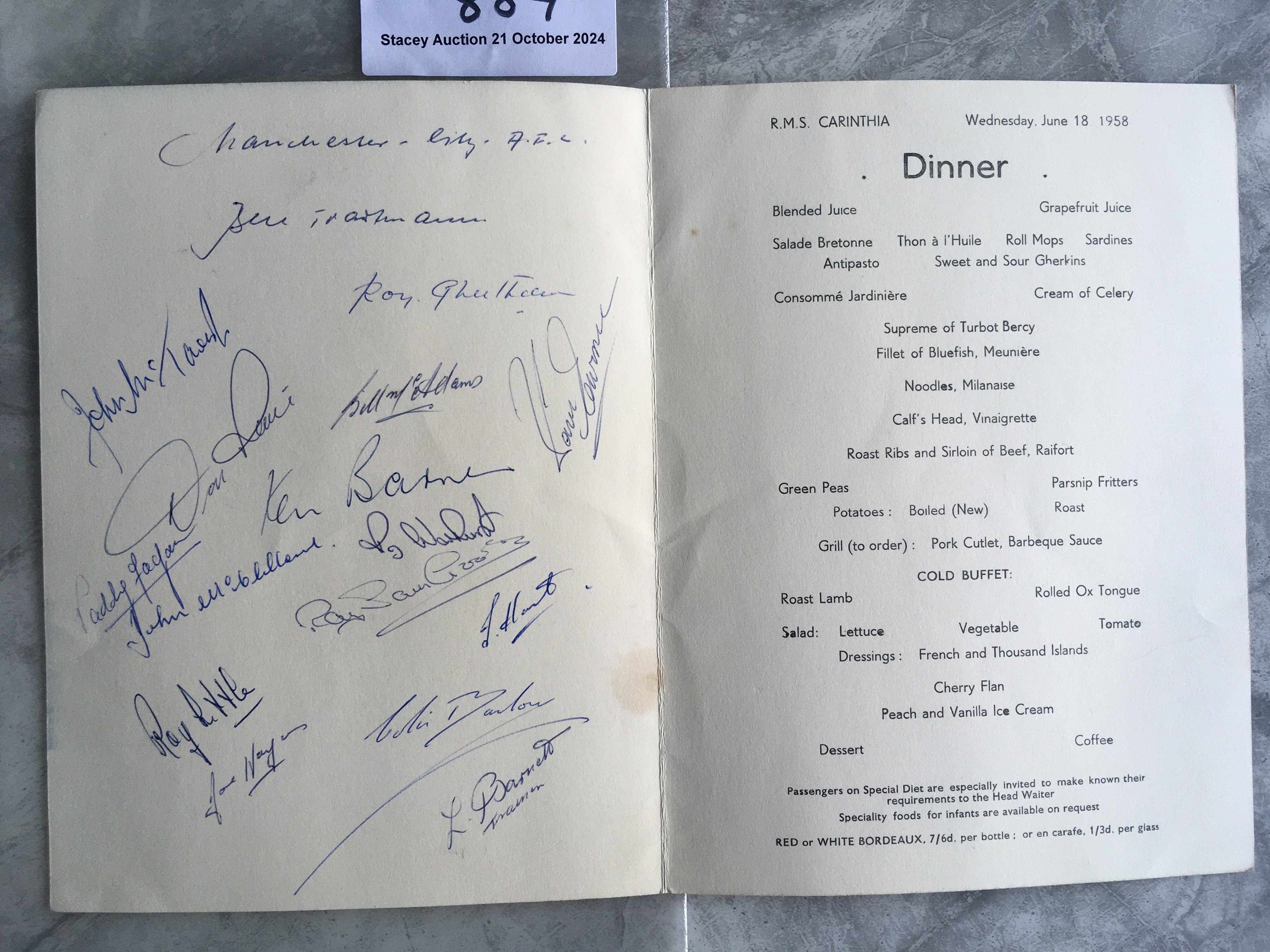 Manchester City 1958 Cunard Signed Football Tour Menu: 4 page card with Cunard ship to cover dated 18 6 1958. Inside page is signed by 16 of the Canadian tour party. Includes Trautmann McTavish Little Hayes Hart McClelland Barlow Fagan Sambrook Barnes and others. In this auction we also have two programmes from this tour not included in this lot.