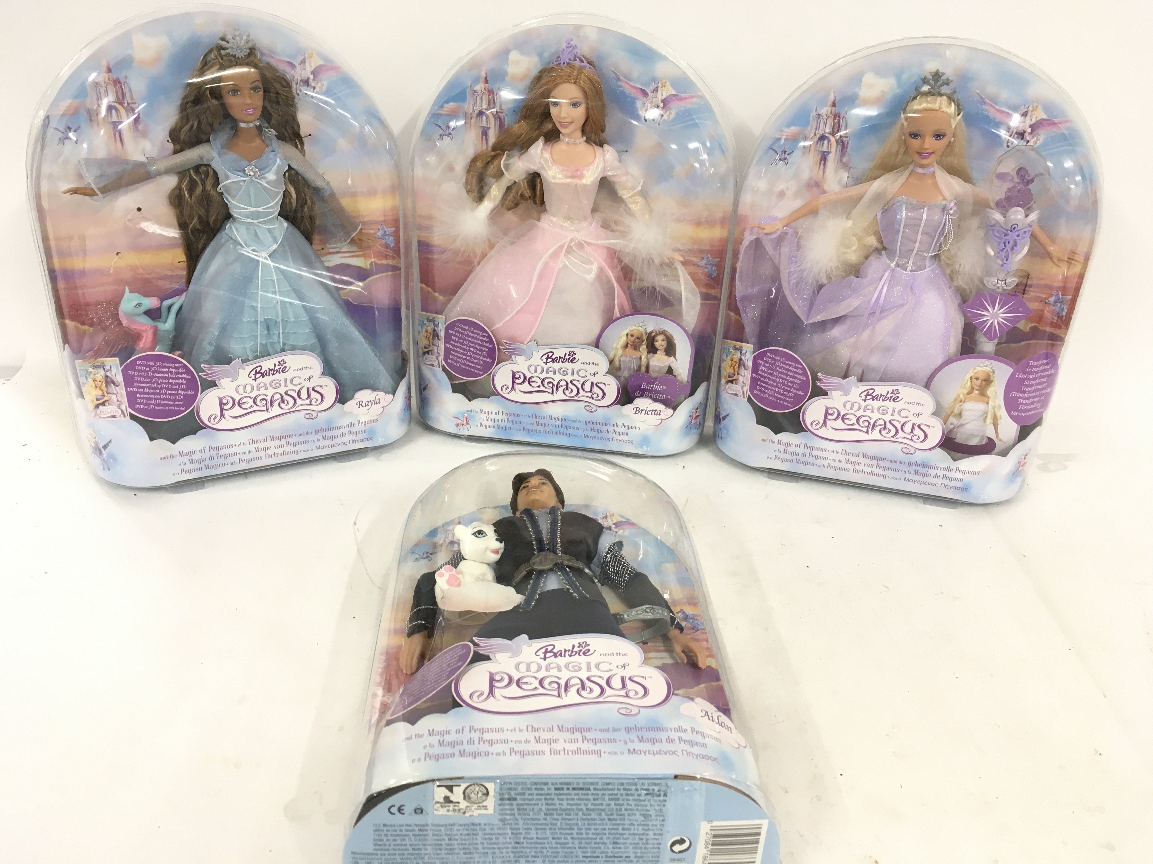 A collection of four boxed Barbie figures from the Magic of Pegasus series featuring Rayla..Brietta..Barbie..Adam (4)