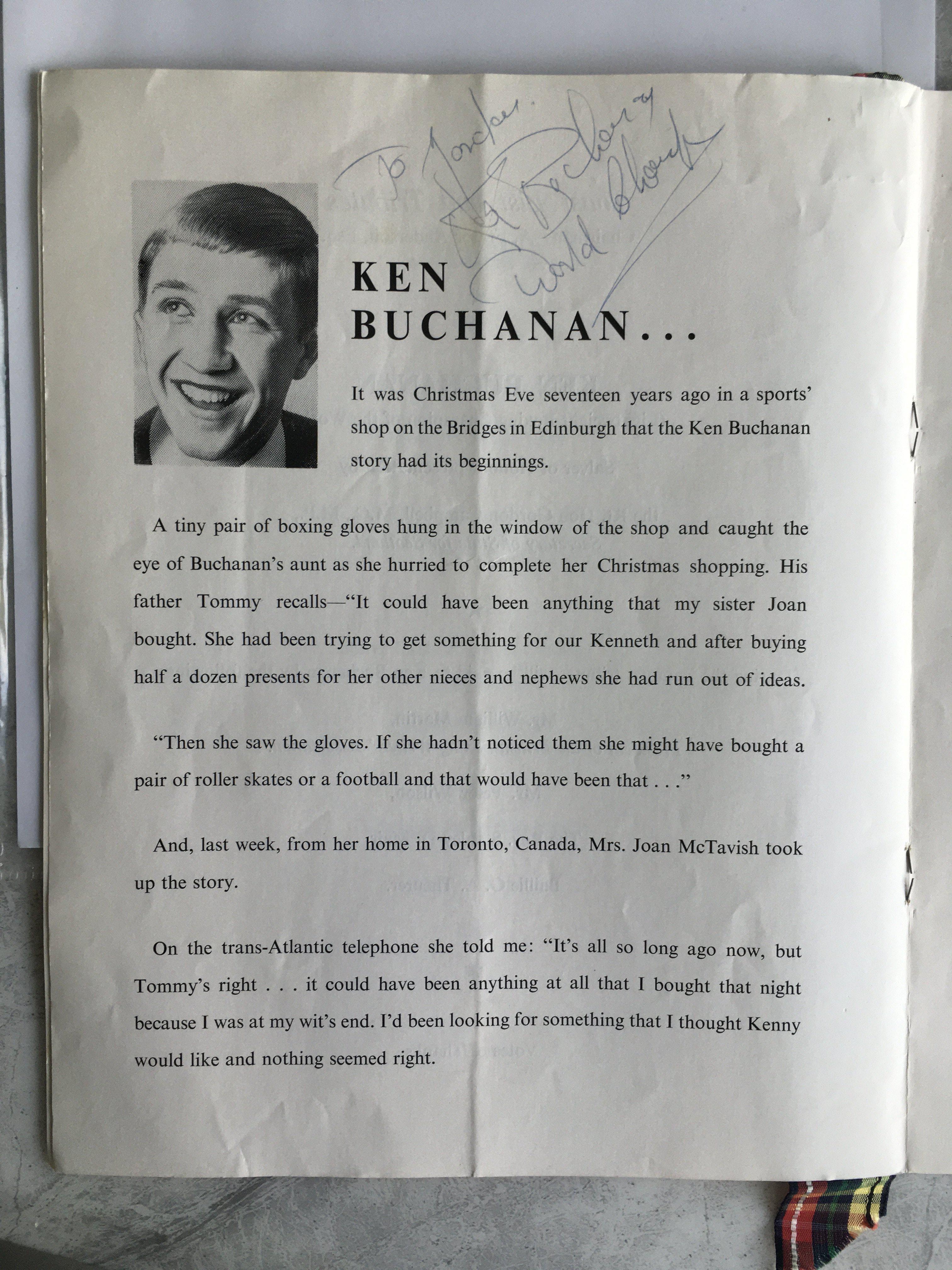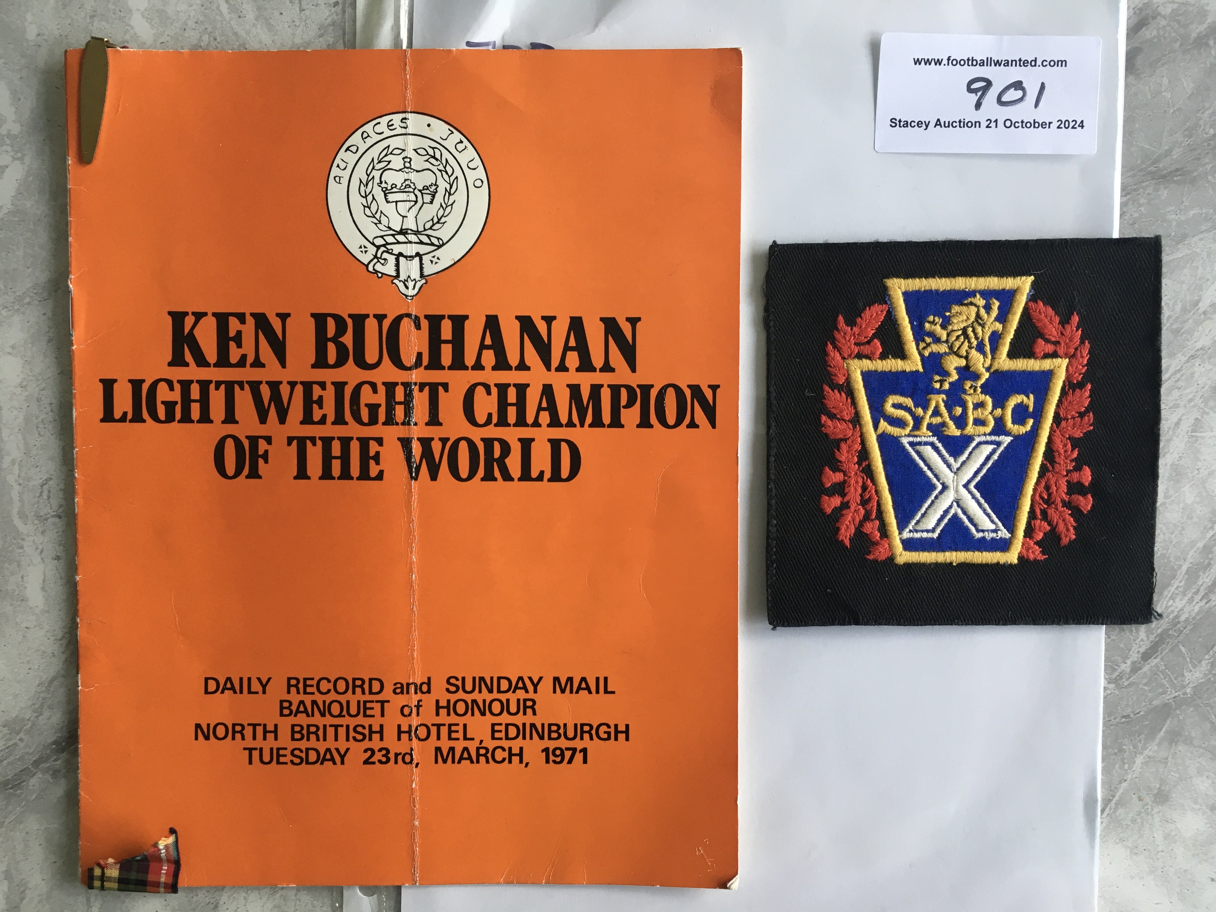 Ken Buchanan 1971Tribute Signed Boxing Menu: Folded banquet menu held by the Daily Record in honour of the lightweight champion of the world. Signed inside and dedicated. C/W a Scottish Amateur Boxing Club cloth badge that was designed to be sewn onto blazer.