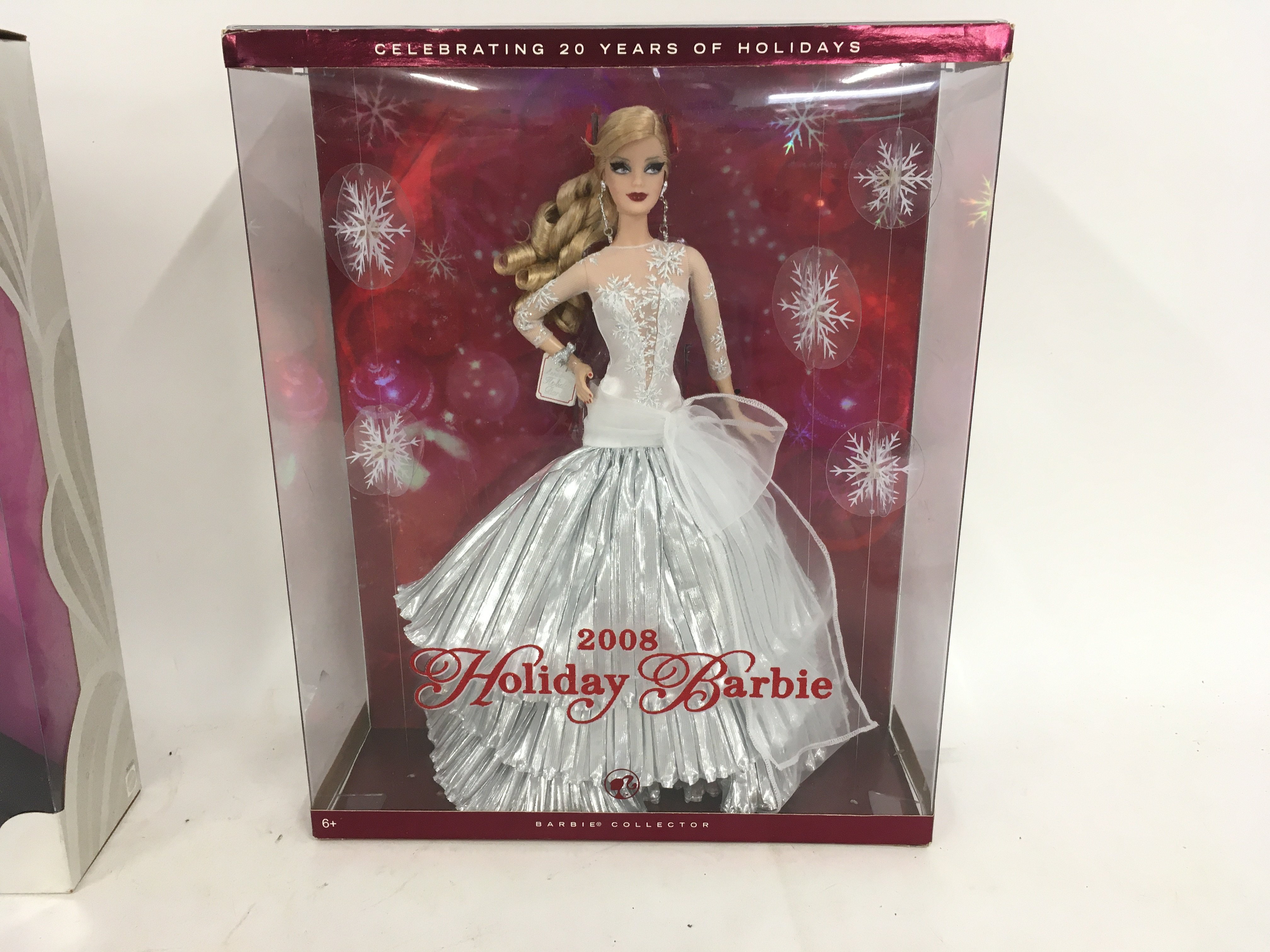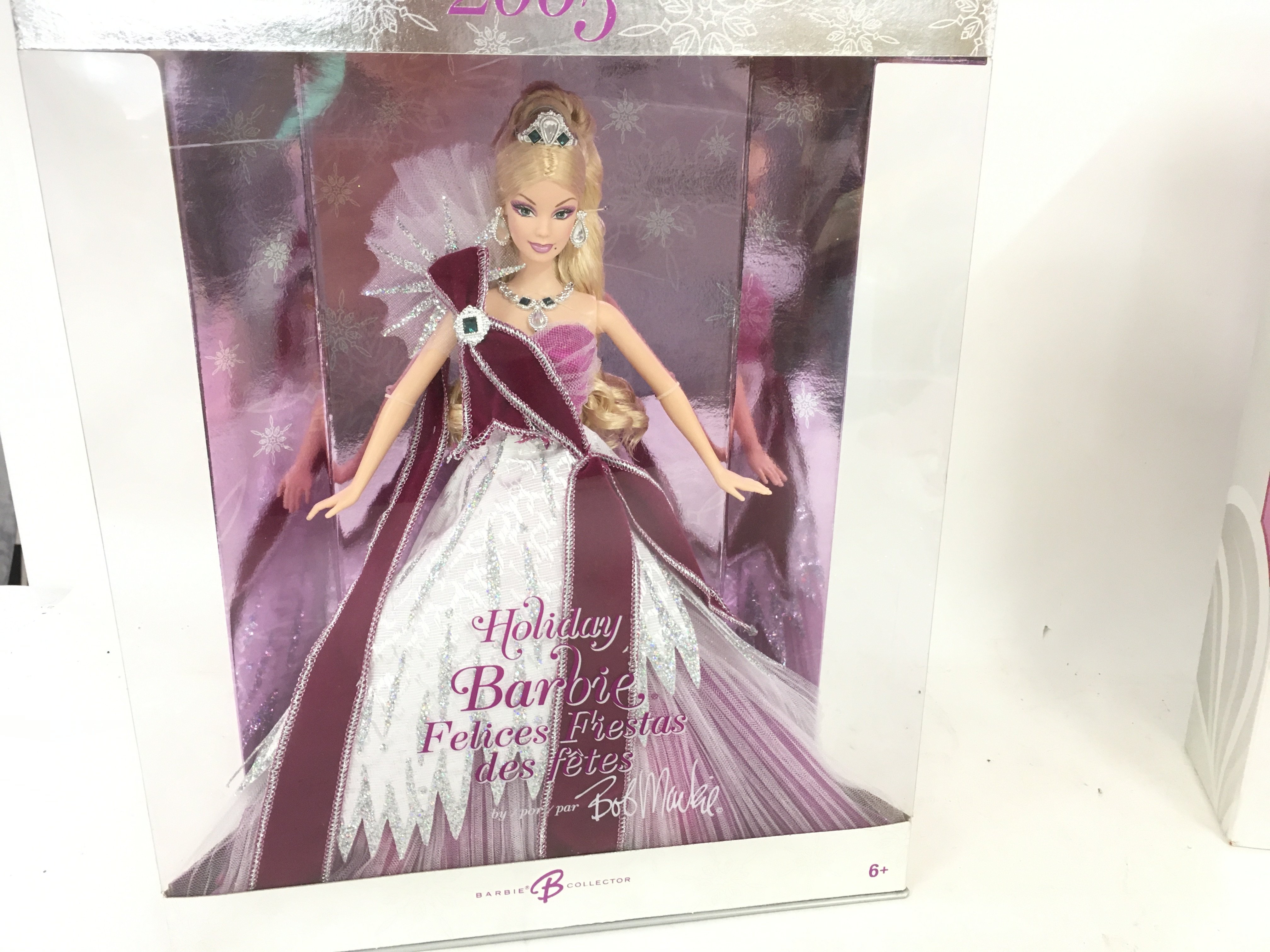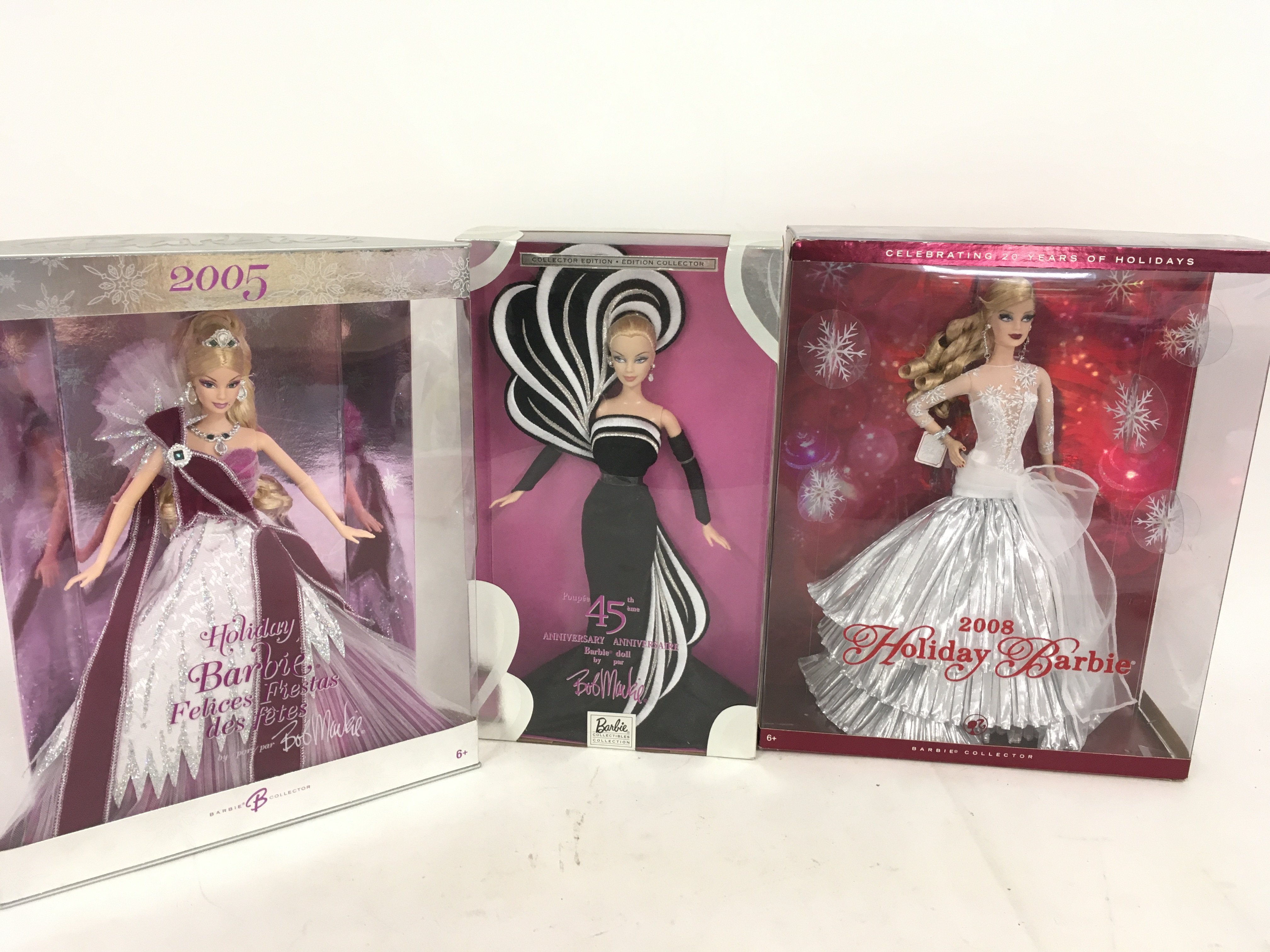 A collection of three boxed Barbie dolls featuring 2005 Holiday Barbie..2008 Holiday Barbie and 45th Anniversary Barbie (3)