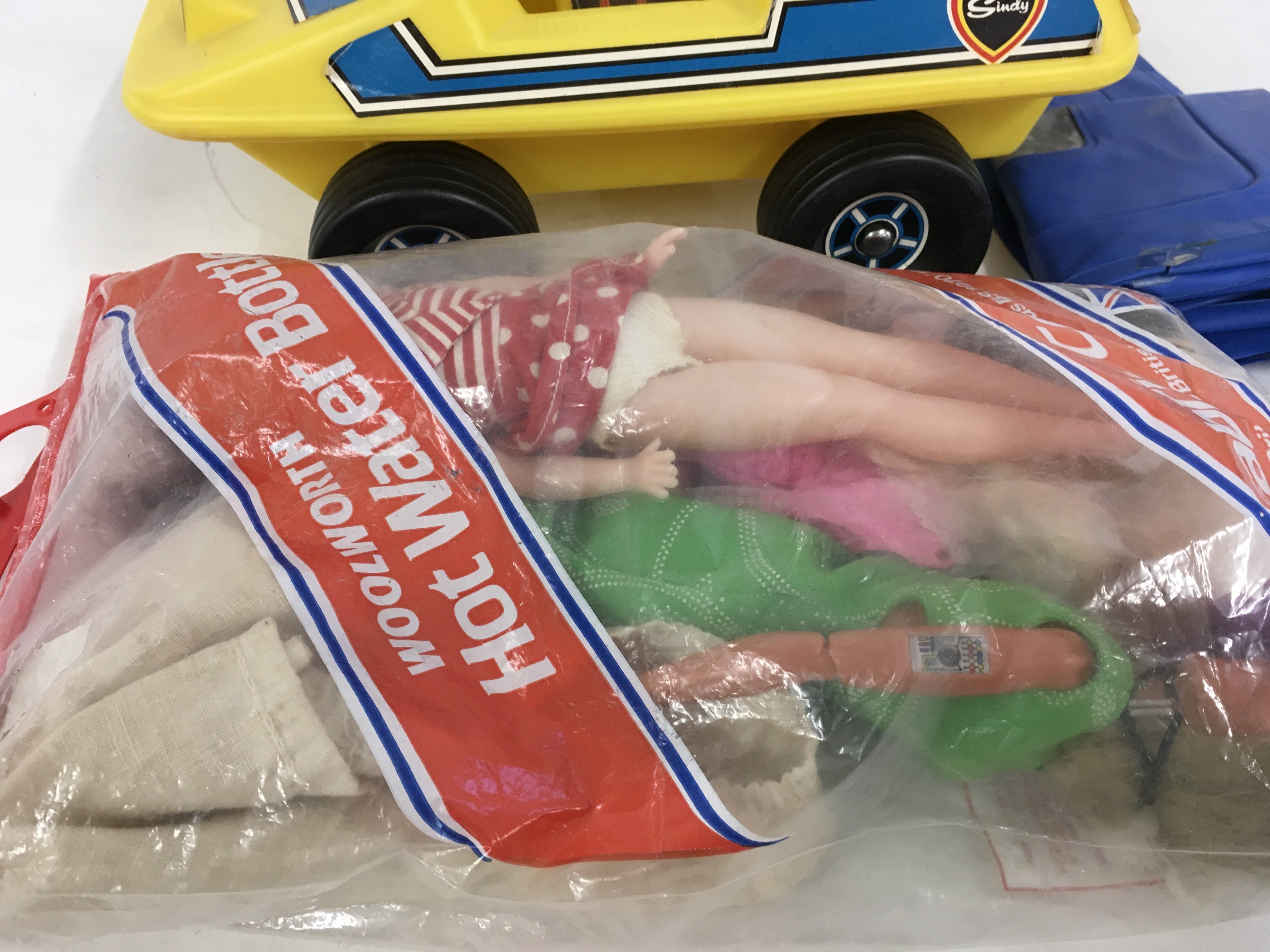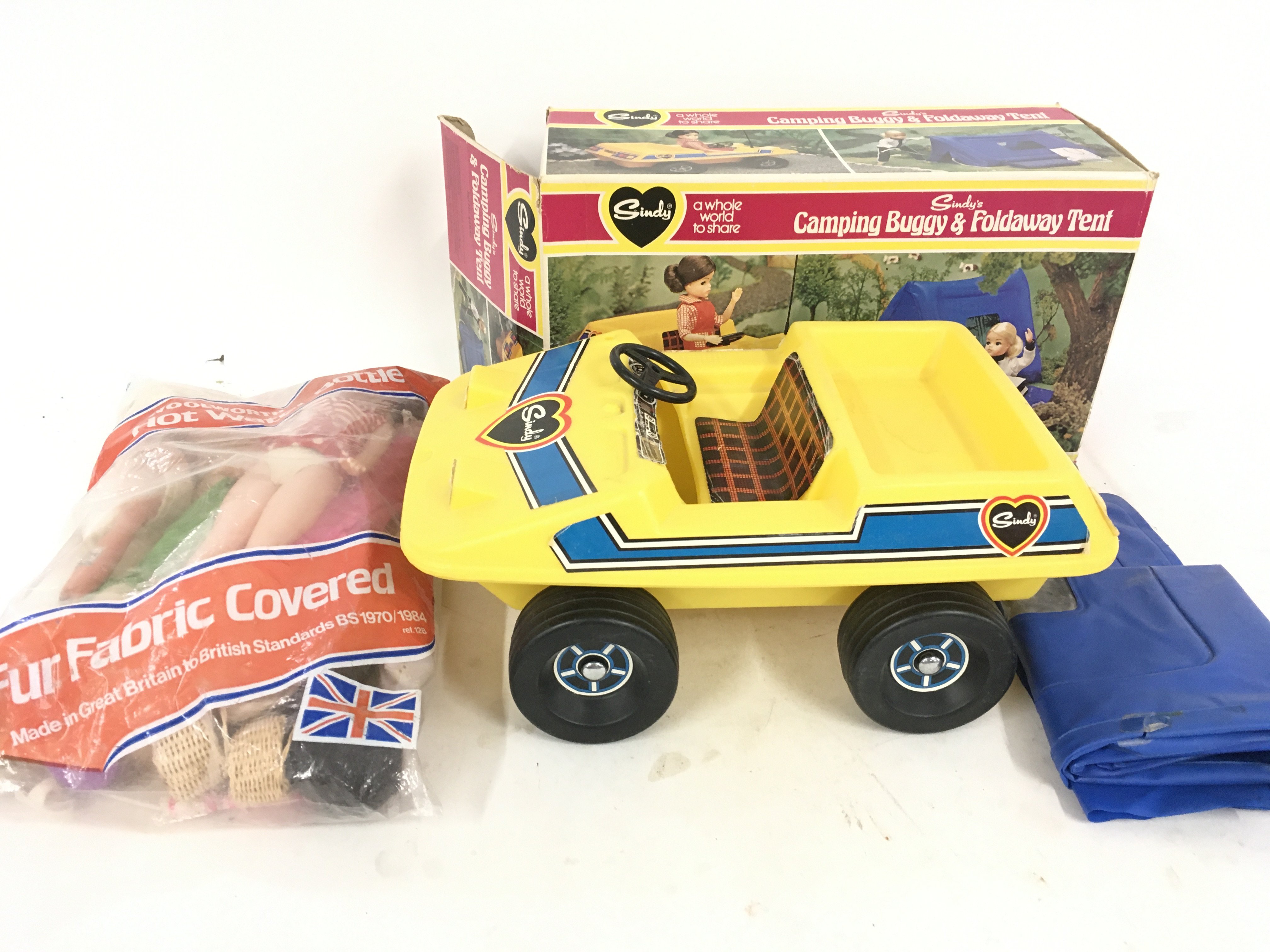 A boxed Sindy car and foldaway tent. A bag with dolls and accessories. (2)