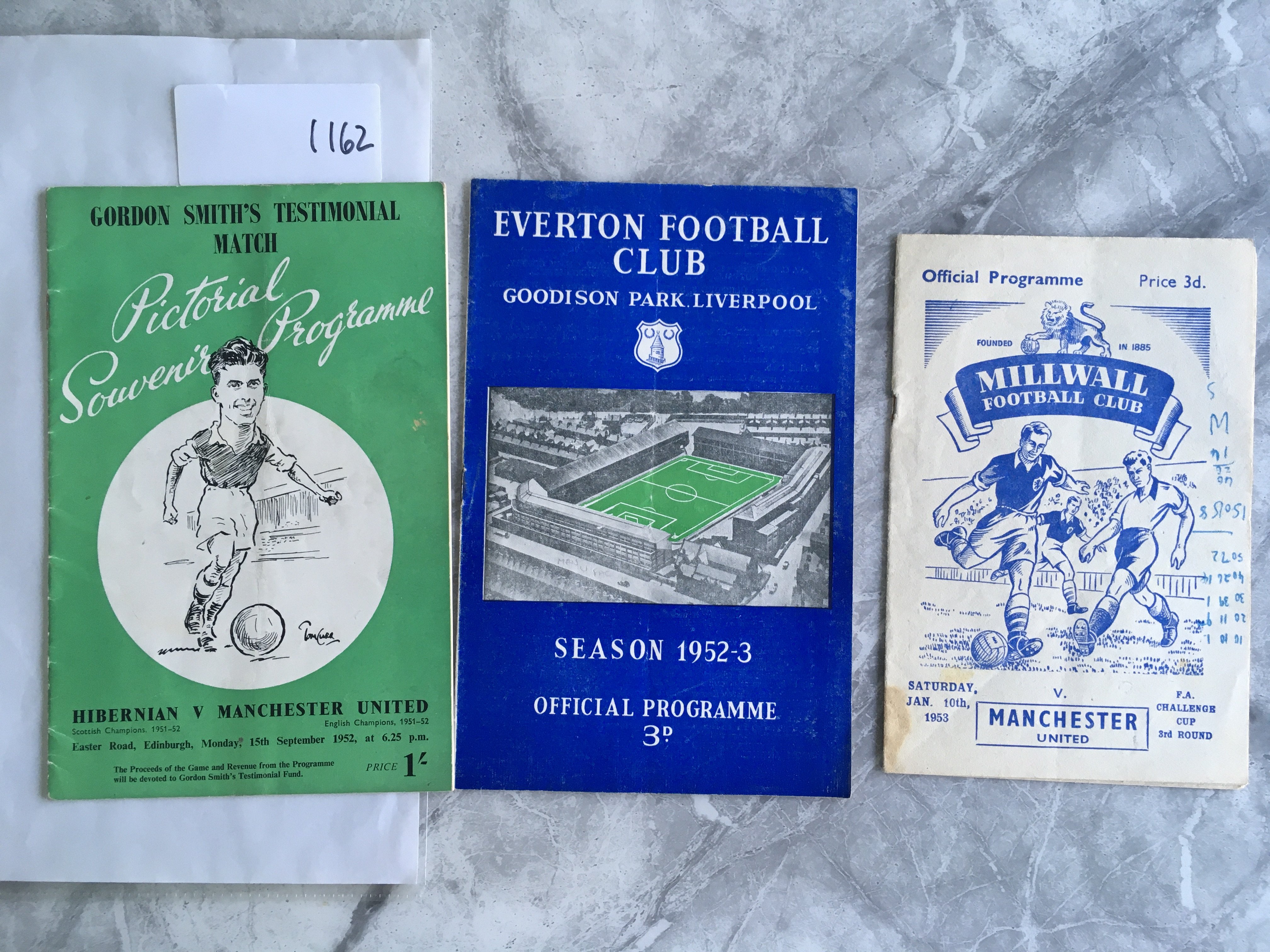 52/53 Manchester United Away Football Programmes: Hibernian Smith Tournament, Everton + Millwall both FA Cup. Good. (3)