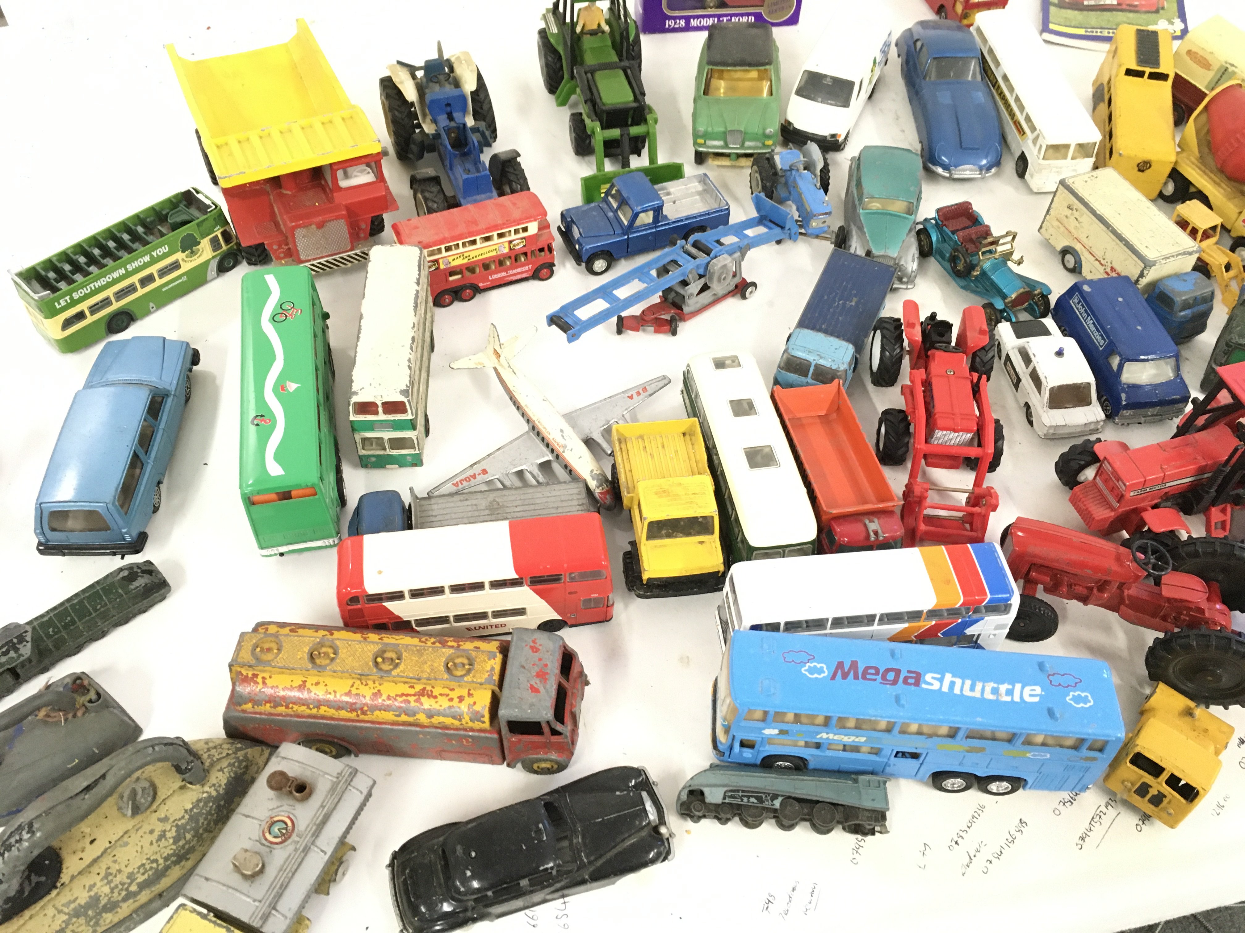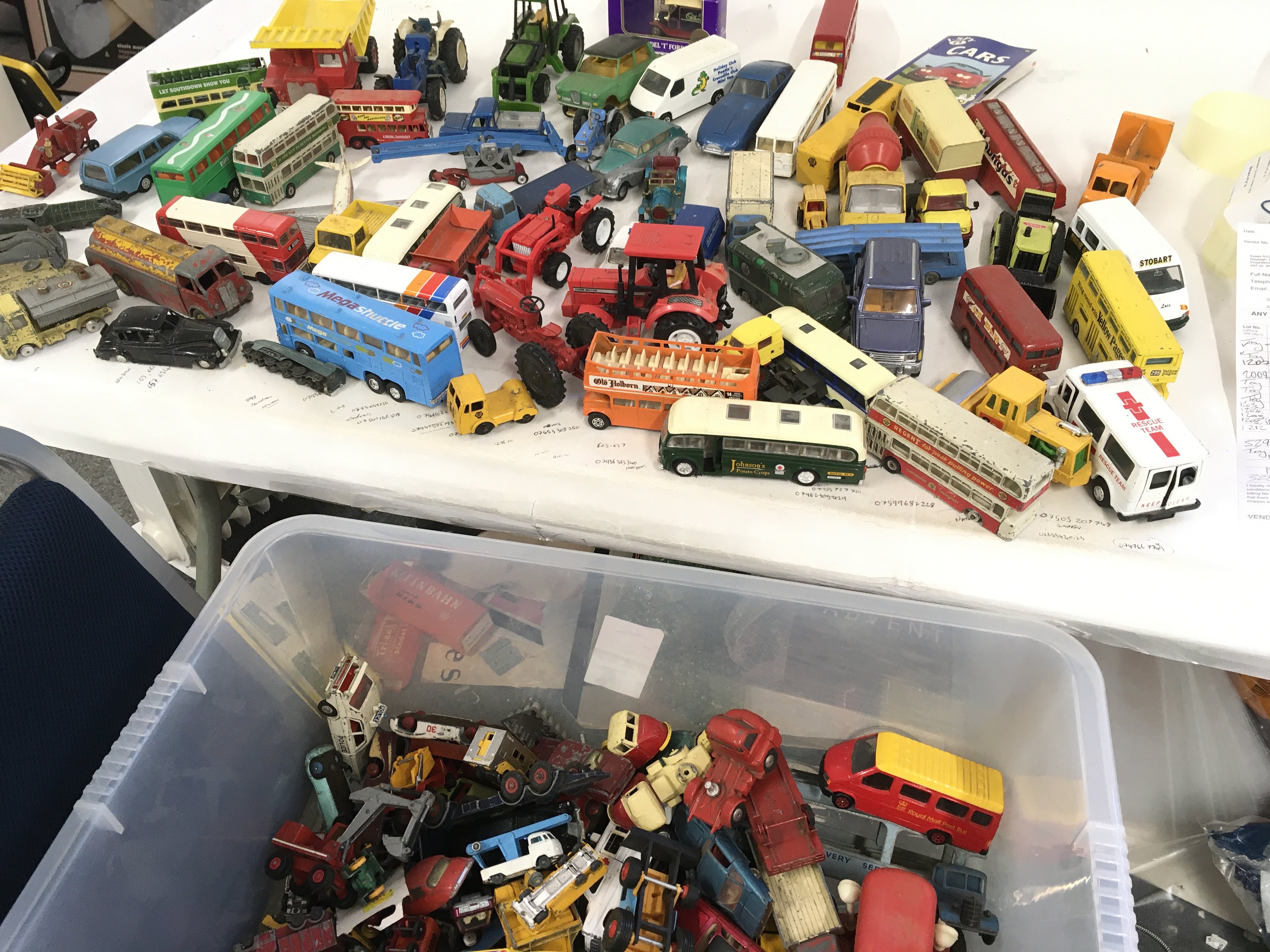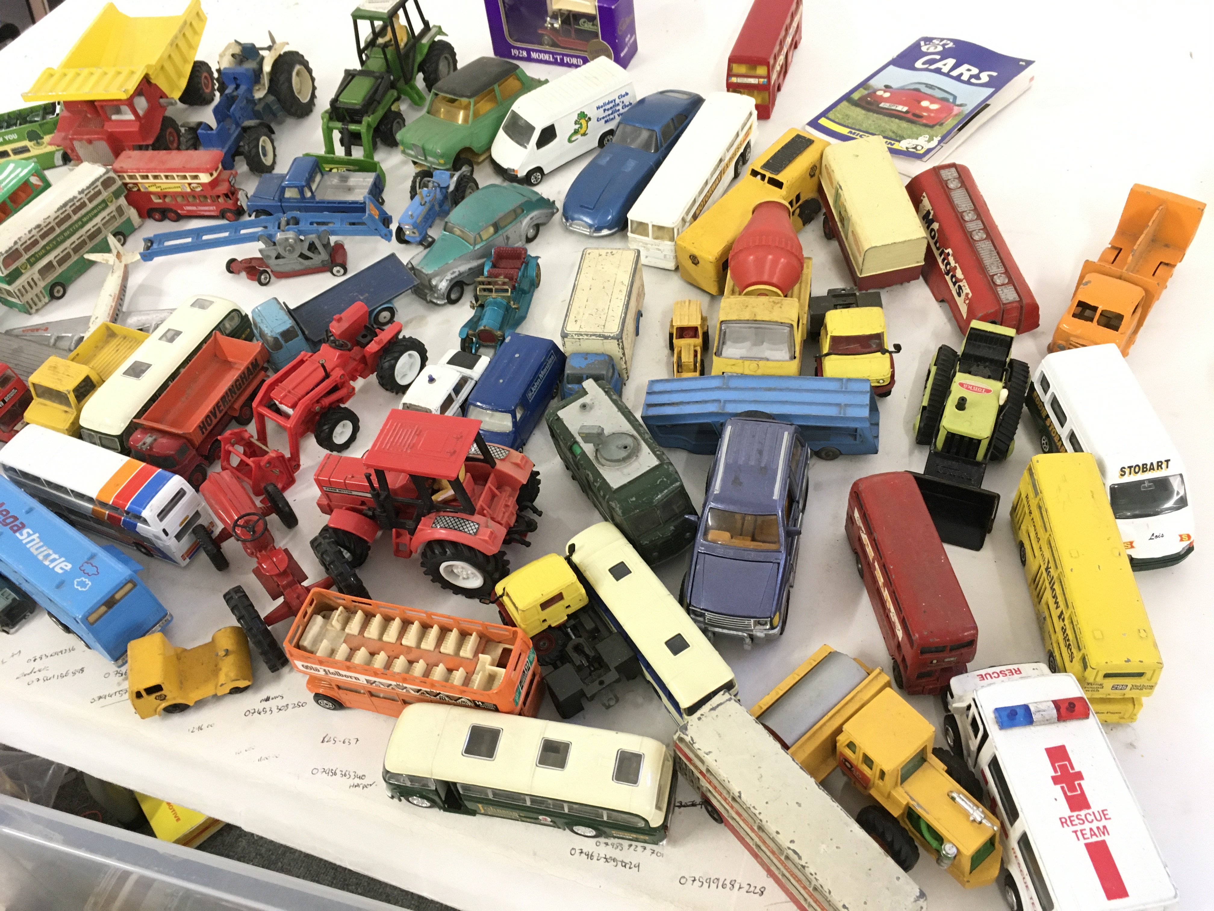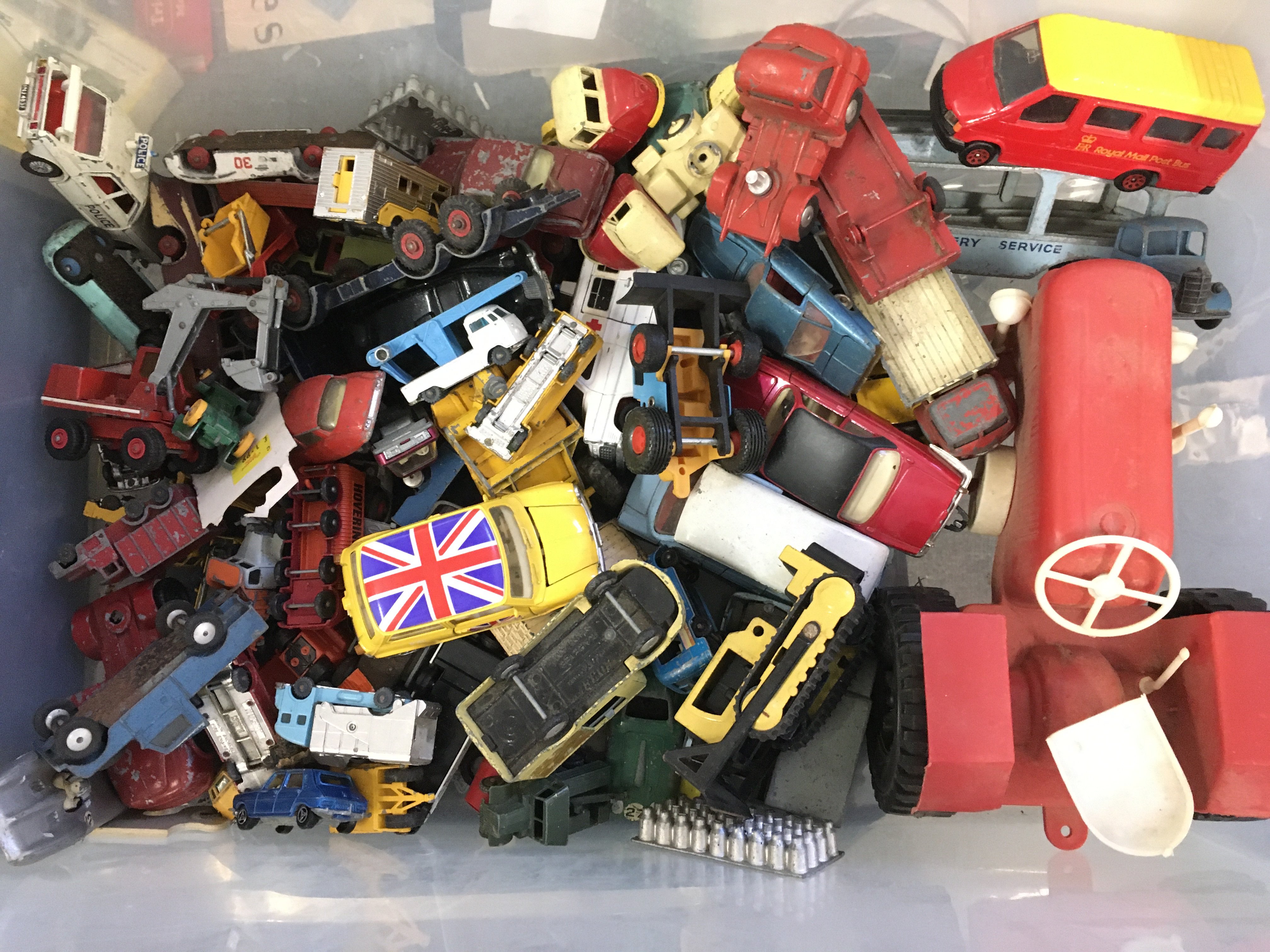 A large box contains a mixed lot of Playworn diecast model vehicles by various manufacturers.